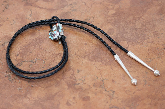 An authentic Zuni Native American Bolo Tie. The bolo tie is made of sterling silver, mother of pearl, onyx, coral, turquoise, and more. The cord is about 38". The bolo measures 1 1/8" in length and 1 1/8".