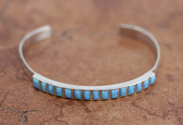 A brand new, very nice, authentic Zuni Native American bracelet. It is made from sterling silver and created opal. It is about 5 1/2" around and about 1/4" wide at the widest point. The opening is about 1 1/8" and partly flexible.