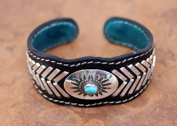 Navajo Leather Silver Turquoise Cuff Bracelet