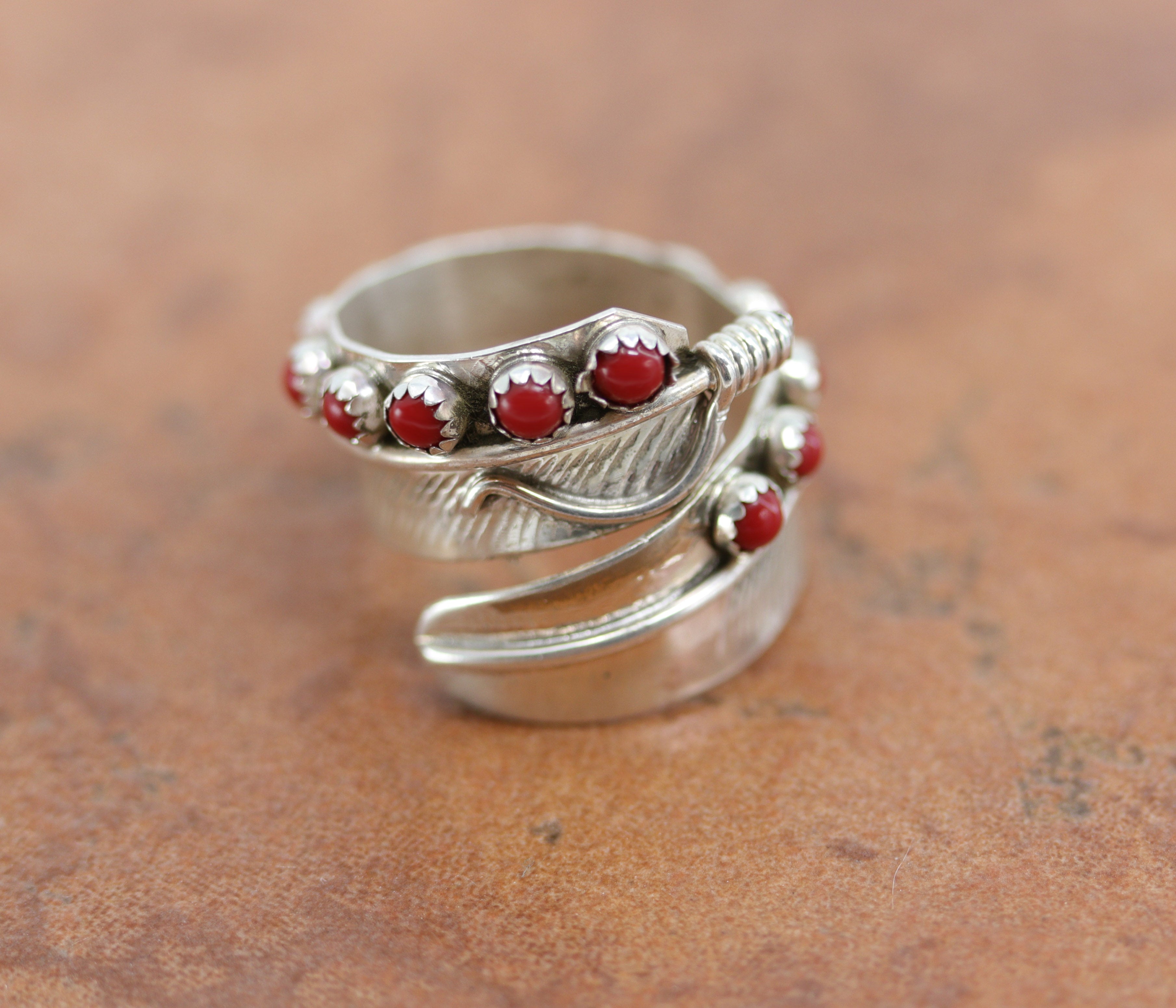 Navajo Native American ring by Charley. It is made from sterling silver and coral. The size is adjustable so it can fit sizes 6-9, and it is 3/4" at the widest point.
