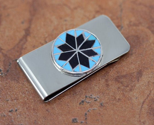 Zuni Native American money clip. It is made from sterling silver onyx, and turquoise. The lower part of the money clip is made from nickel to give it more durability. It is about 2 1/8" in length and 1" wide.
