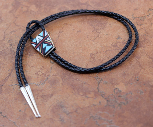 Authentic Zuni Native American Bolo Tie. The bolo tie is made of sterling silver, mother of pearl, onyx, coral, turquoise, and more. The cord is about 38". The bolo measures 1" by 1 1/4".