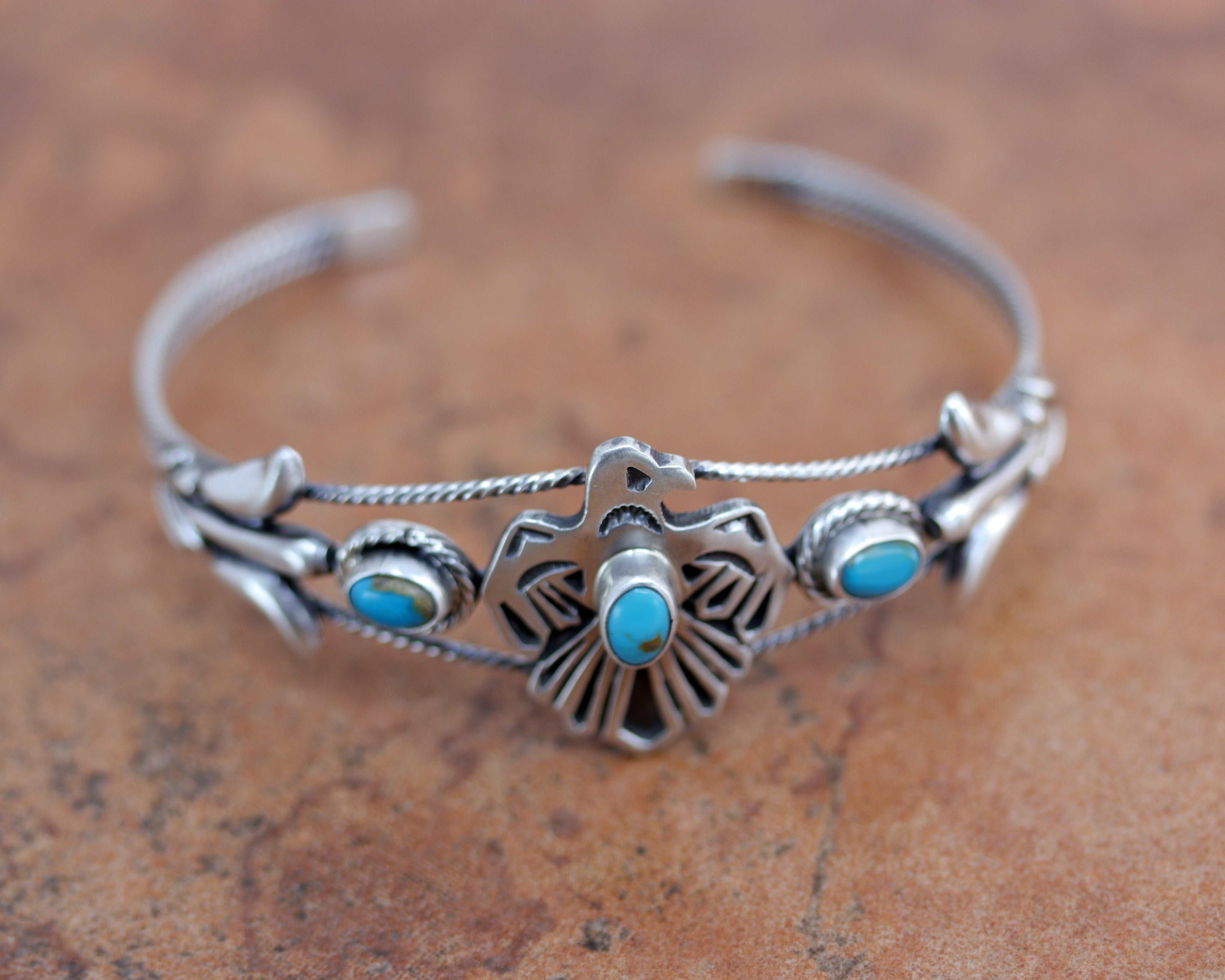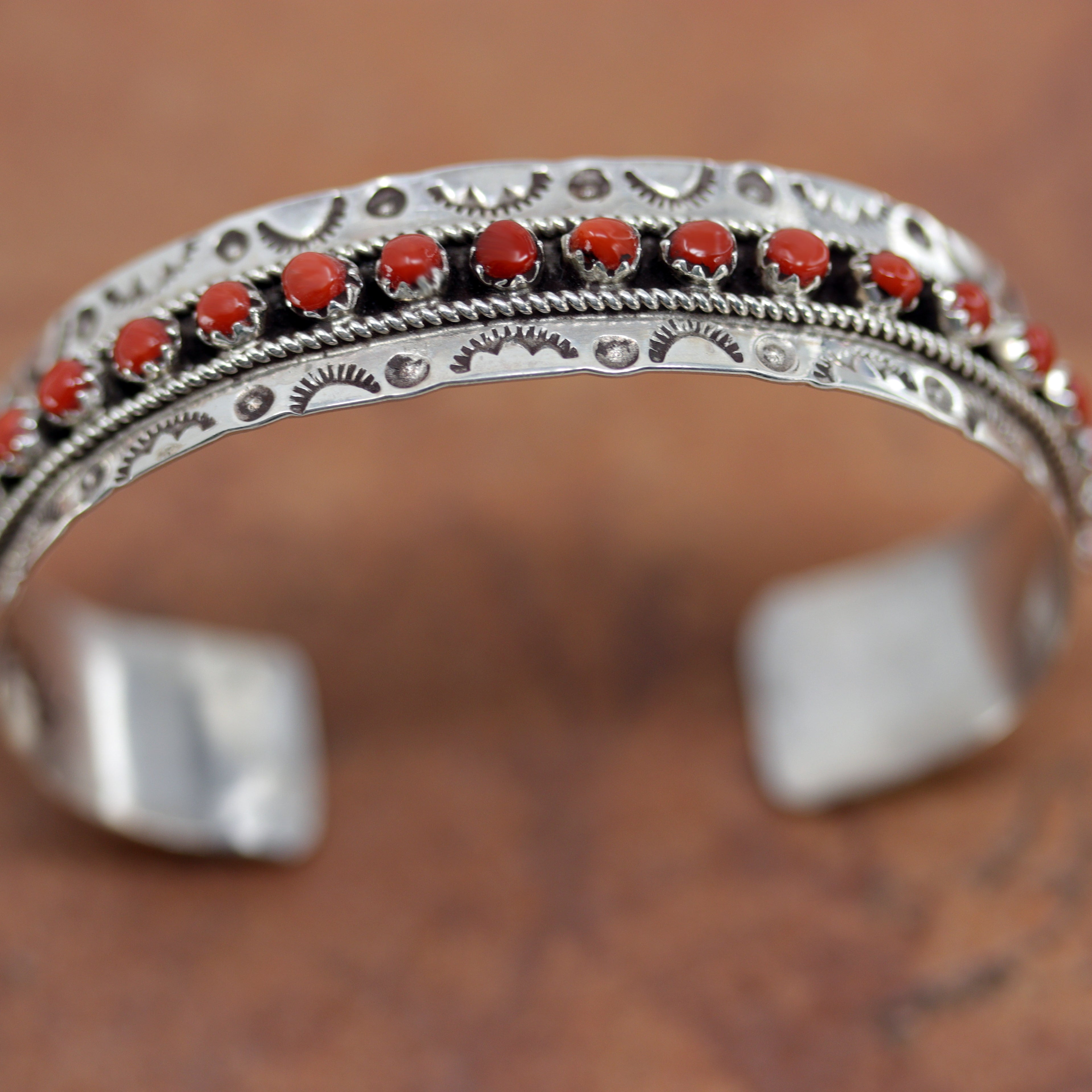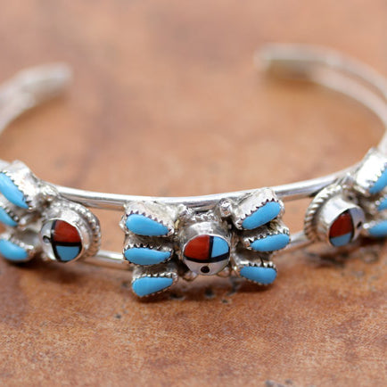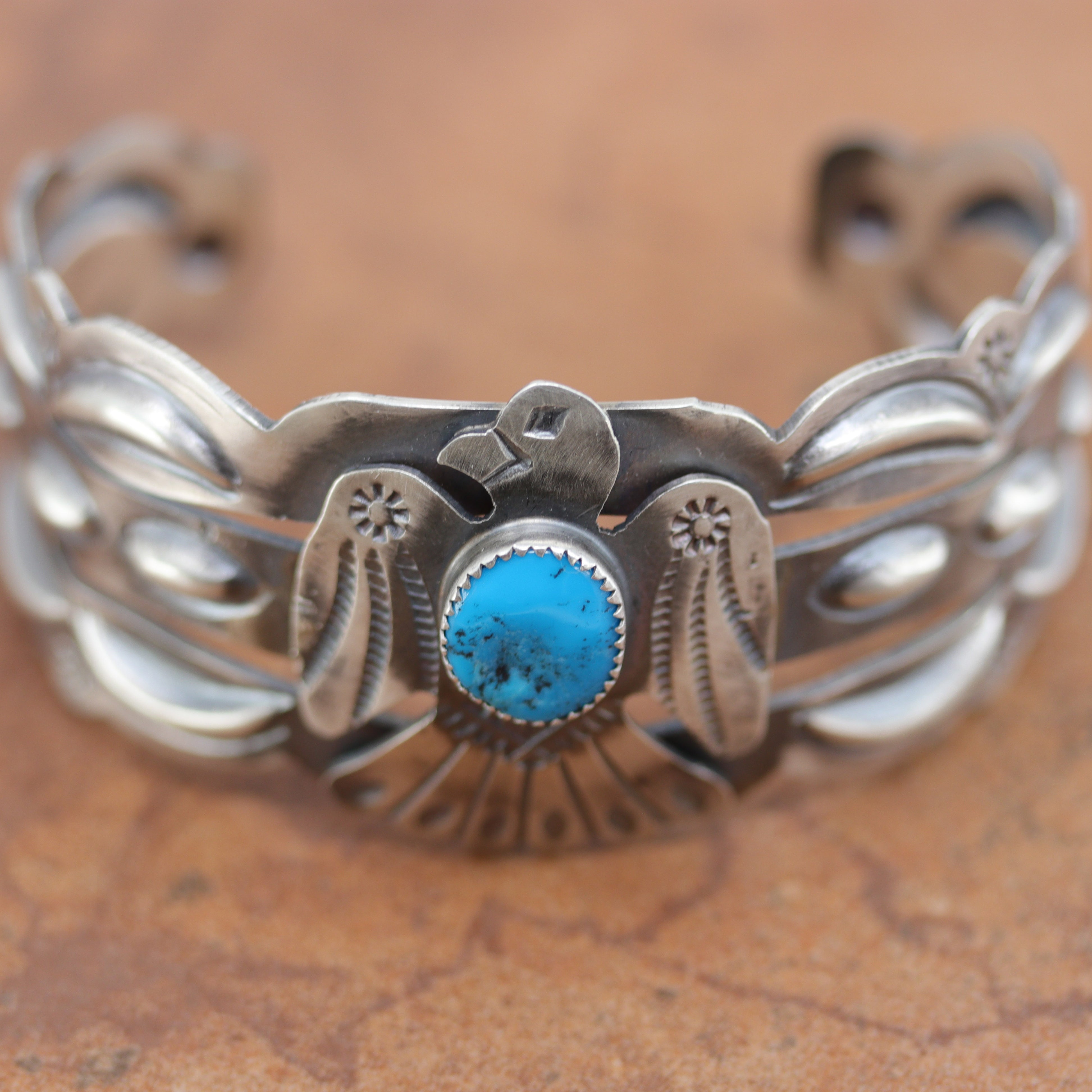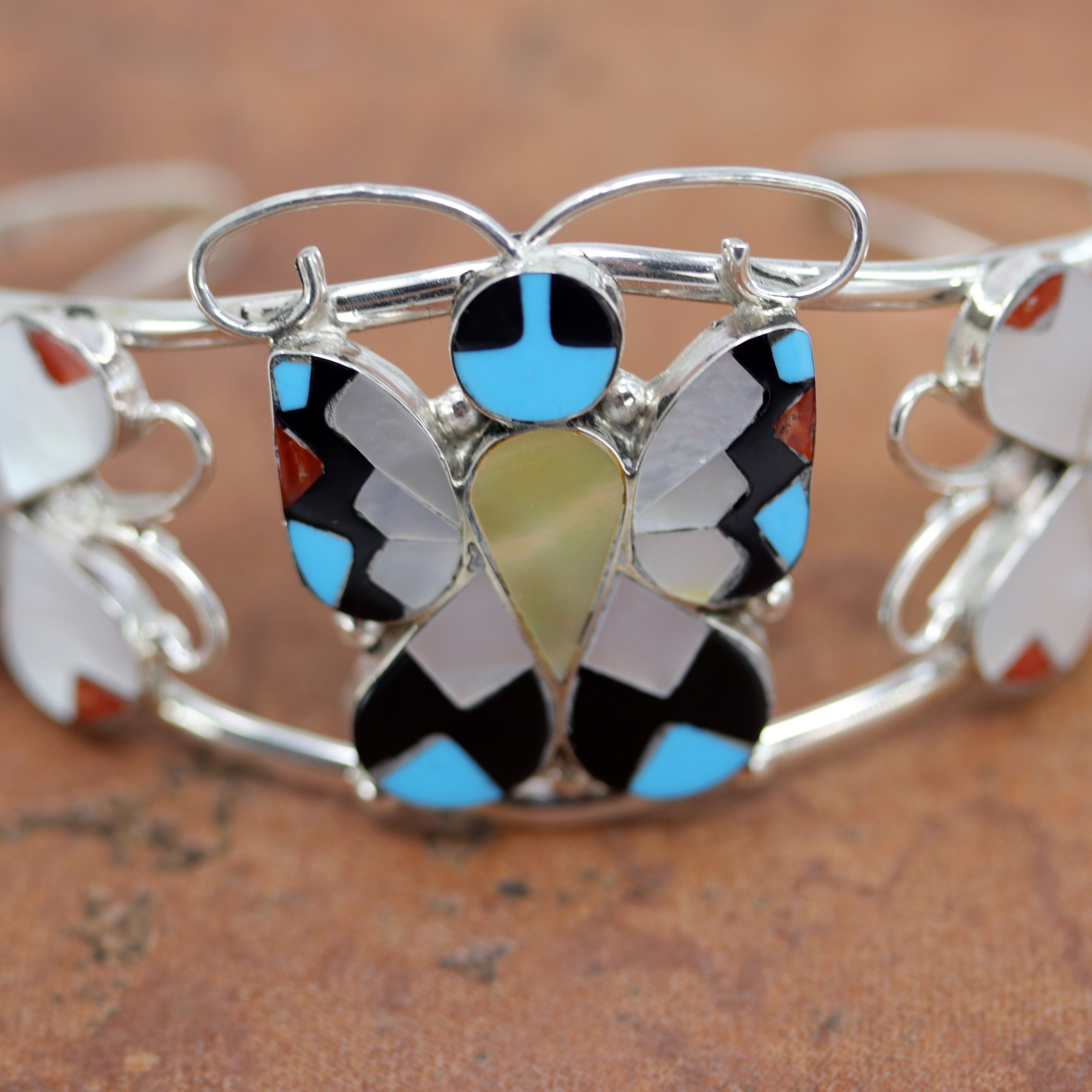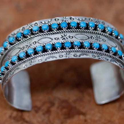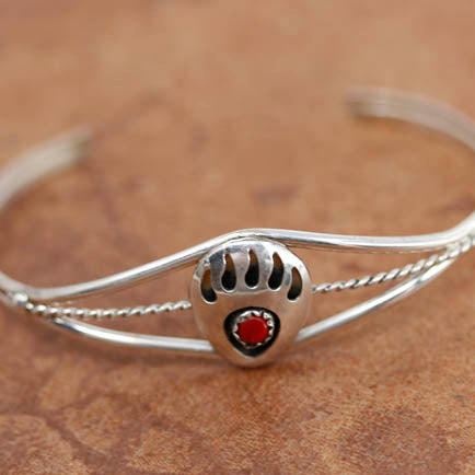 We are proud to offer a large selection of bracelets. We offer Navajo, Zuni, Native American, and Southwest designs. Our sterling silver bracelets feature stones like turquoise, coral, howlite, tiger eye, amethyst, mother of pearl, onyx, malachite, spiny oyster and many more with some that are enhanced with gold overlay. We carry many styles such as; cluster, cuff, beaded, link, inlay, multi-stone, story teller, Zia, eagle, leather, bangle, feather, nugget, bear paw, heart, and one size fits all.