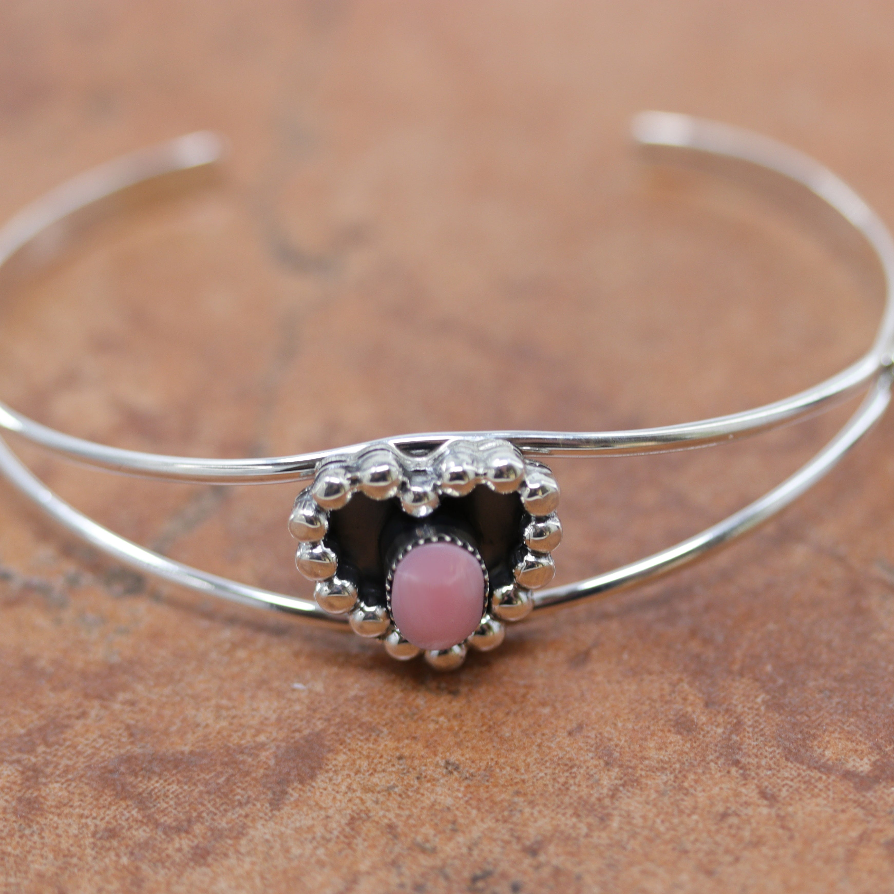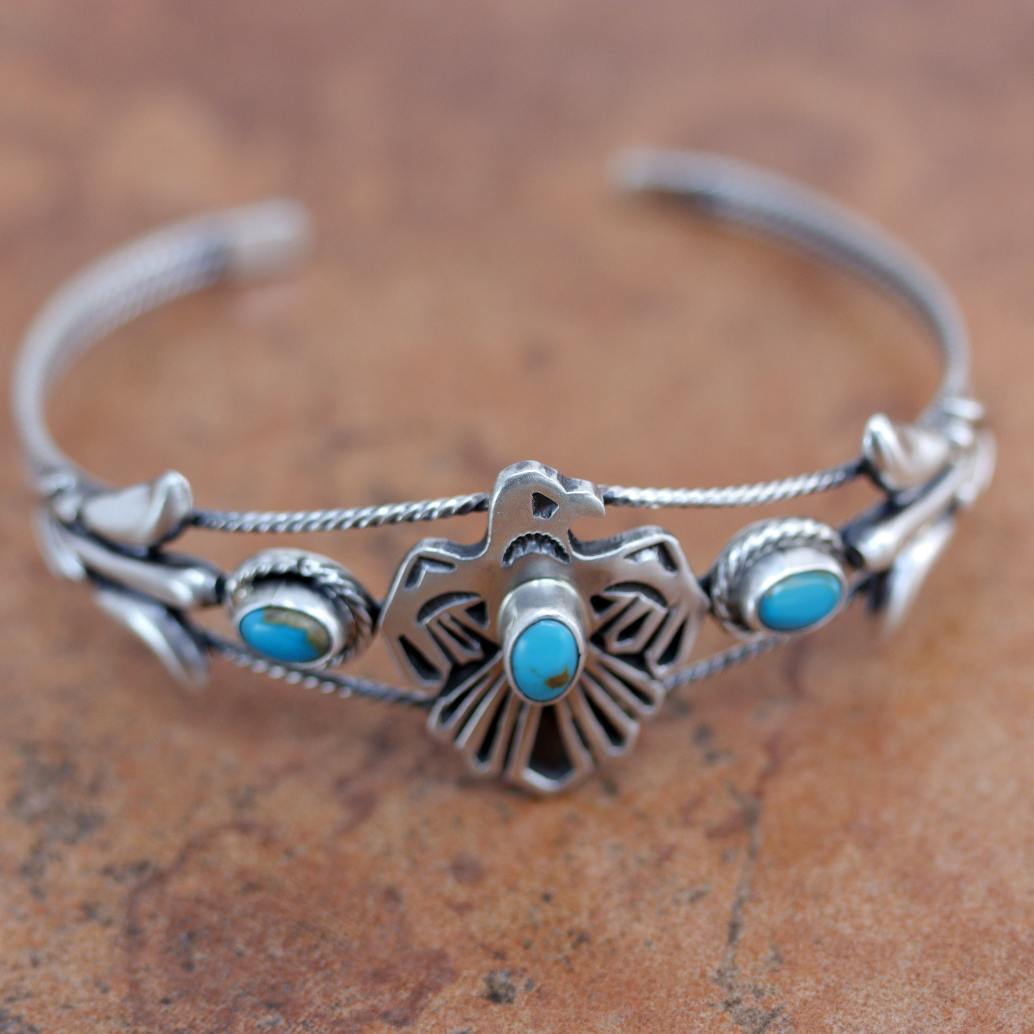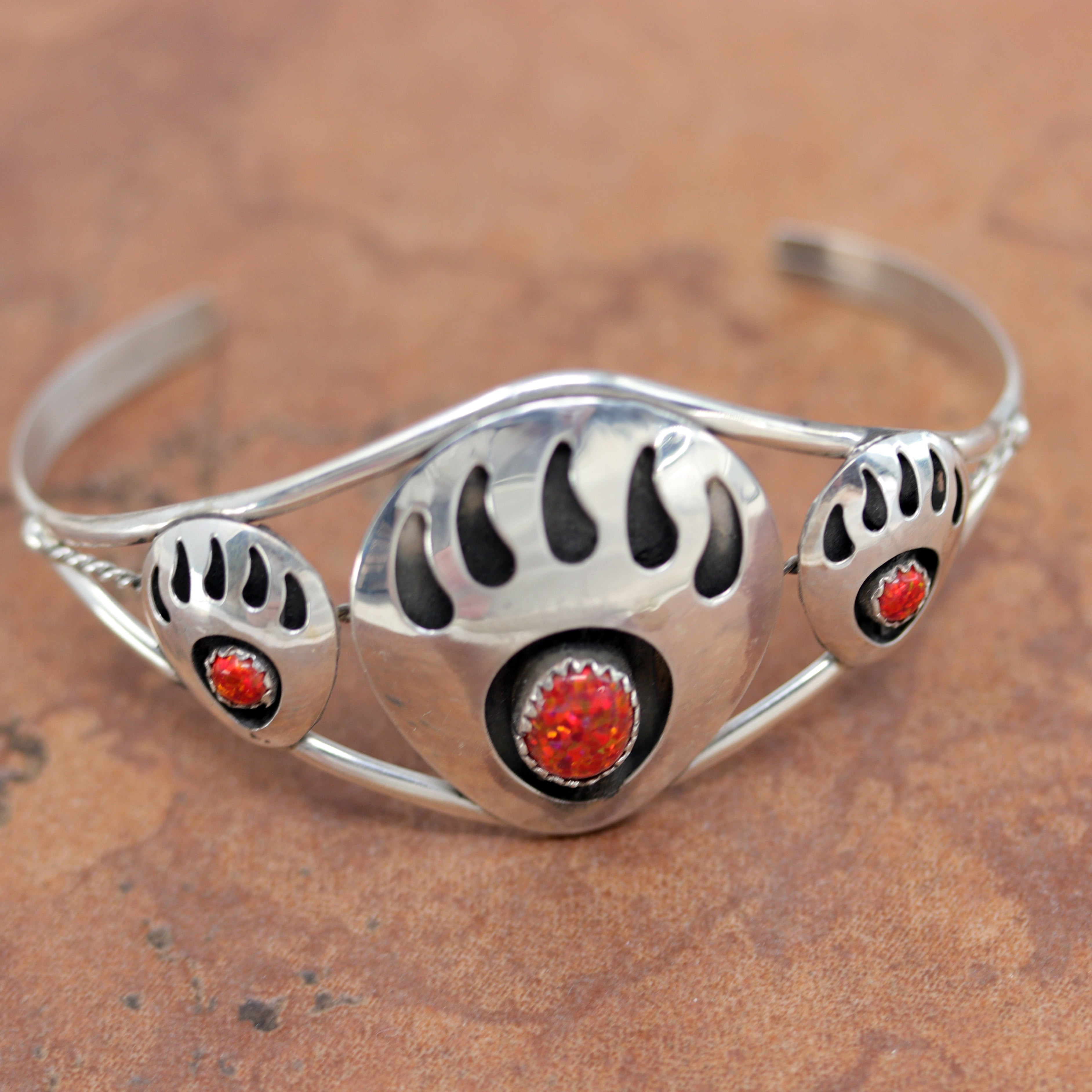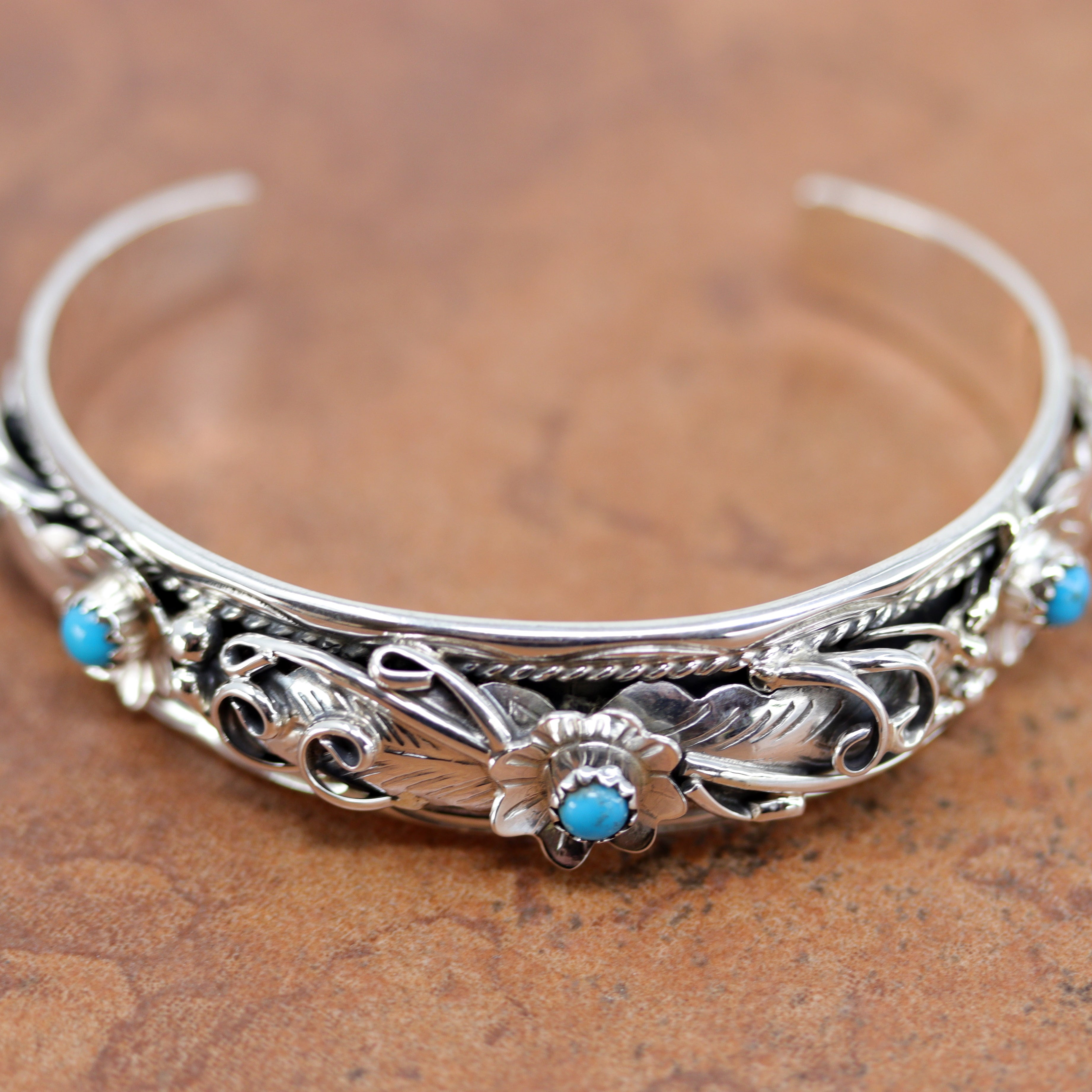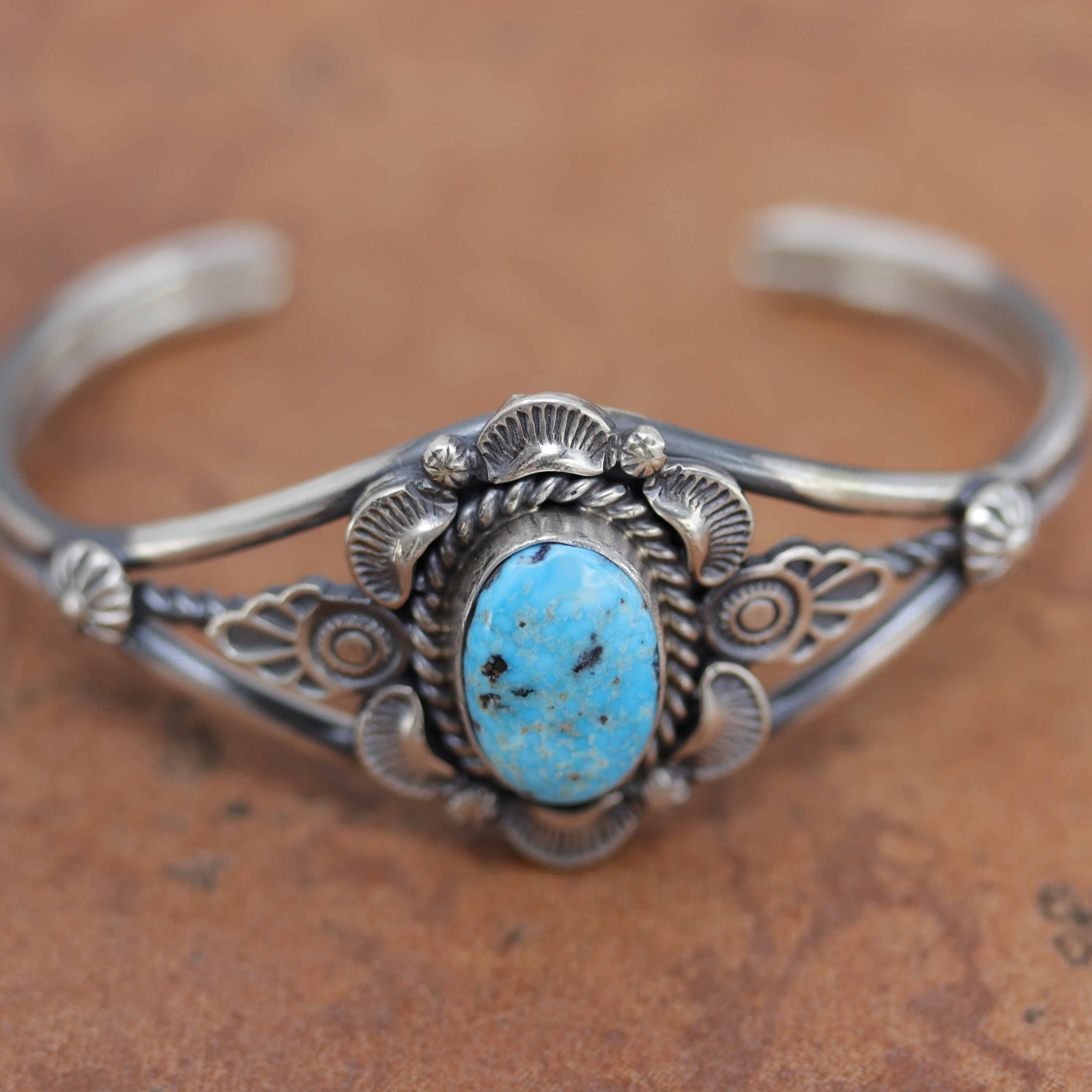 We are proud to offer a large selection of bracelets. We offer Navajo, Zuni, Native American, and Southwest designs. Our sterling silver bracelets feature stones like turquoise, coral, howlite, tiger eye, amethyst, mother of pearl, onyx, malachite, spiny oyster and many more with some that are enhanced with gold overlay. We carry many styles such as; cluster, cuff, beaded, link, inlay, multi-stone, story teller, Zia, eagle, leather, bangle, feather, nugget, bear paw, heart, and one size fits all.