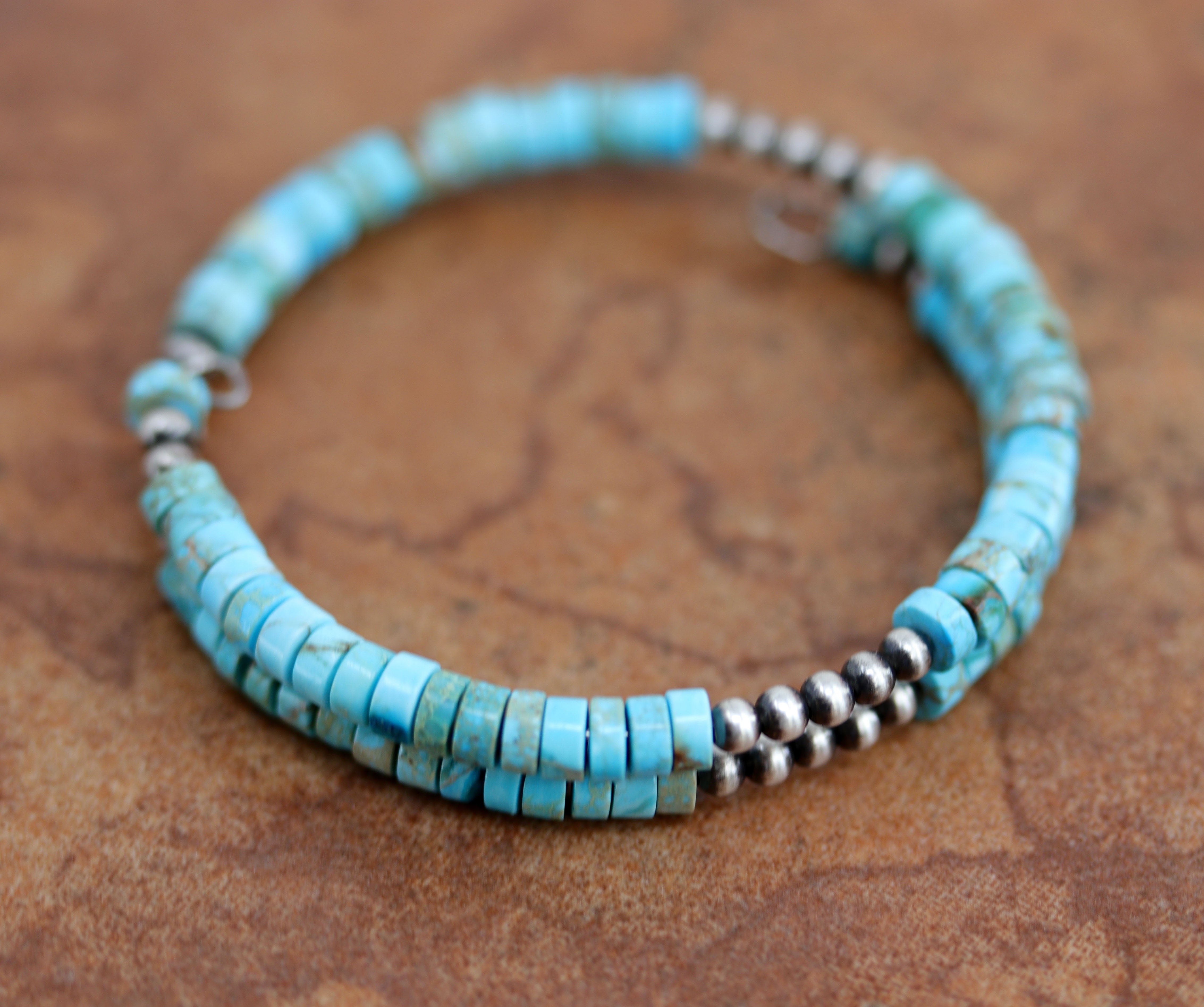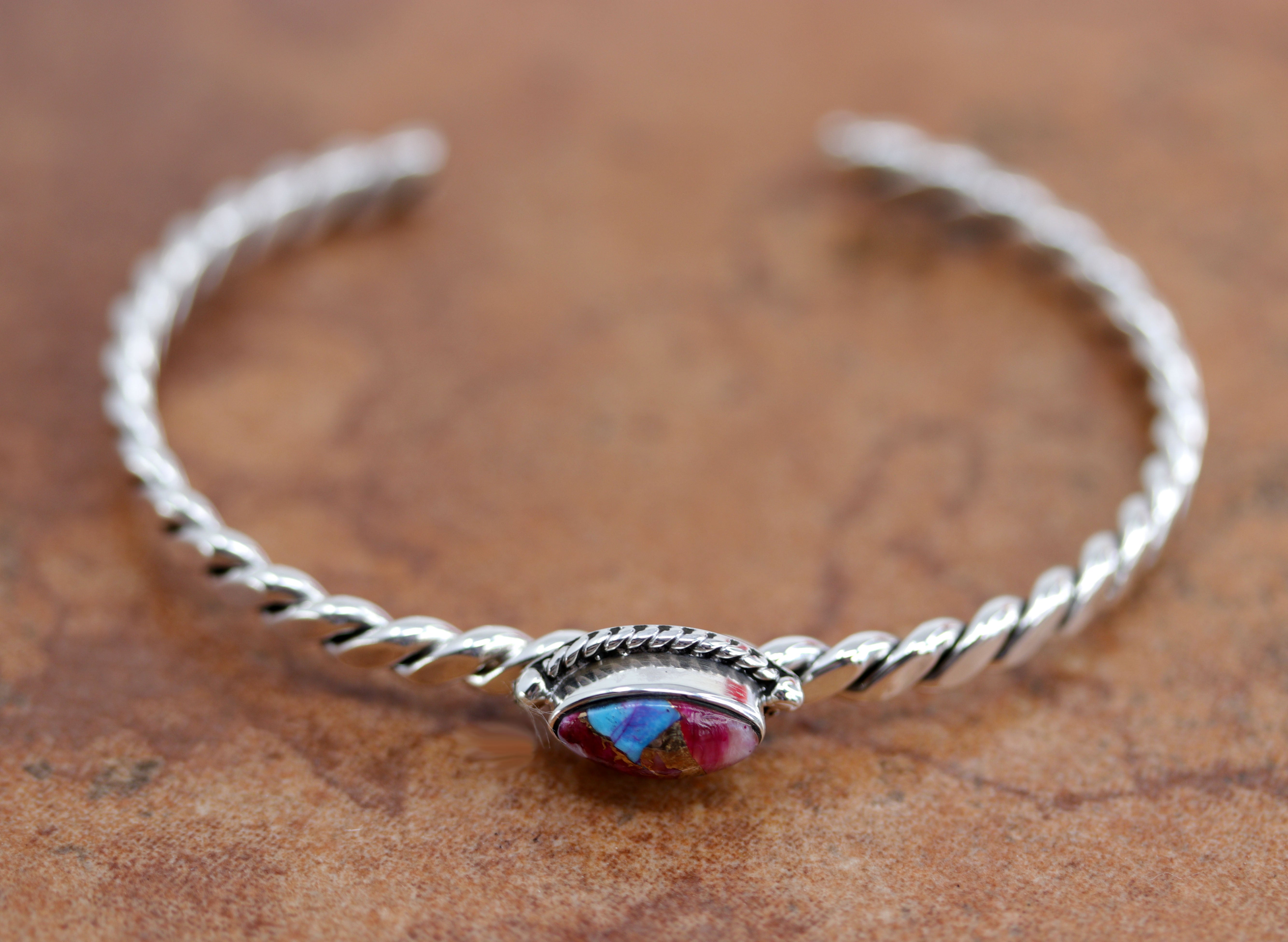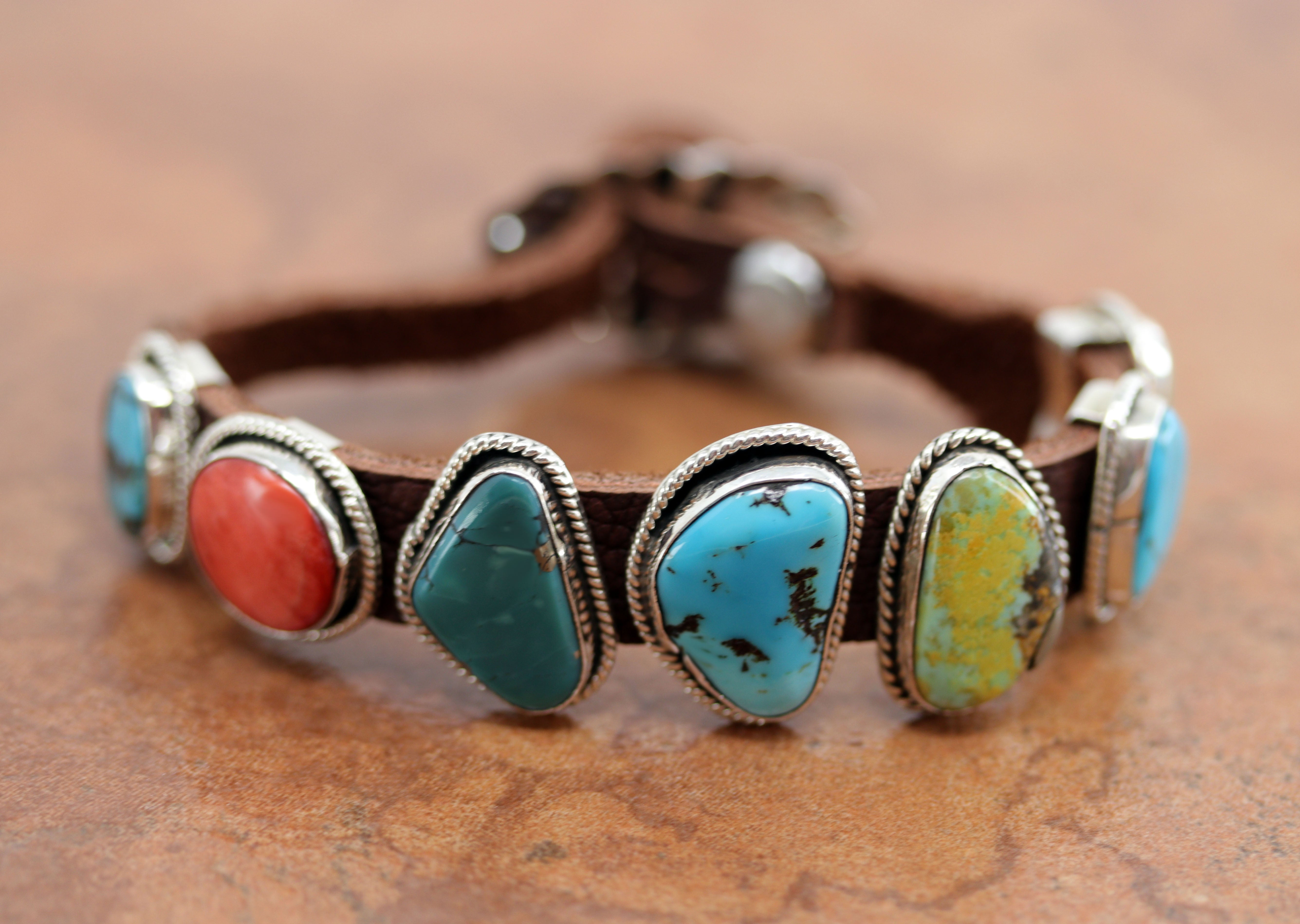 We are proud to offer a large selection of bracelets. We offer Navajo, Zuni, Native American, and Southwest designs. Our sterling silver bracelets feature stones like turquoise, coral, howlite, tiger eye, amethyst, mother of pearl, onyx, malachite, spiny oyster and many more with some that are enhanced with gold overlay. We carry many styles such as; cluster, cuff, beaded, link, inlay, multi-stone, story teller, Zia, eagle, leather, bangle, feather, nugget, bear paw, heart, and one size fits all.
