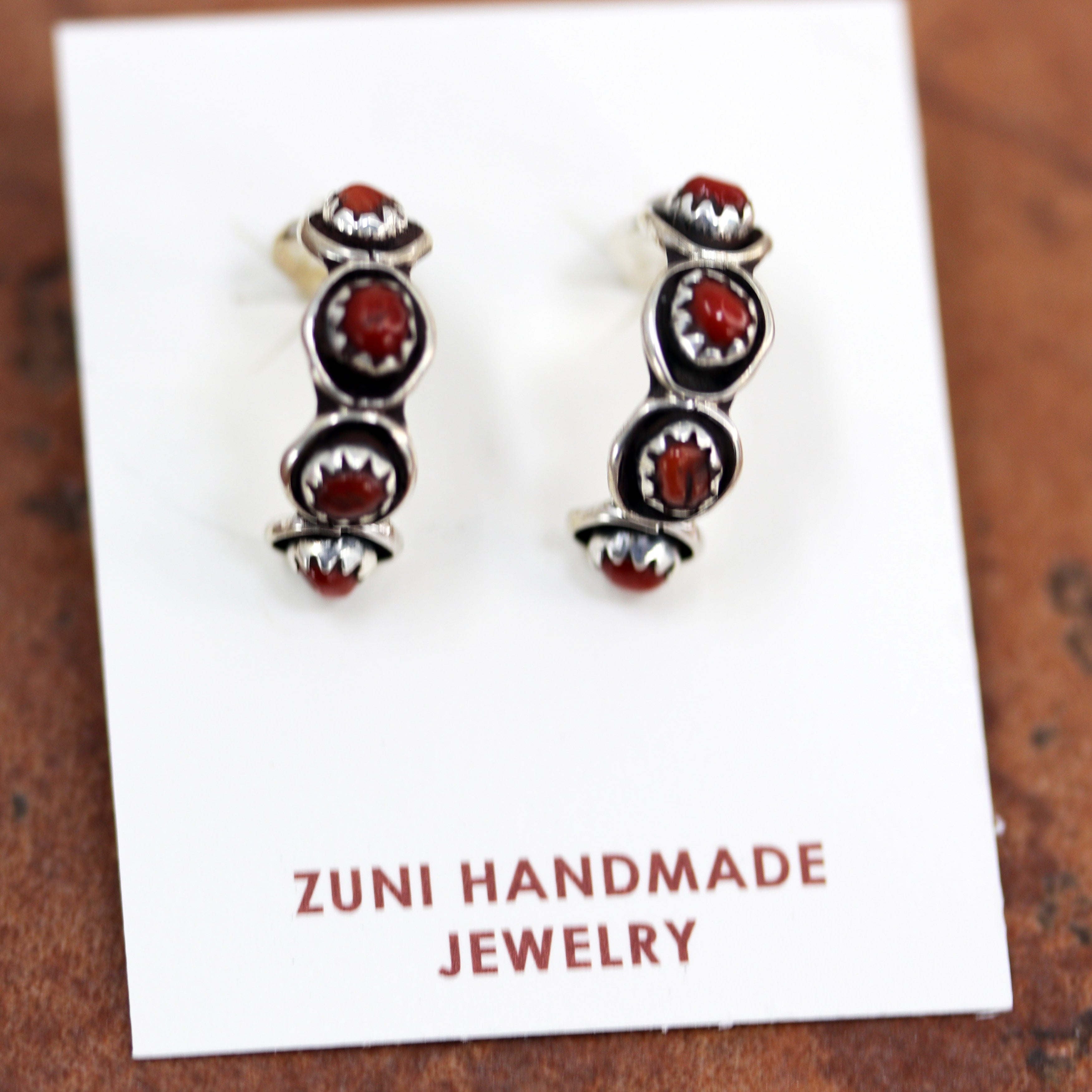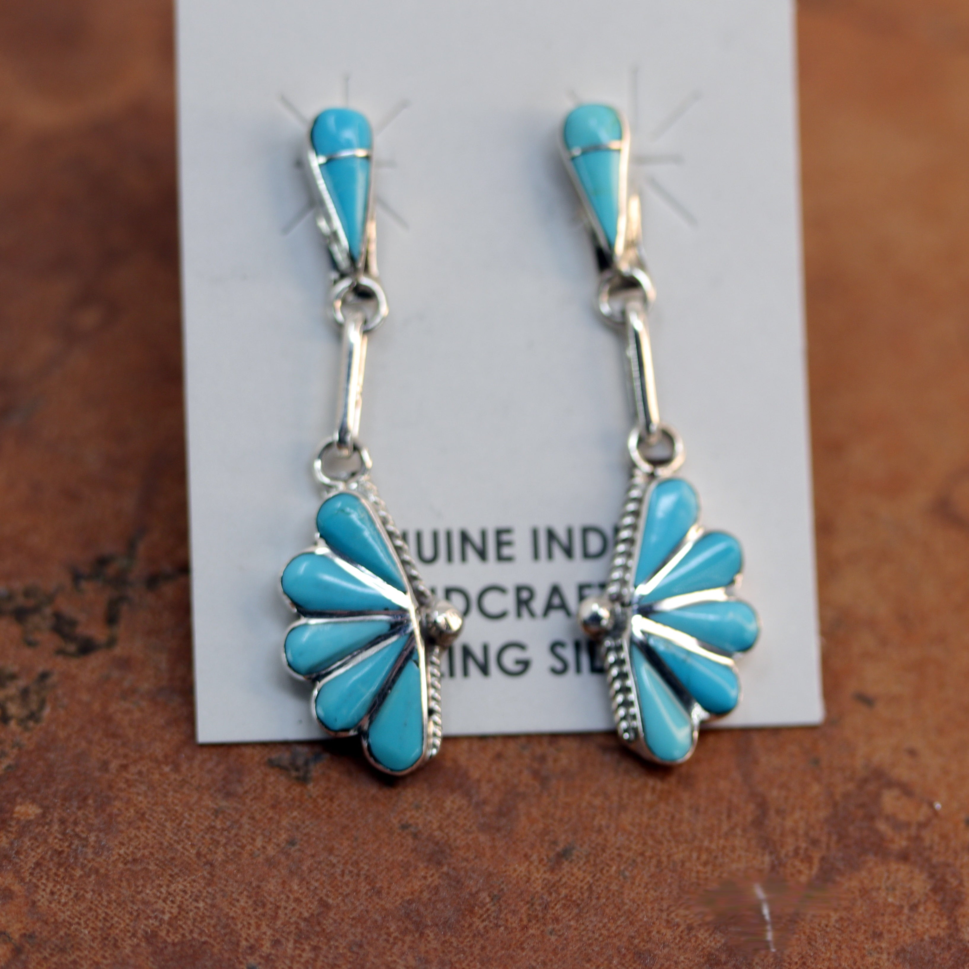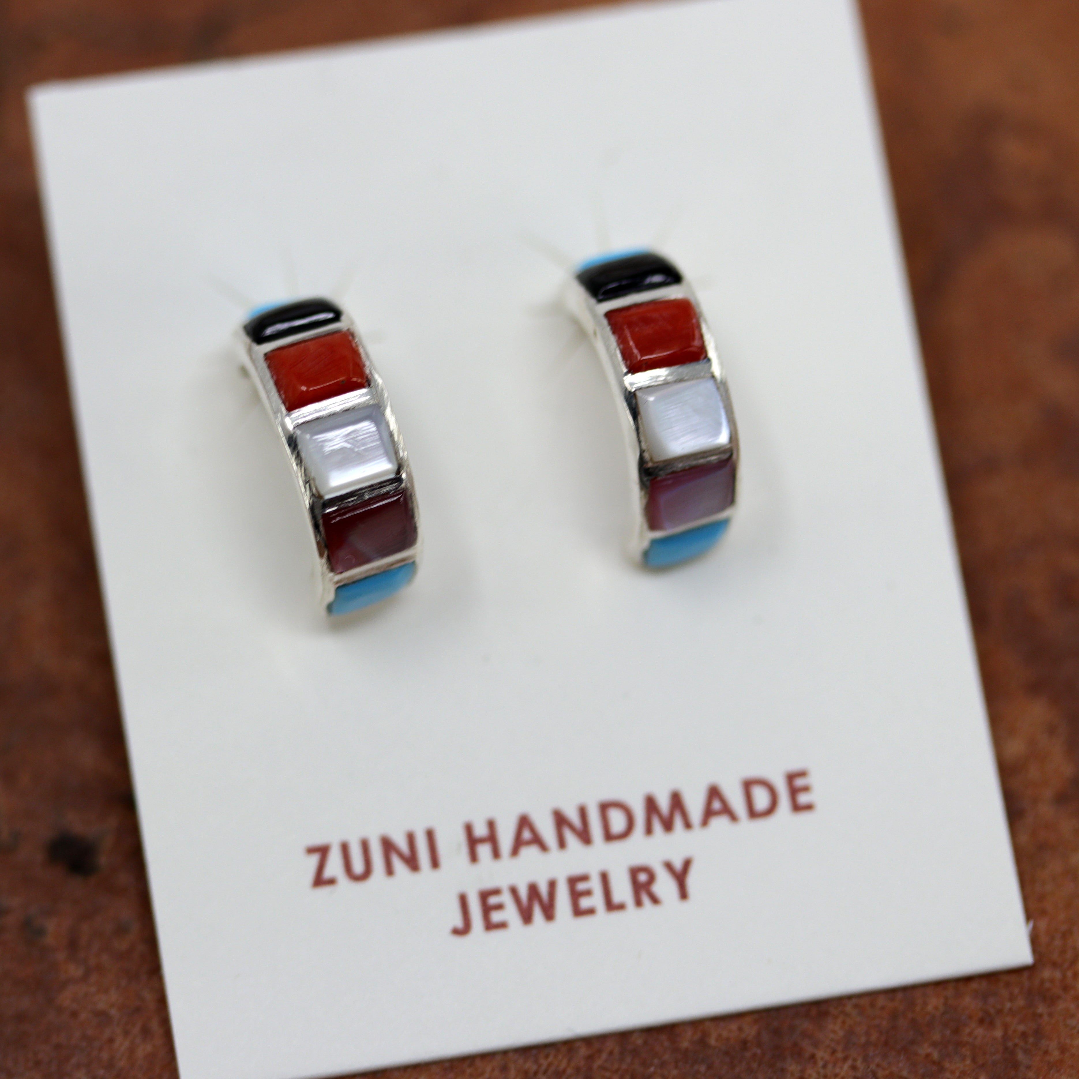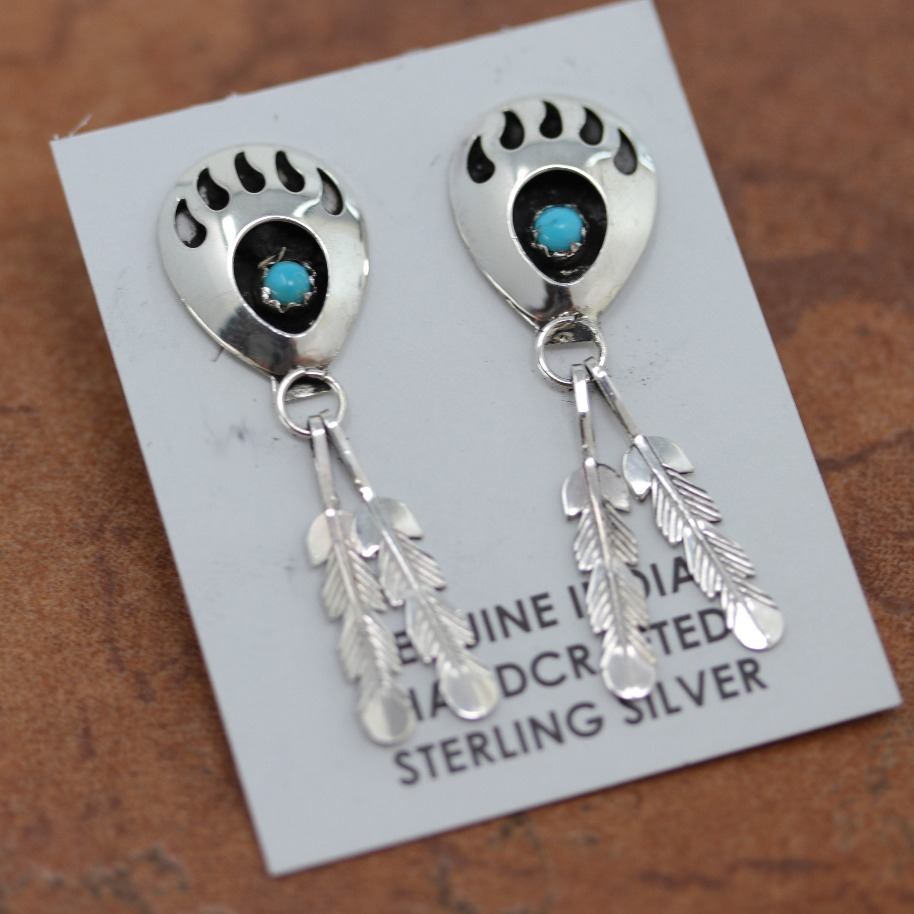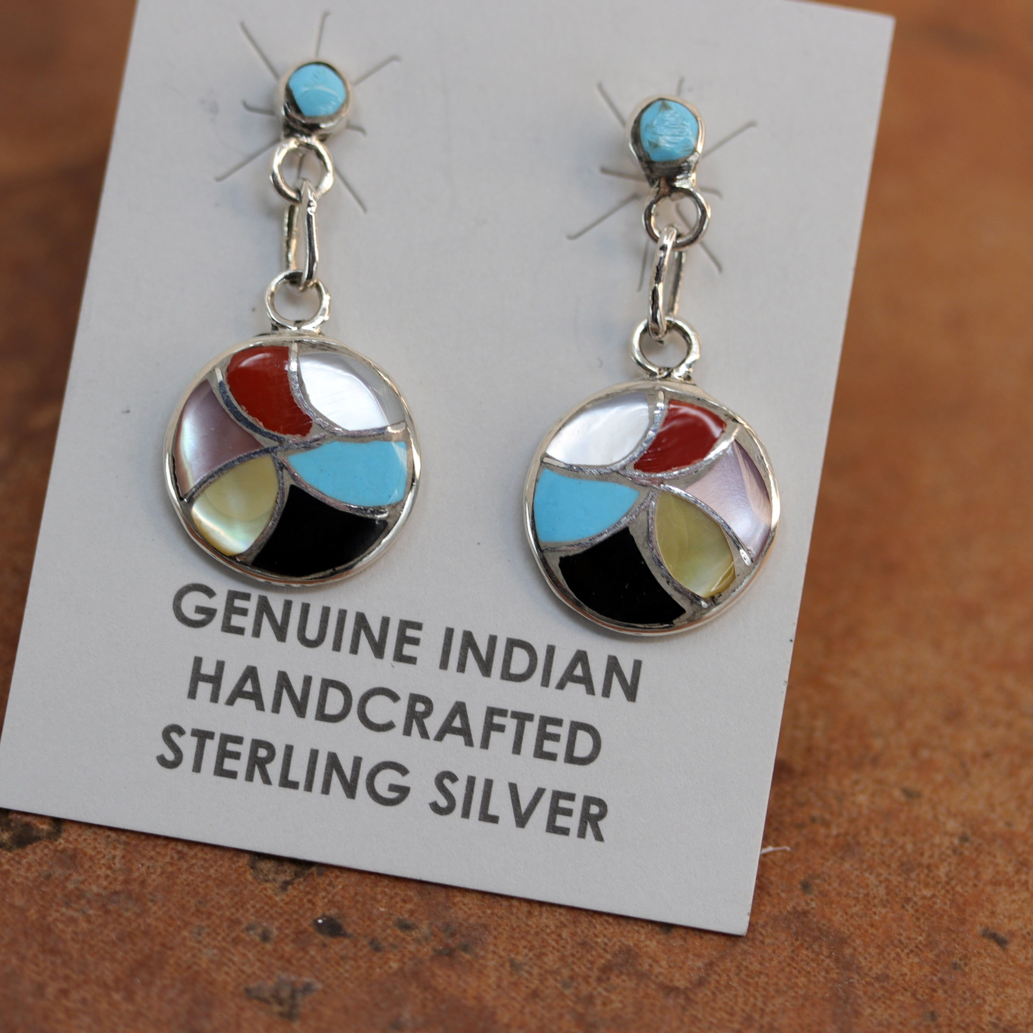 We proudly carry a large variety of sterling silver earrings. Our earrings showcase turquoise, coral, inlay, beadwork, onyx, lapis, spiny oyster, and other beautiful stones. We offer Navajo, Zuni, Native American, and Southwest designs. Our pieces feature post, hoop, Zia, bear paw, dangle, Spider, Petroglyph, nugget, cross, storyteller, Zuni inlay, and many more styles.
