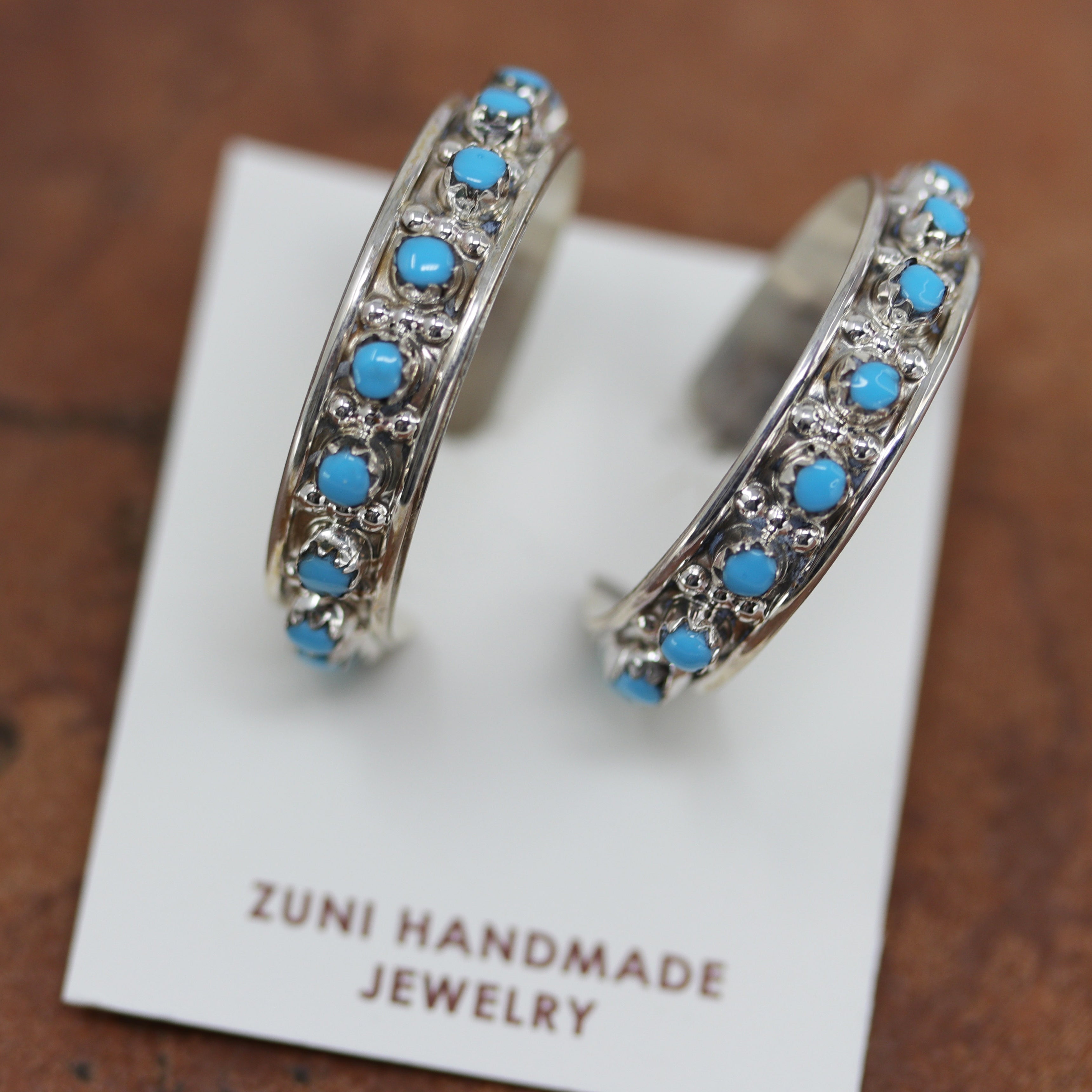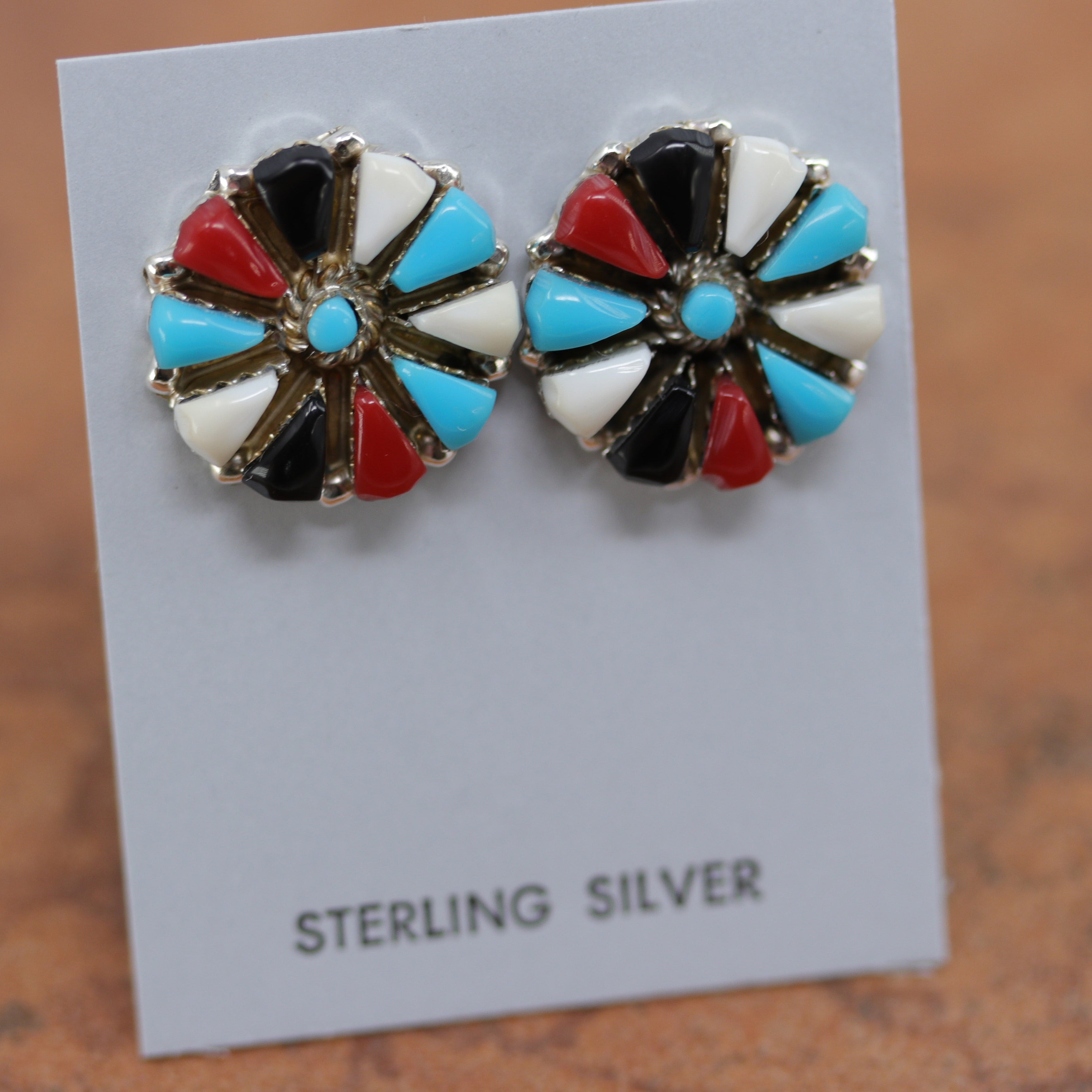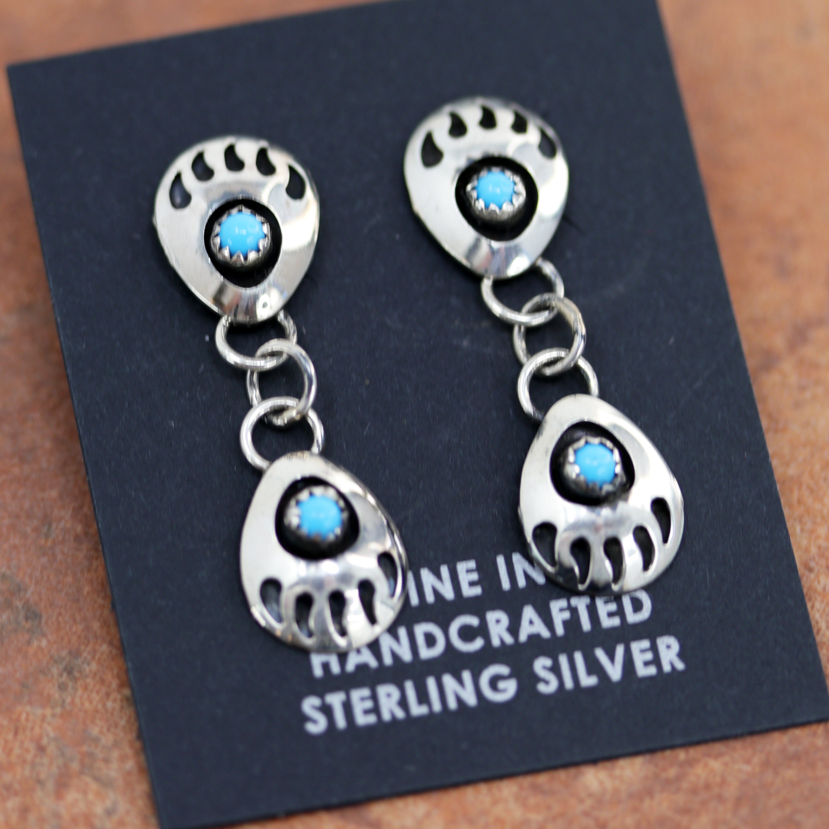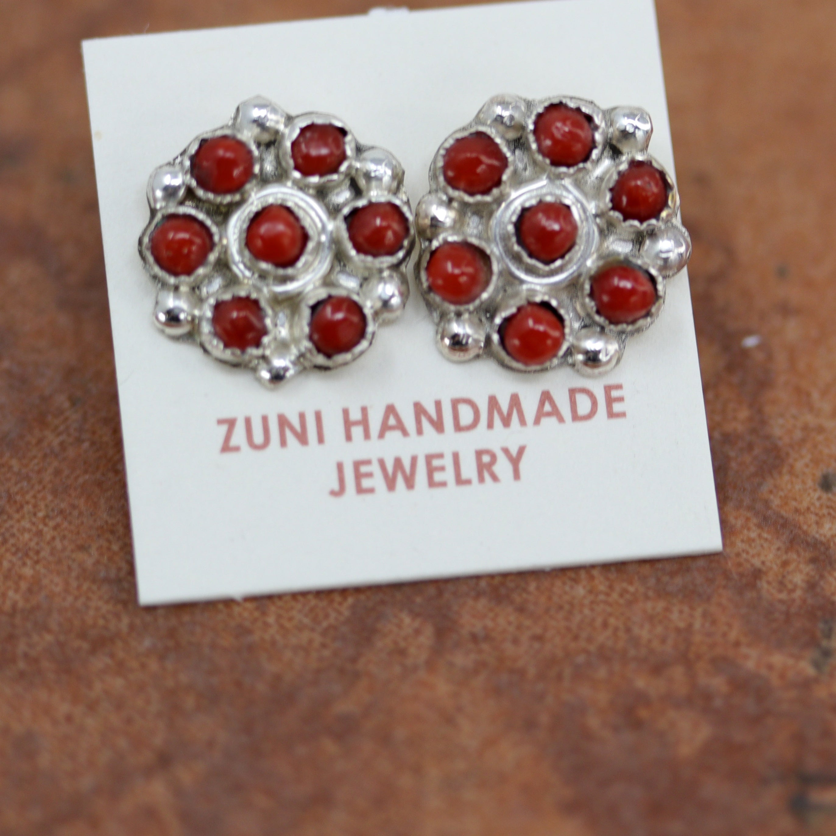 We proudly carry a large variety of sterling silver earrings. Our earrings showcase turquoise, coral, inlay, beadwork, onyx, lapis, spiny oyster, and other beautiful stones. We offer Navajo, Zuni, Native American, and Southwest designs. Our pieces feature post, hoop, Zia, bear paw, dangle, Spider, Petroglyph, nugget, cross, storyteller, Zuni inlay, and many more styles.