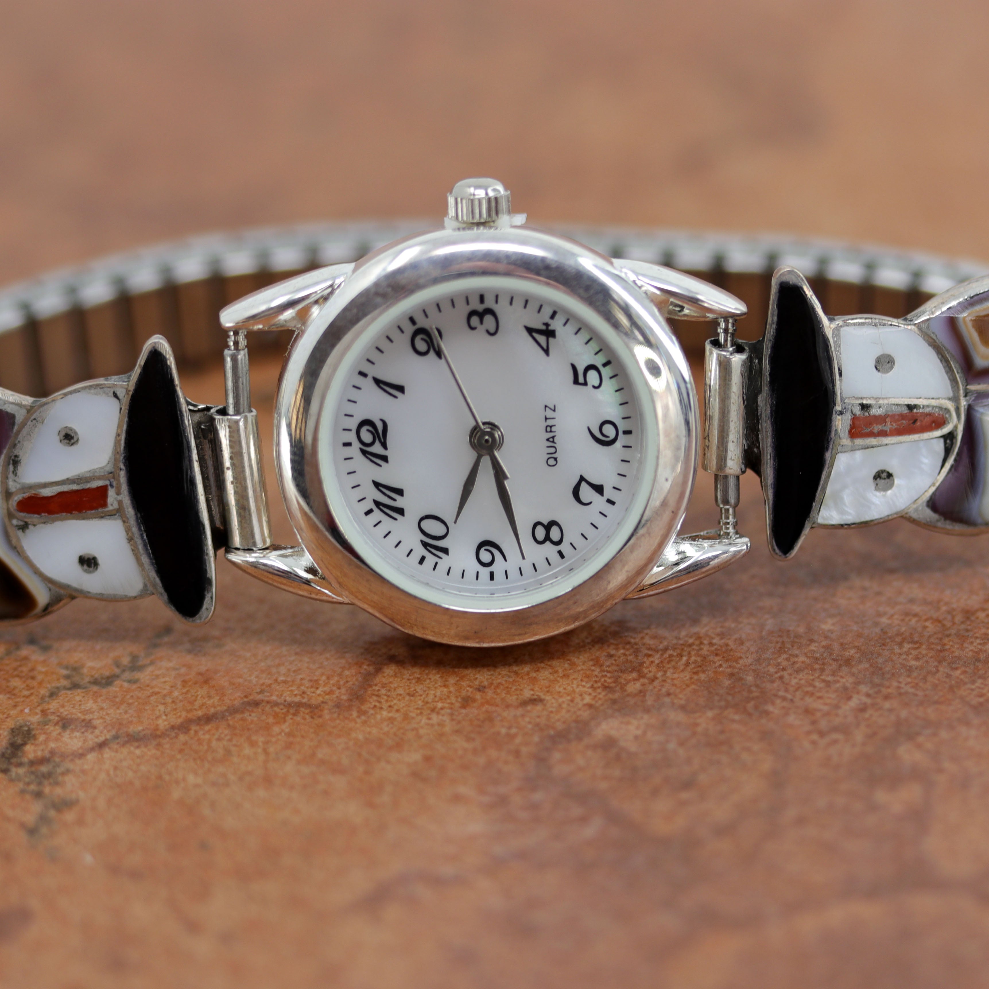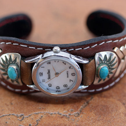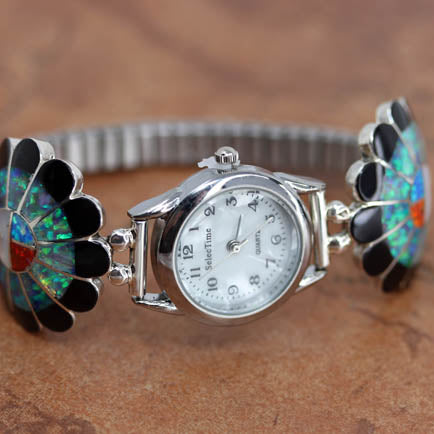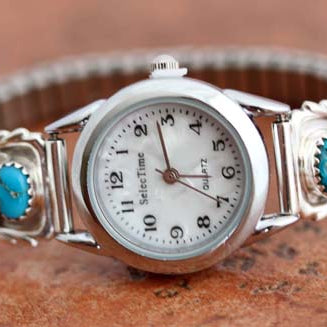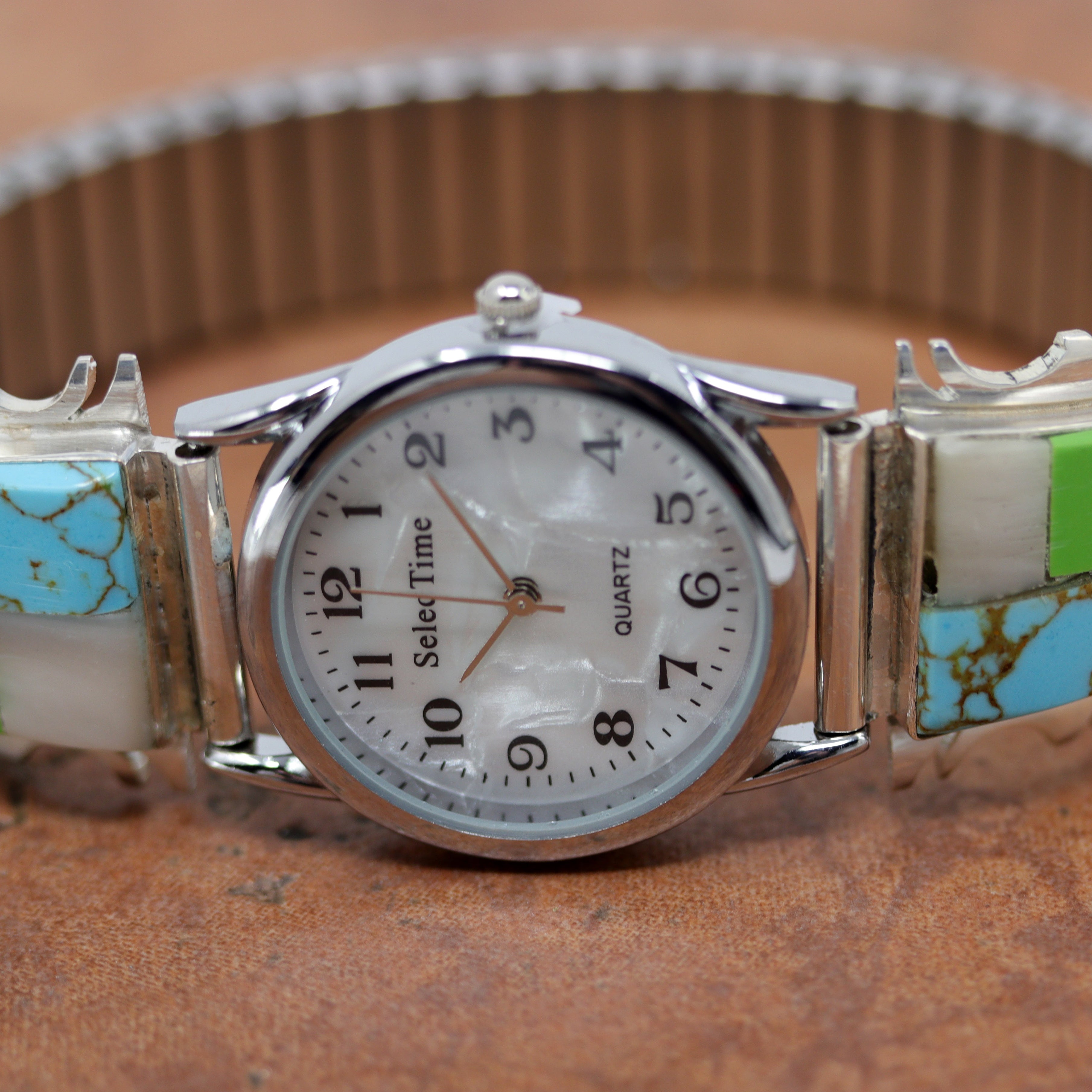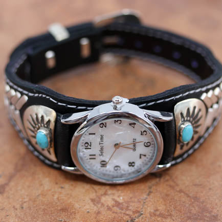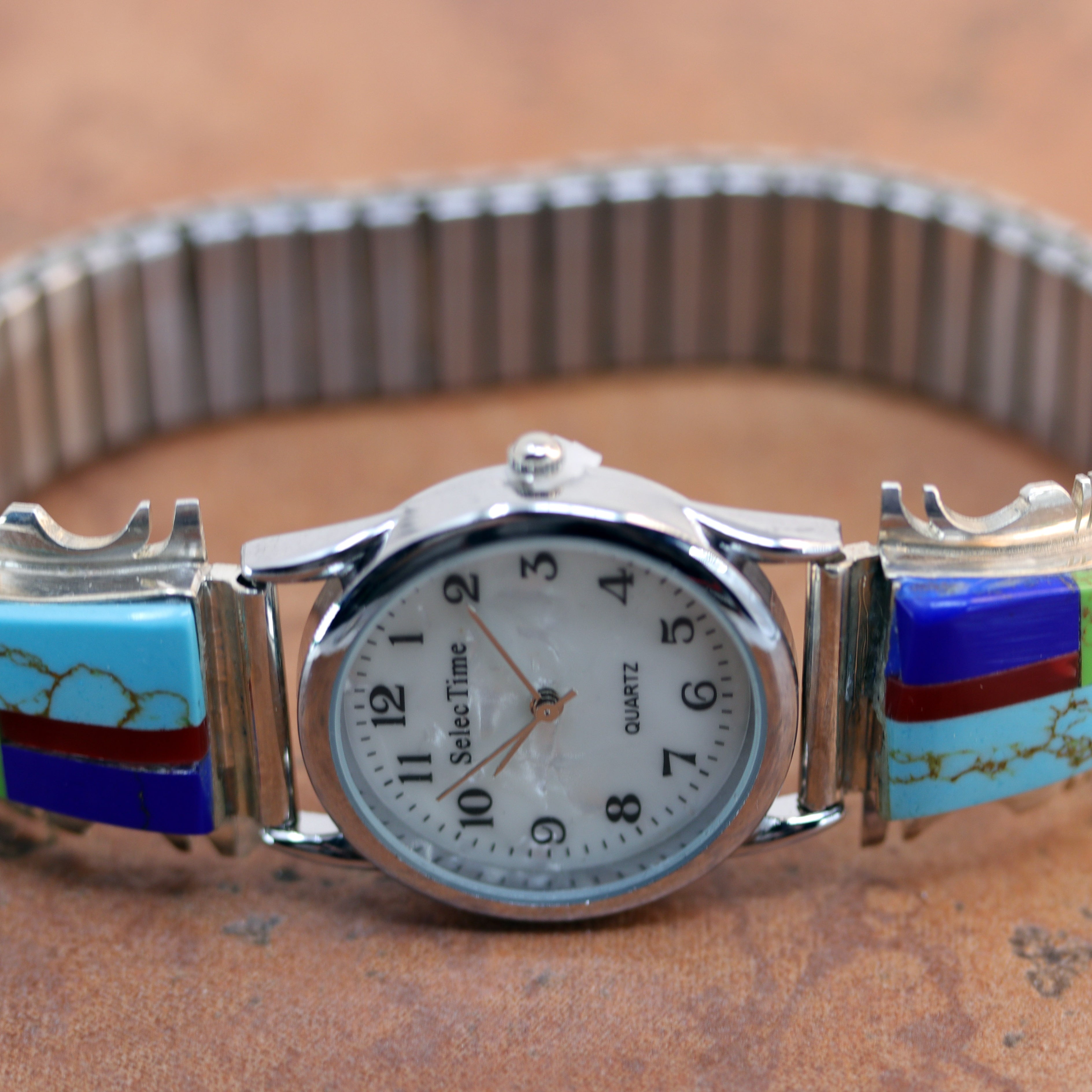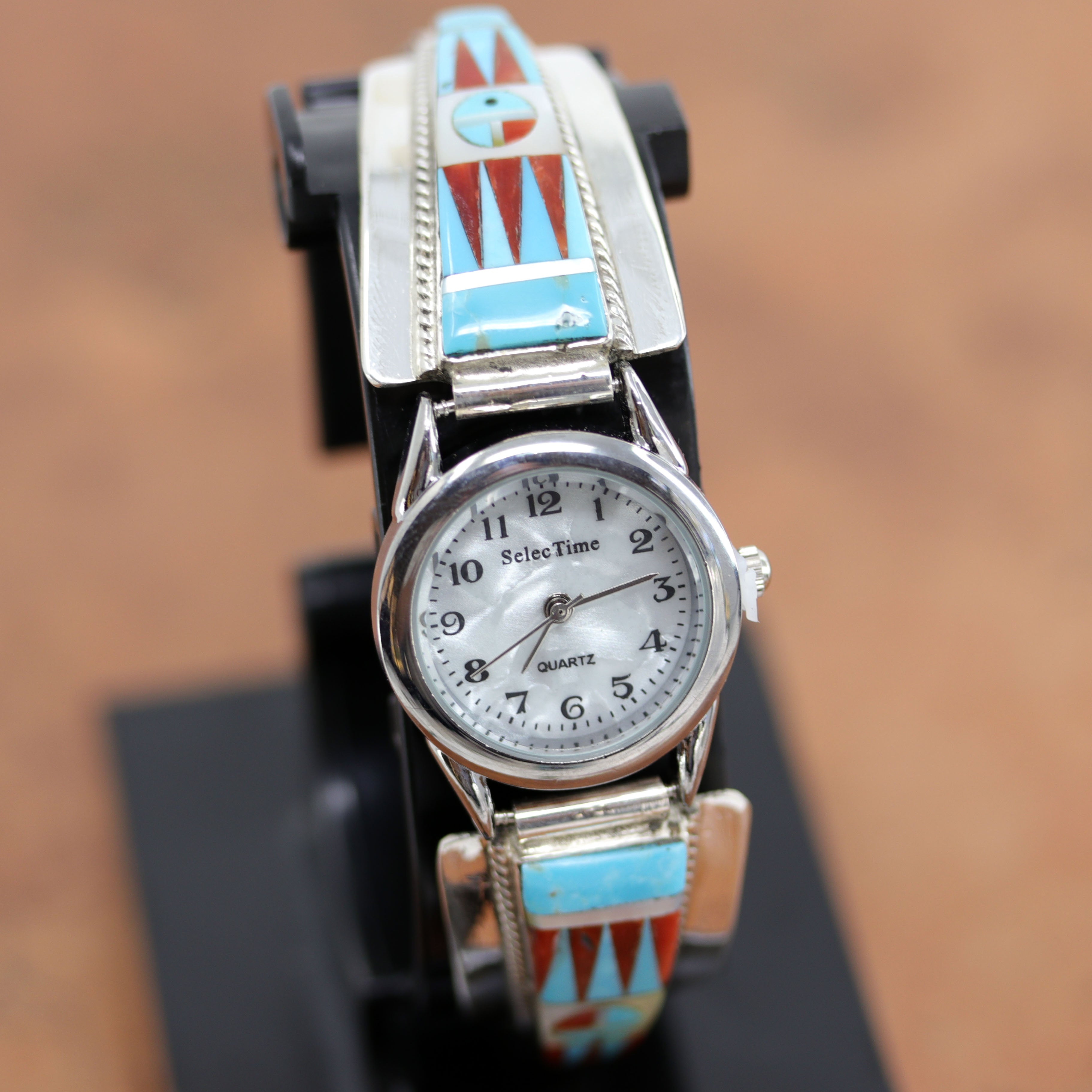 A beautiful collection of men's and women's Navajo, Zuni, Native American, and Southwest watches. Our designs feature watch bracelets, stretchband, leather, Kokopelli, Eagle, inlay, Sunface, cuff, and more. They have stones like turquoise, coral, mother of pearl, onyx, lapis, multi-stone inlay, malachite, and mother of pearl.