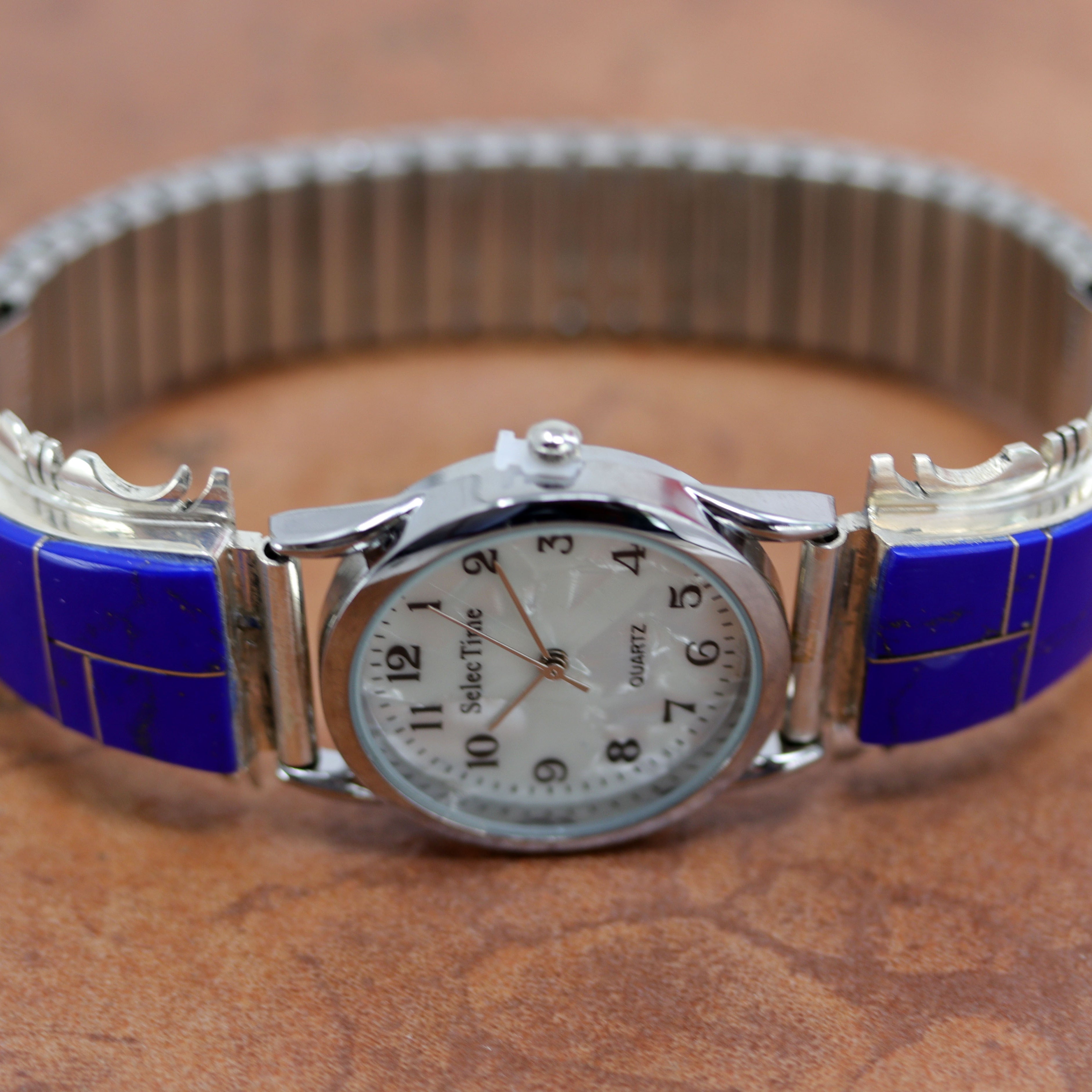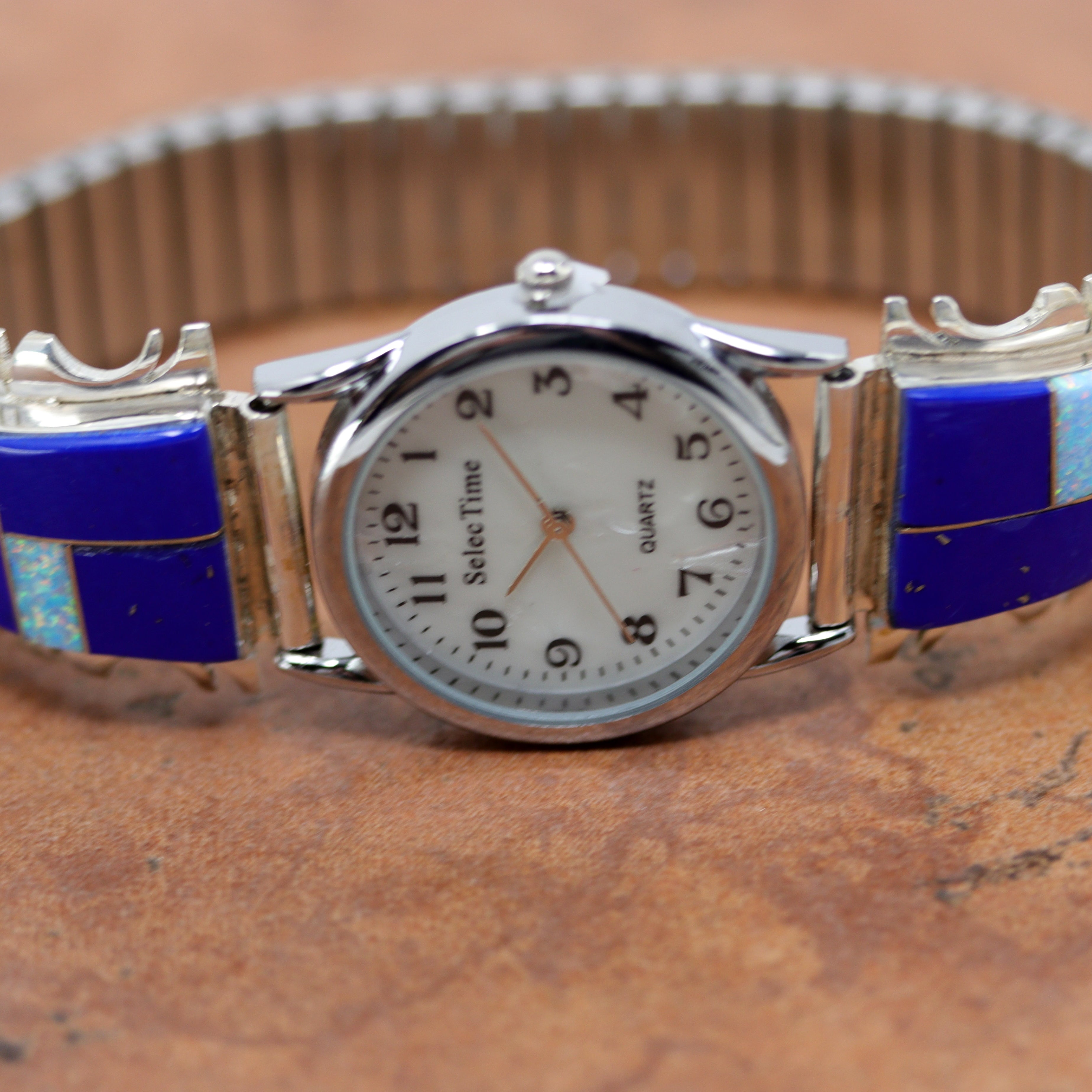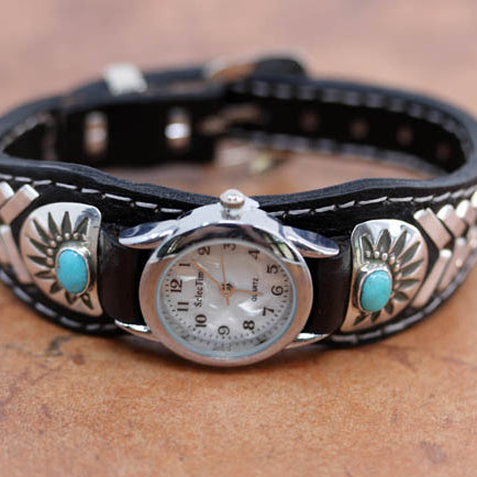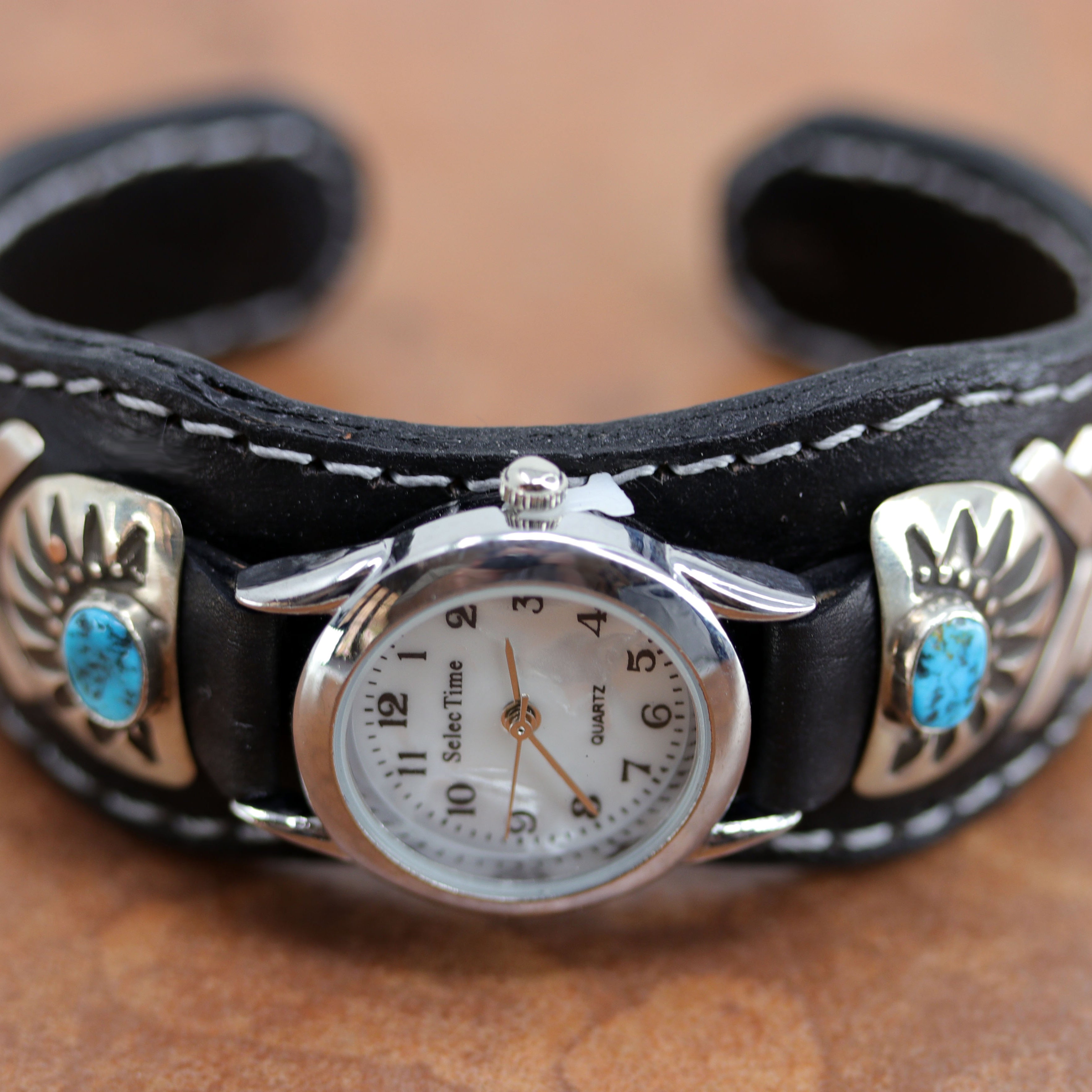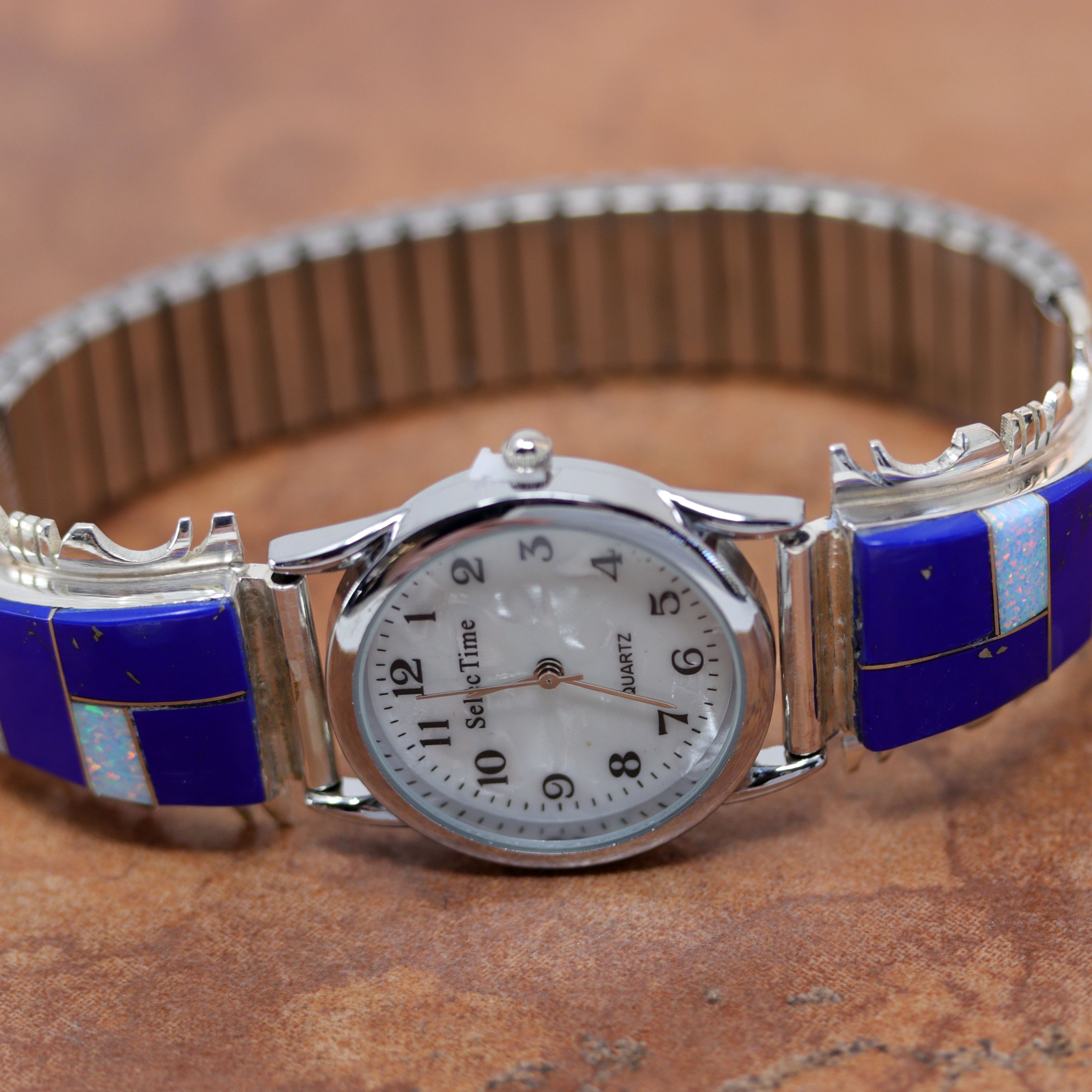 A beautiful collection of men's and women's Navajo, Zuni, Native American, and Southwest watches. Our designs feature watch bracelets, stretchband, leather, Kokopelli, Eagle, inlay, Sunface, cuff, and more. They have stones like turquoise, coral, mother of pearl, onyx, lapis, multi-stone inlay, malachite, and mother of pearl.