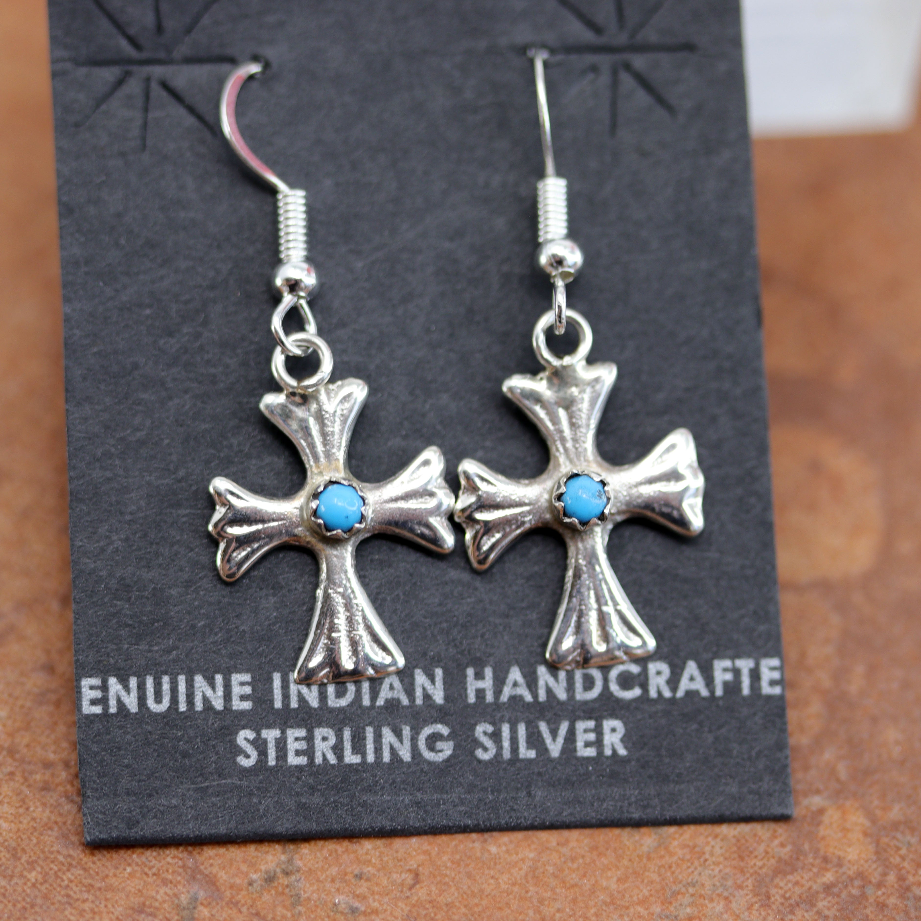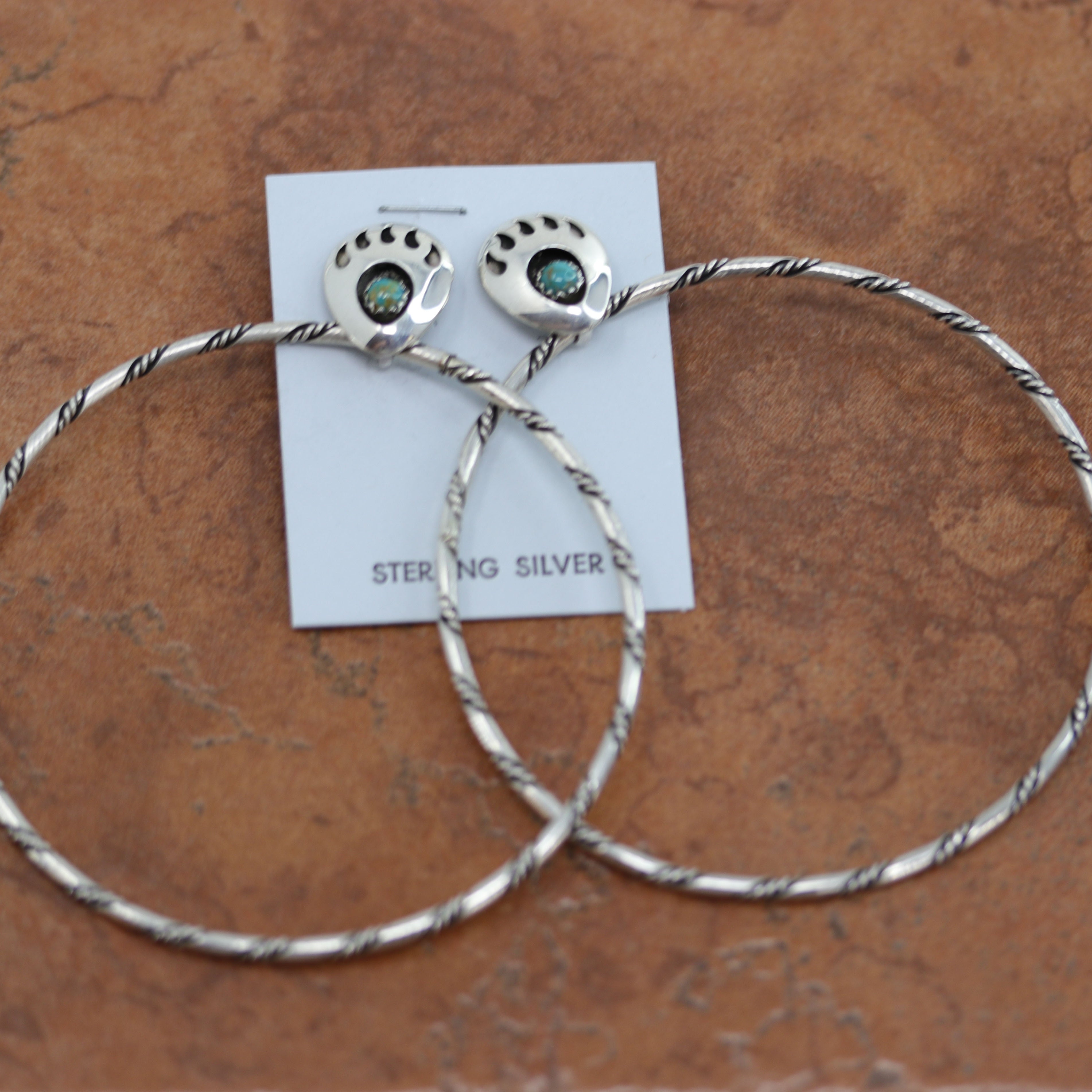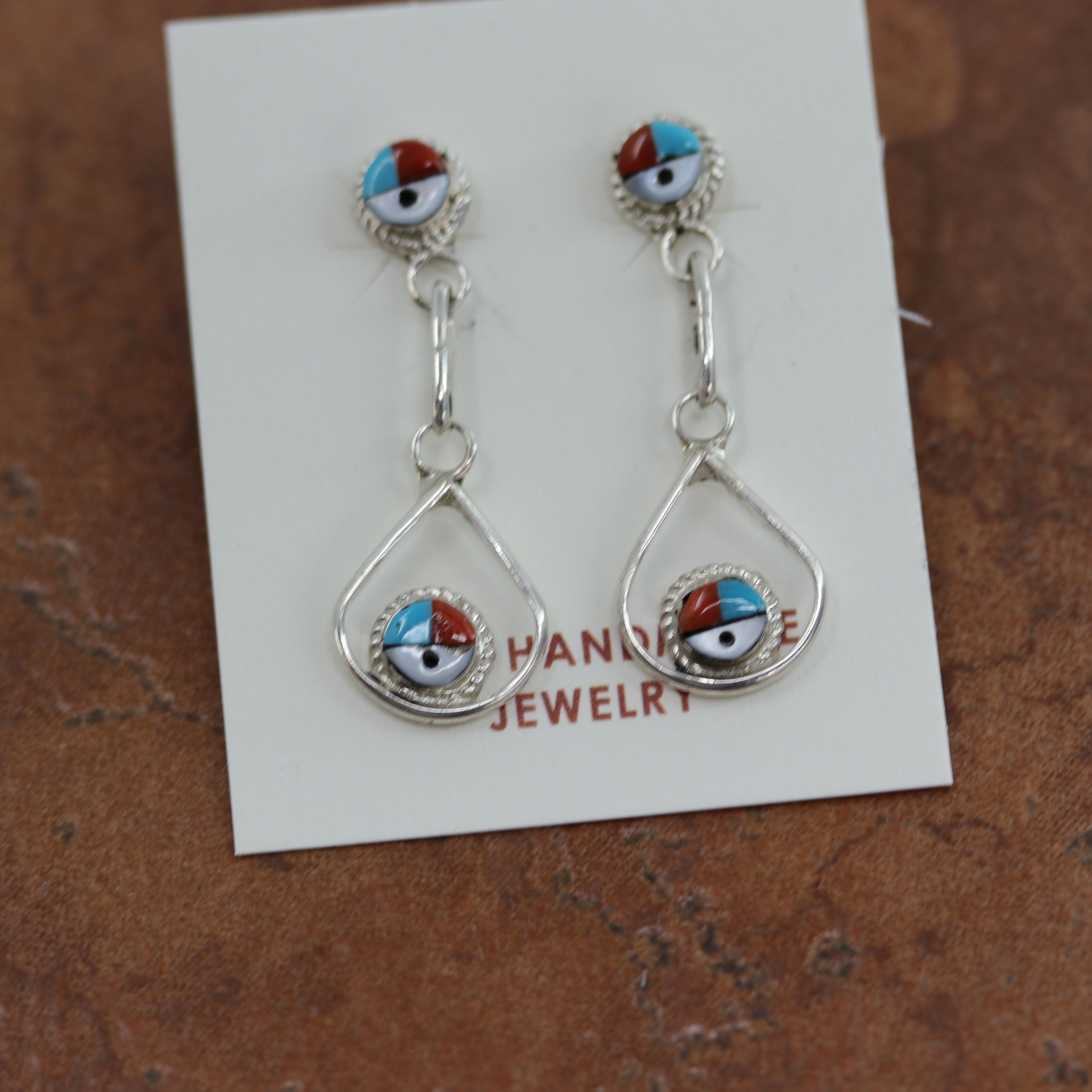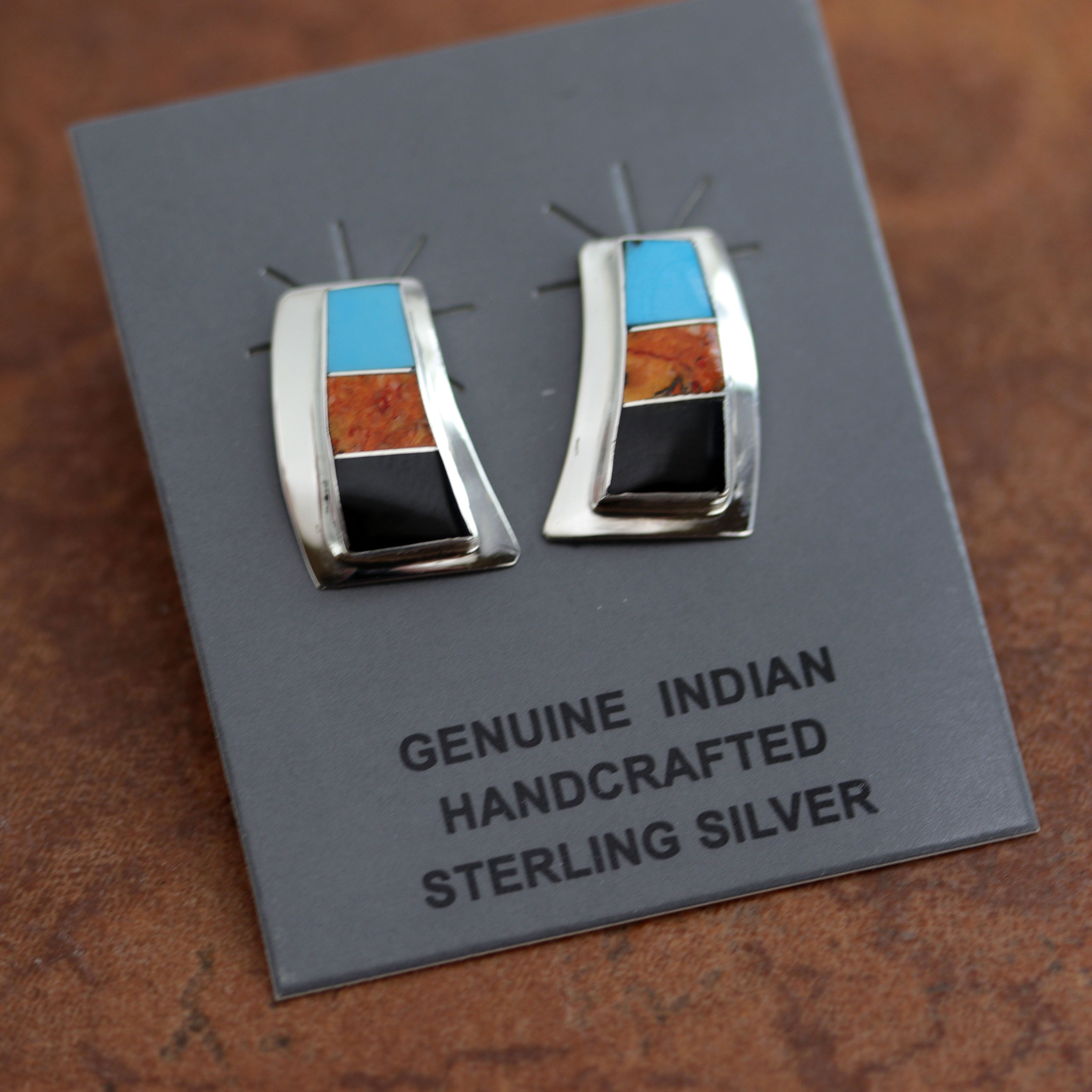 We proudly carry a large variety of sterling silver earrings. Our earrings showcase turquoise, coral, inlay, beadwork, onyx, lapis, spiny oyster, and other beautiful stones. We offer Navajo, Zuni, Native American, and Southwest designs. Our pieces feature post, hoop, Zia, bear paw, dangle, Spider, Petroglyph, nugget, cross, storyteller, Zuni inlay, and many more styles.