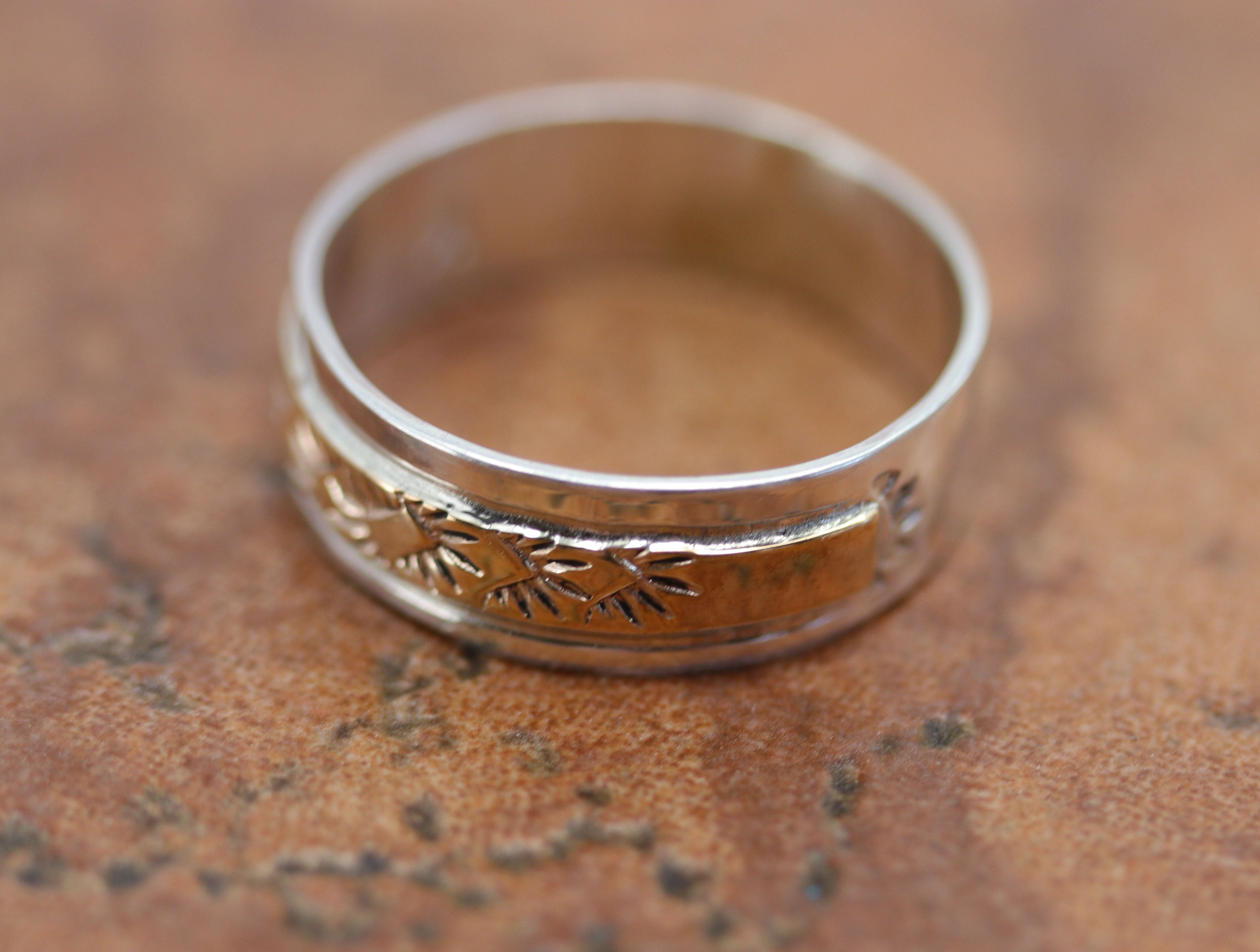Navajo Native American ring. It is made from sterling silver and copper. The size is 7 and it is 1/4" at the widest point.