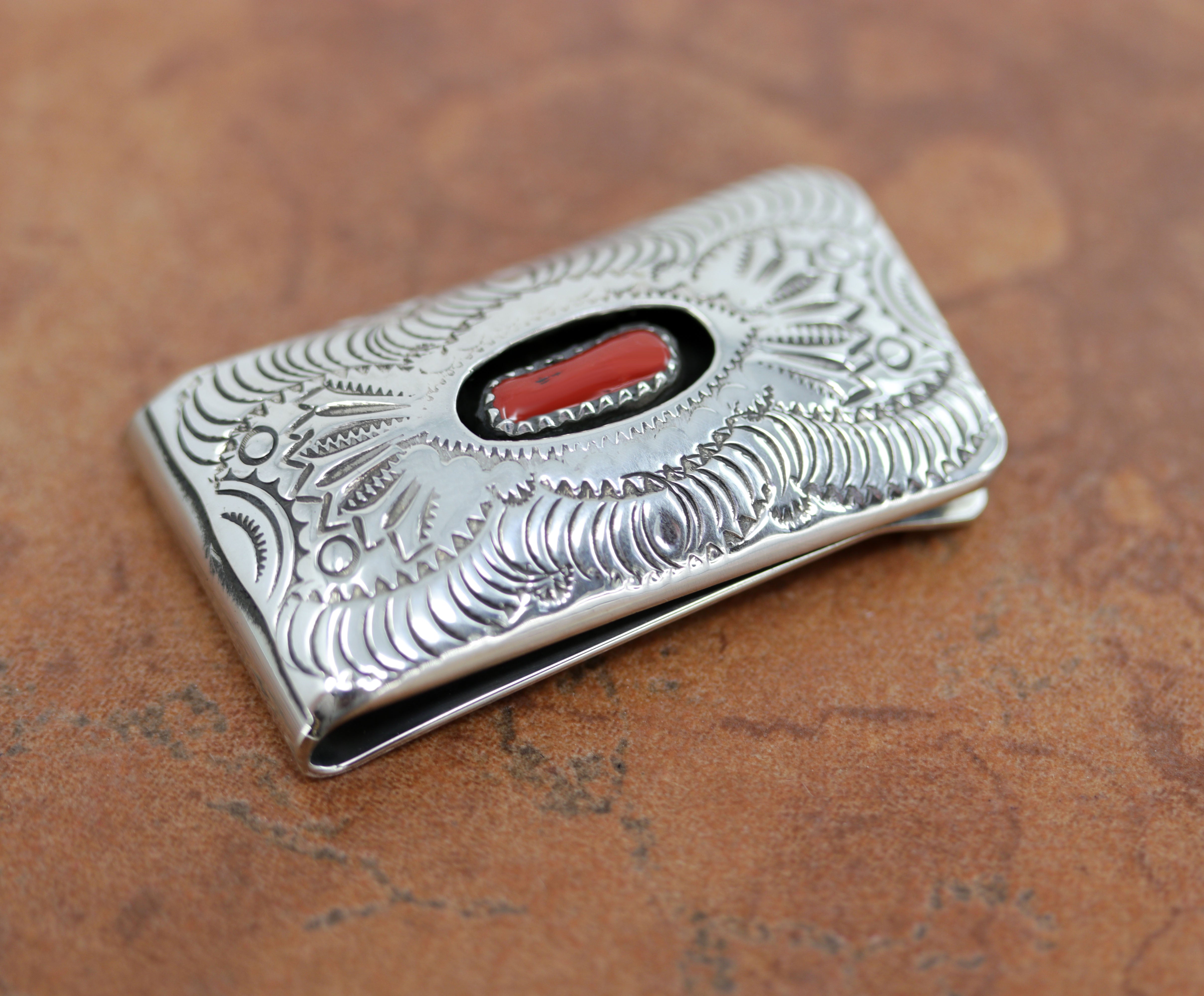 Lovely Navajo Native American money clip by S Skeets. It is made from sterling silver and coral. The lower part of the money clip is made from nickel to give it more durability. It is about 1 7/8" in length and 1" wide.