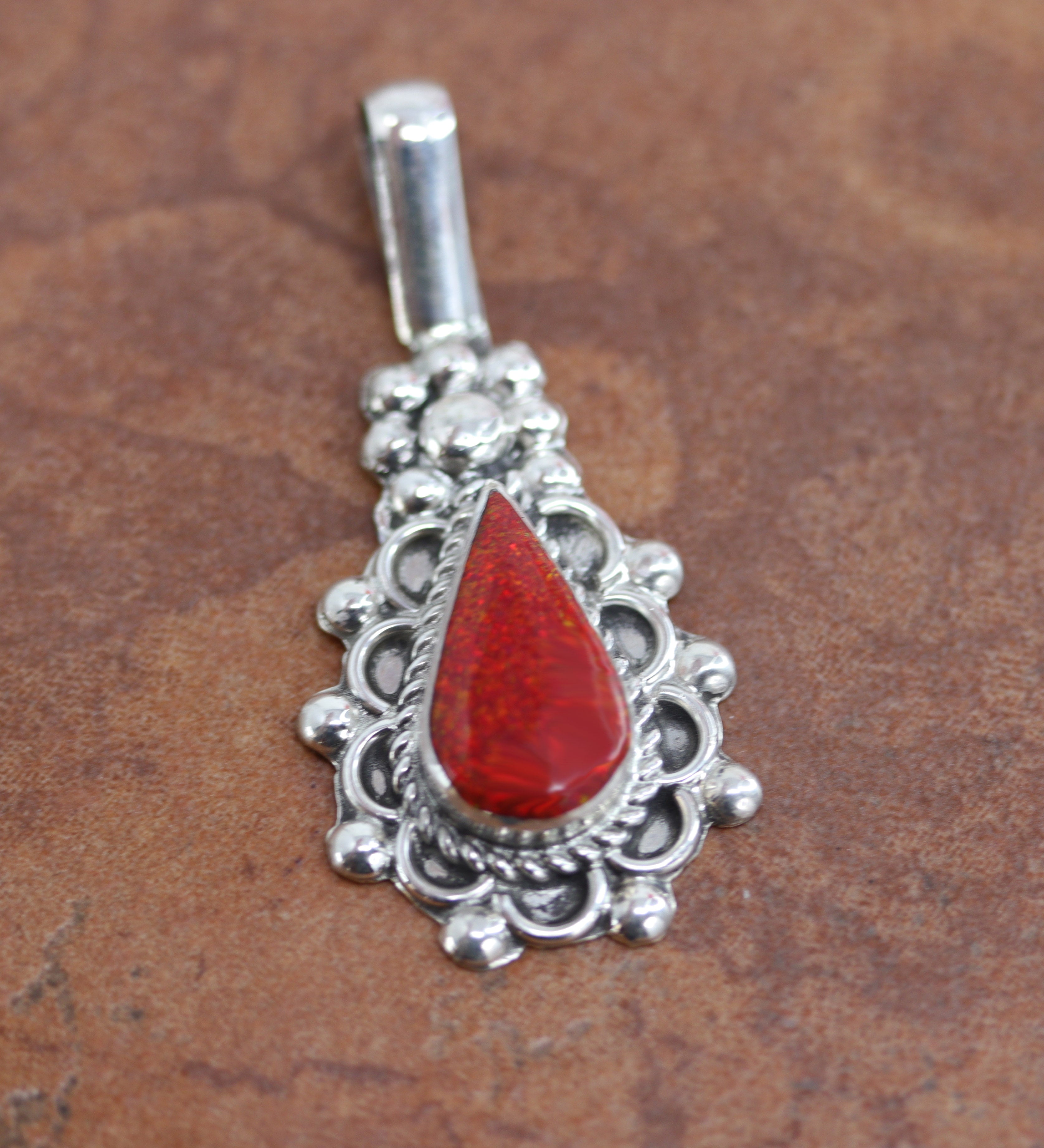 A beautiful pendant made from sterling silver and created opal. The pendant measures 2 1/8" by 1".