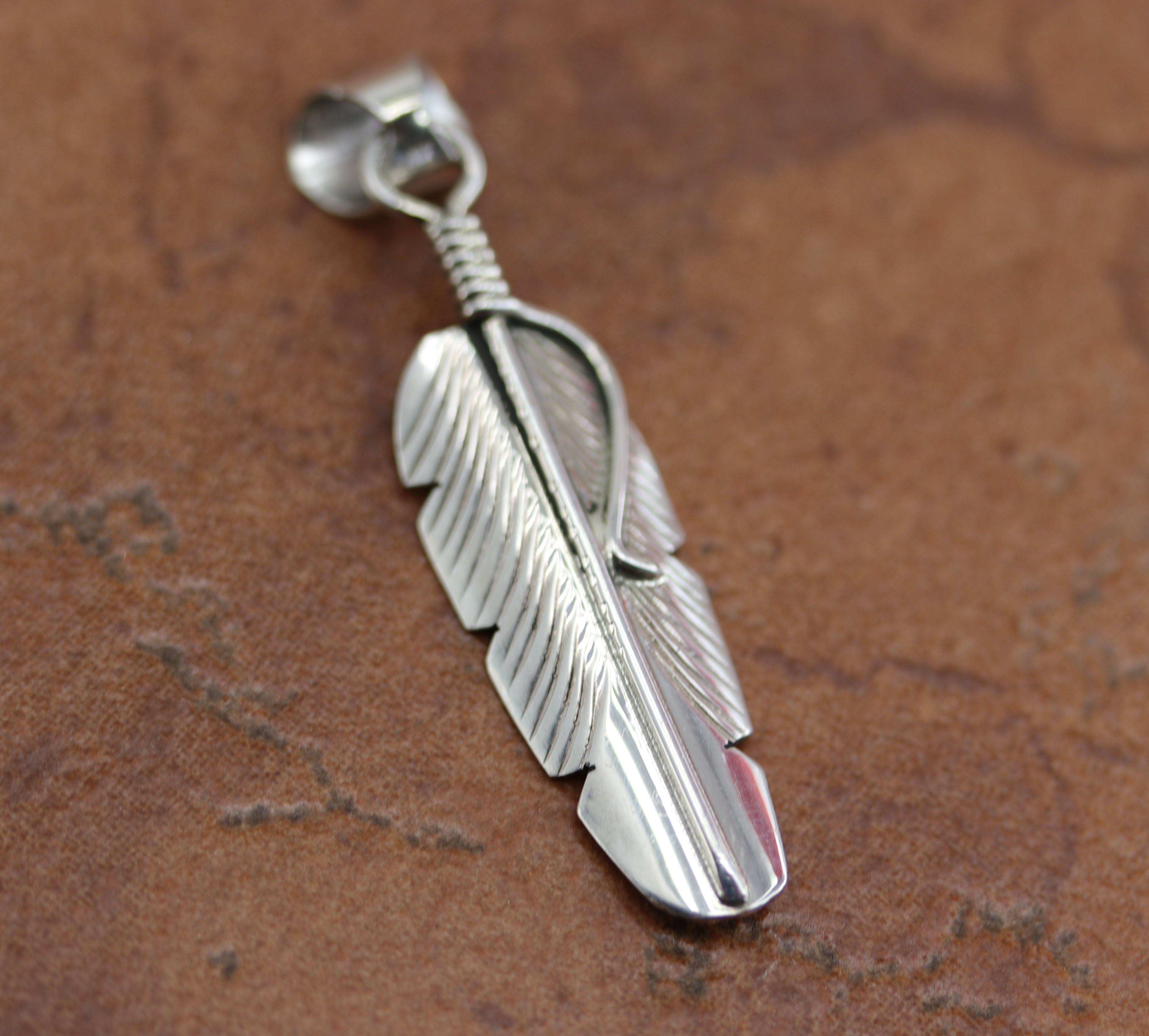 A lovely Navajo Native American Feather Pendant by A Davis. It is made from sterling silver. It is 2" long and about 1/2" wide.