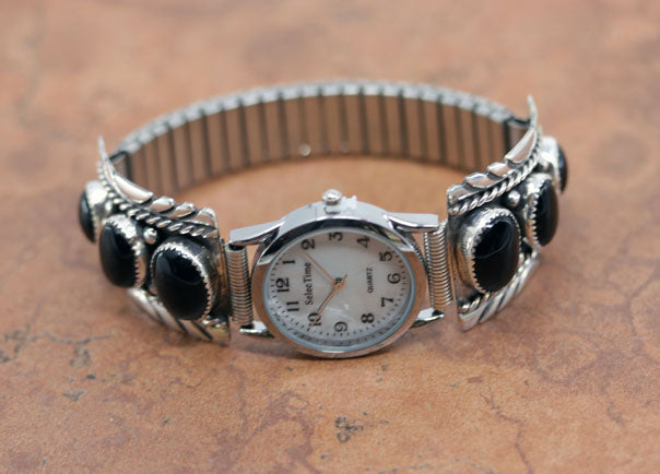 Navajo Native American watch made from sterling silver, stainless steel and onyx. The Navajo designs are 1 7/8" in length, and the watch itself is about 1 1/8" in diameter. The Navajo design is stamped sterling, and the actual watch is stamped stainless steel back and Japan MOVT.