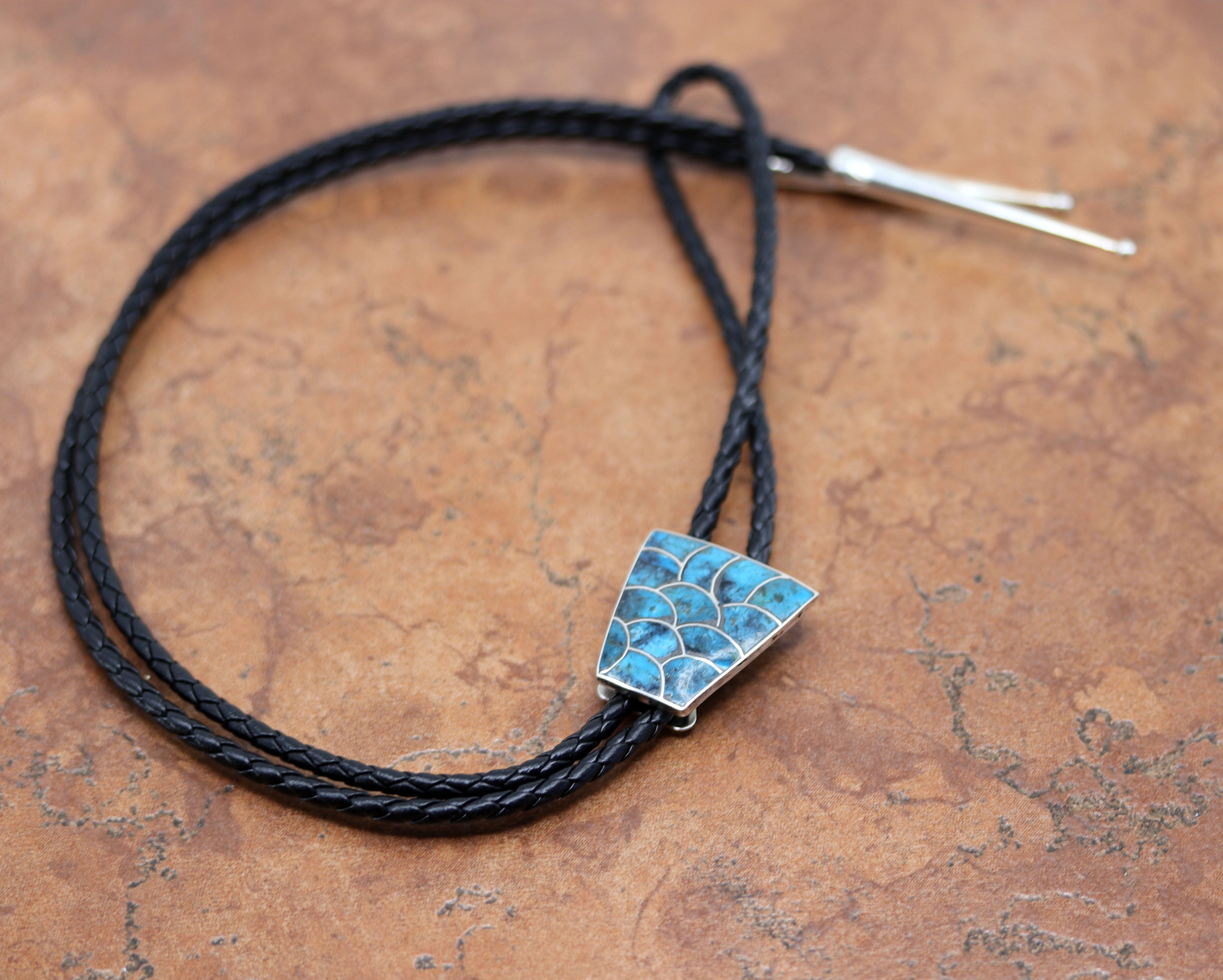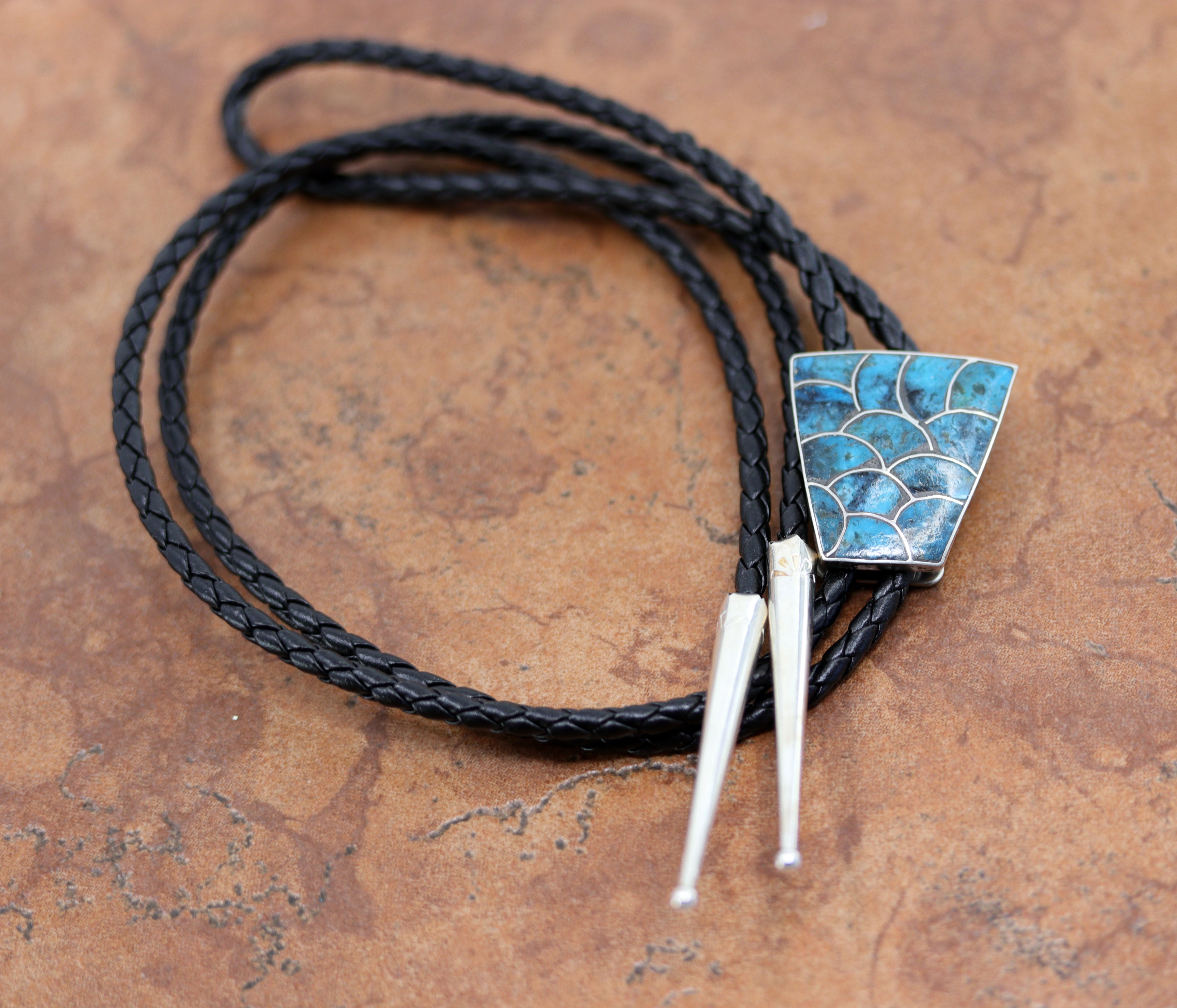 Navajo Native American Bolo Tie. The bolo tie is made of sterling silver and turquoise. The cord is about 38". The bolo measures 1 3/8" by 1 1/4".