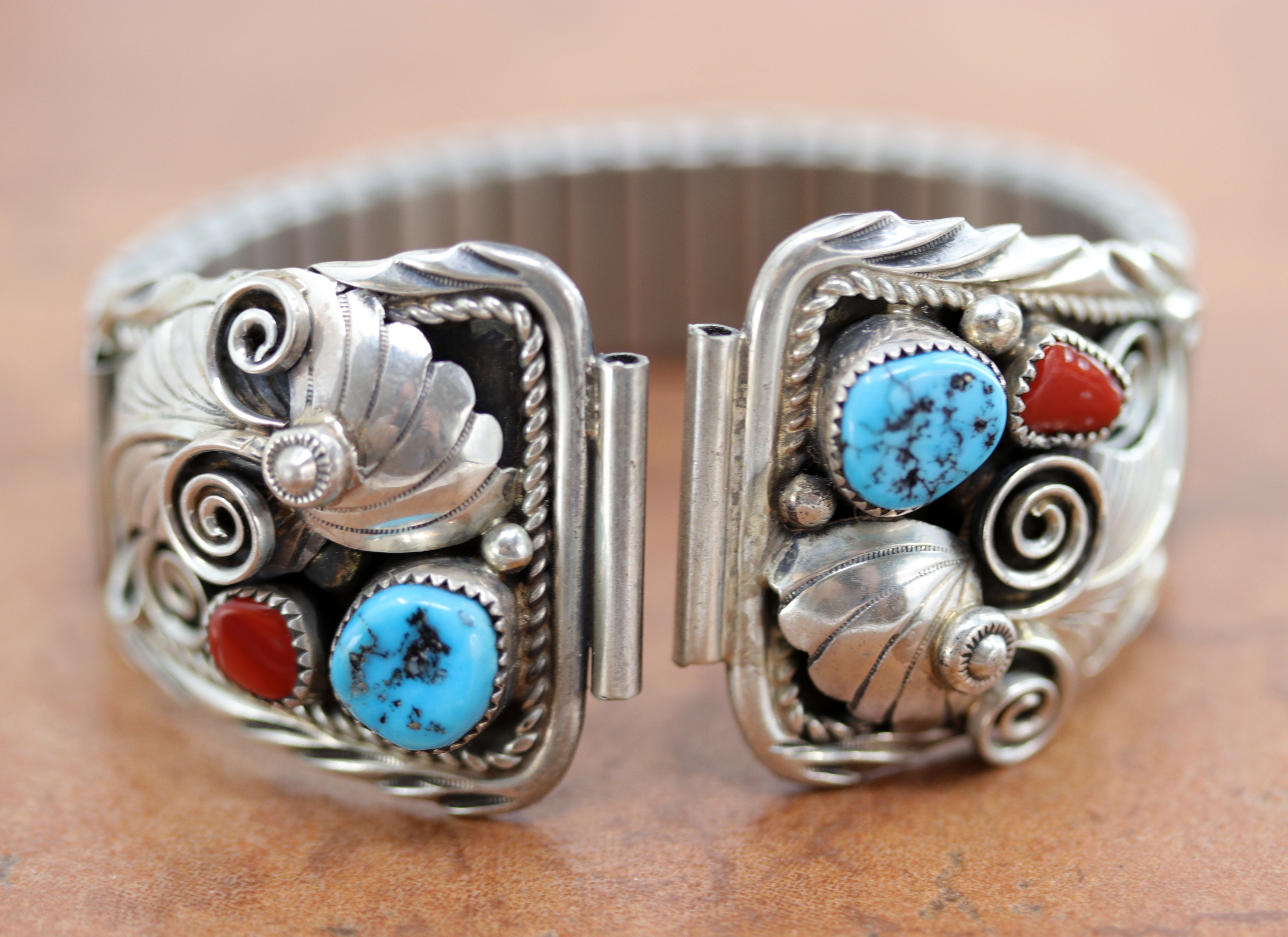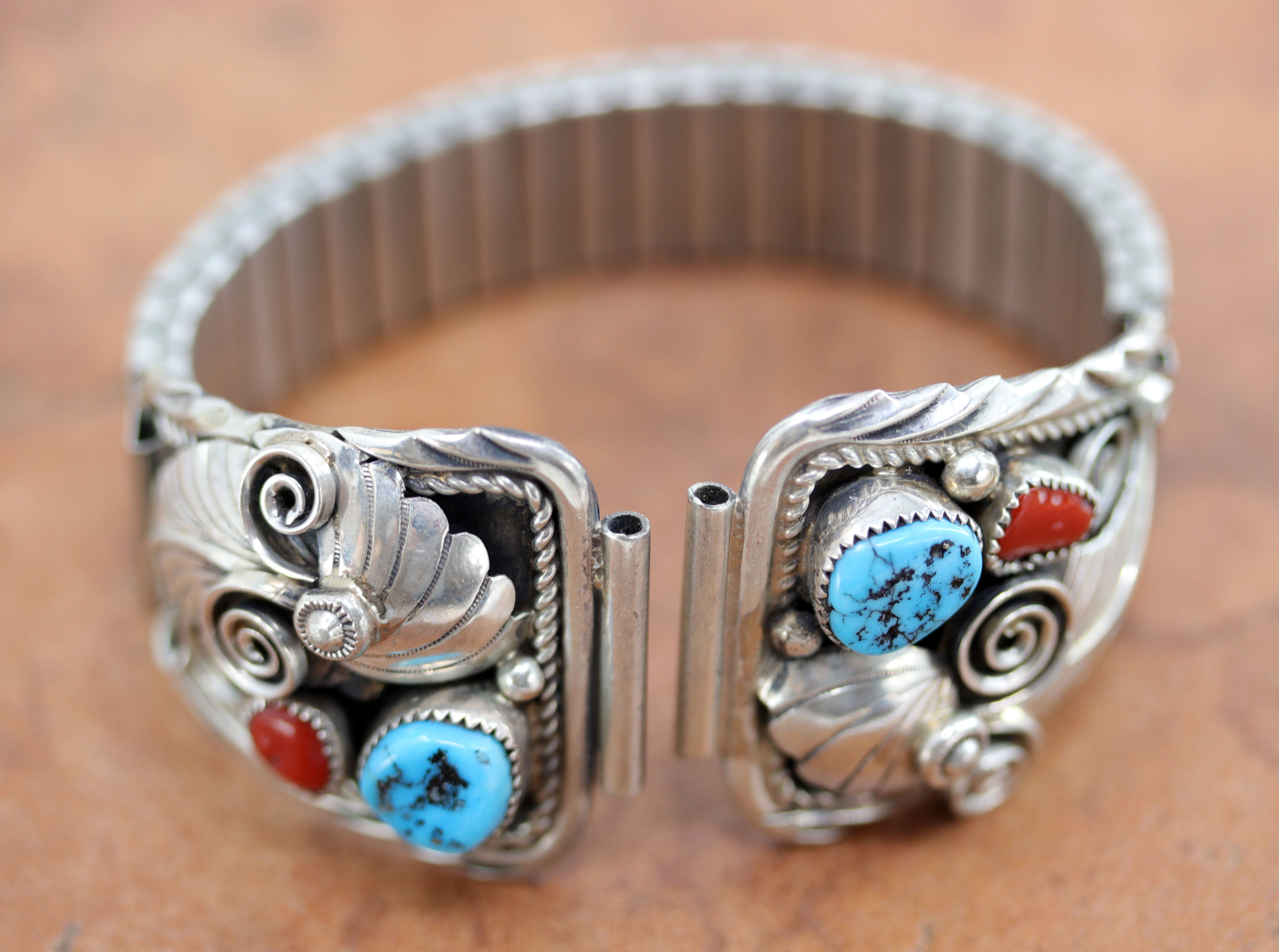 Navajo Native American watch made from sterling silver, stainless steel and turquoise. The Navajo designs are 1 3/4" in length, and the tips are 7/8" (where the watch is inserted). The Navajo design is stamped sterling, and the actual watch is stamped stainless steel back and Japan MOVT. The stretchband is 3 1/2" wide.