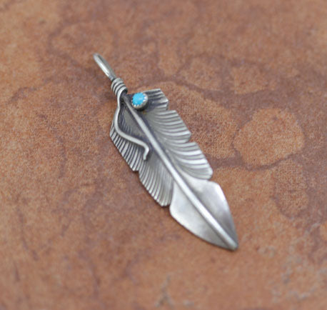 Navajo Native American Feather Pendant made by Chris Charlie. It is made from sterling silver and turquoise. It is 2" long and about 5/8" wide. \