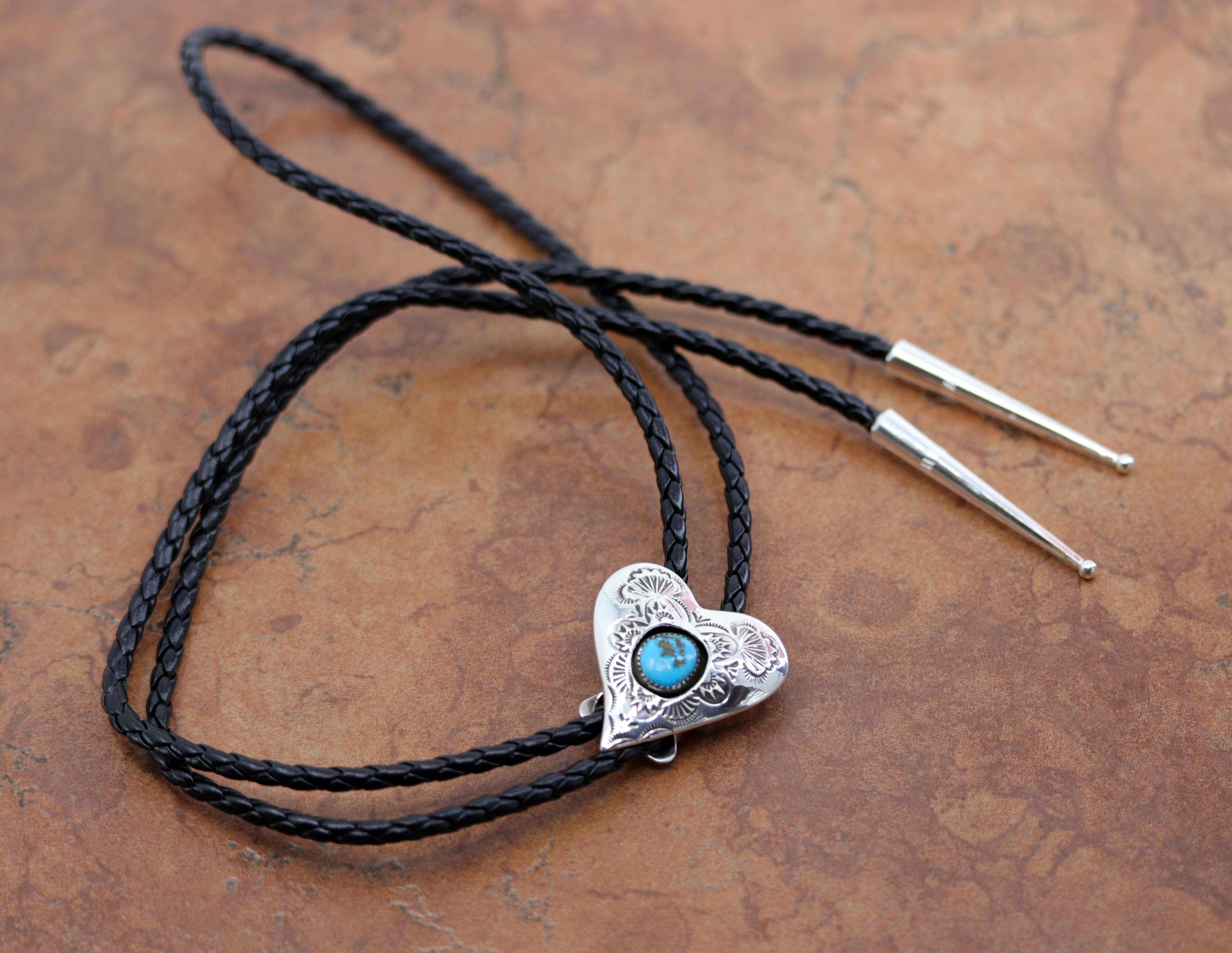 An authentic Navajo Native American Bolo Tie by Shirley Skeets. The bolo tie is made of sterling silver and turquoise. The cord measures about 38". The bolo measures 1 1/2" by 1 3/8".
