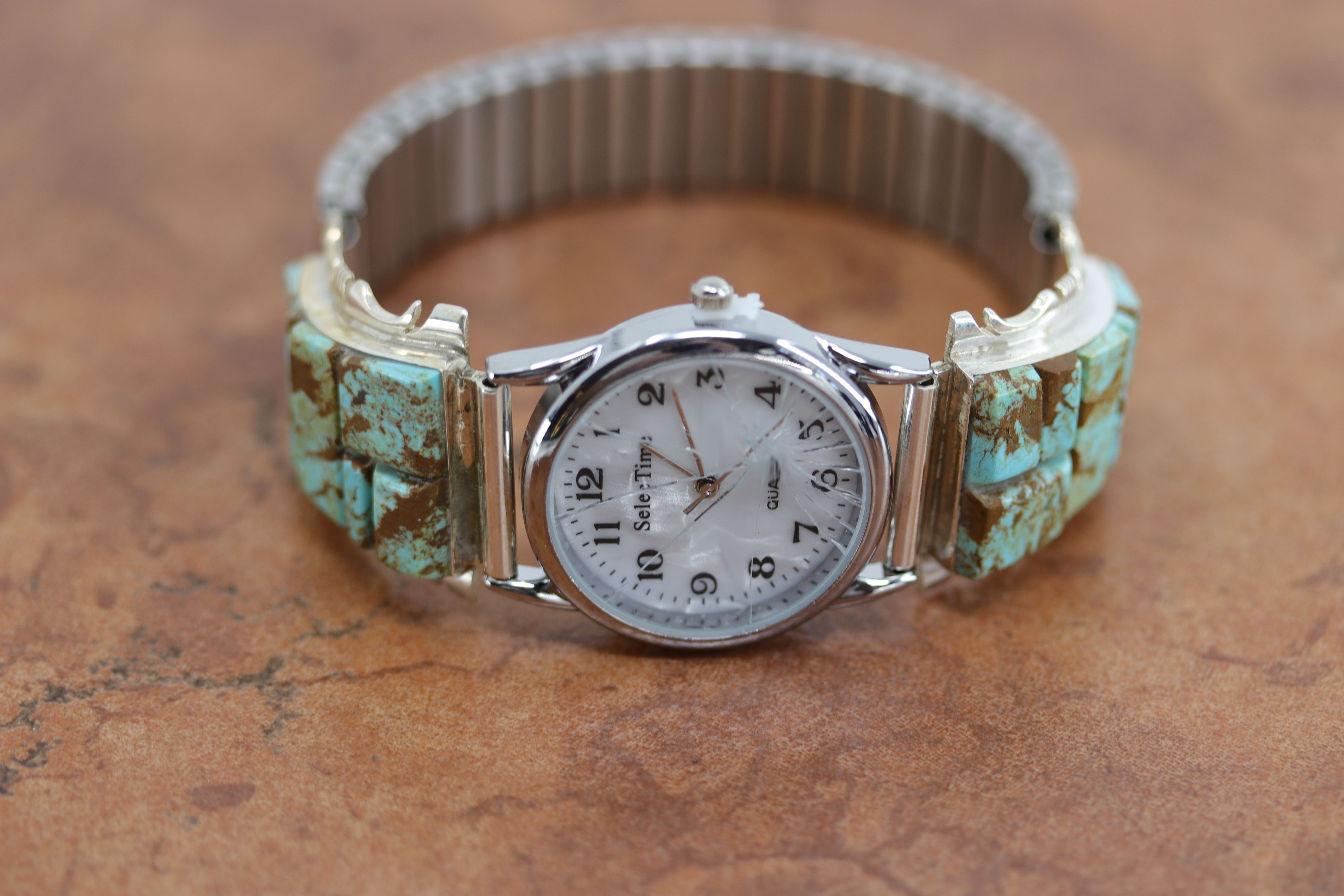 A very nice Navajo Native American mens watch. It is made from sterling silver, stainless steel, and turquoise. The designs are 2" in length, and the watch itself is about 1 1/4" in diameter. The whole watch including the wristband can fit anywhere for a 8" - 10" wrist.