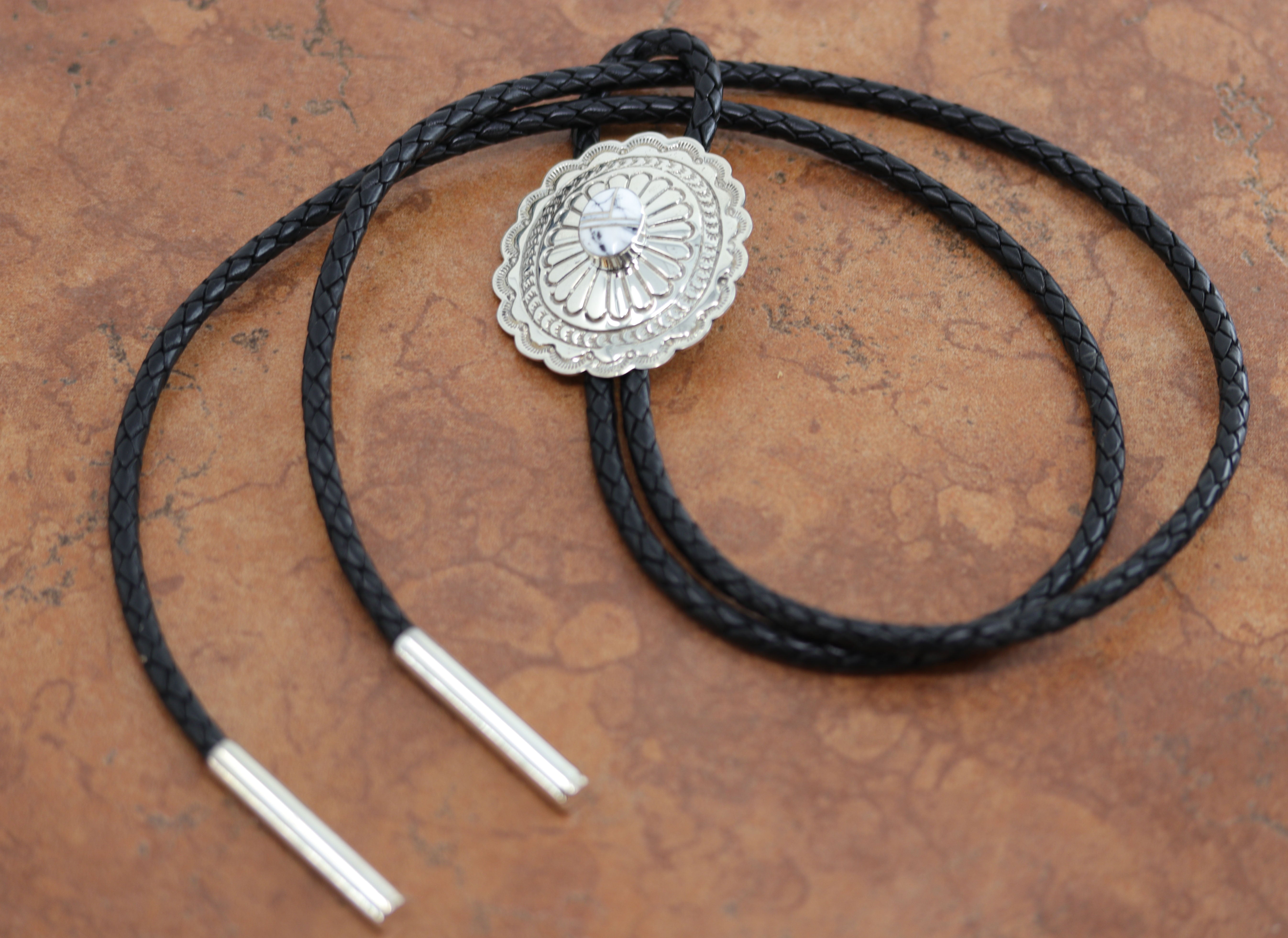 An authentic Navajo Native American Bolo Tie. The bolo tie is made of sterling silver and white buffalo. The cord measures about 44". The bolo measures 2 1/8" by 2".