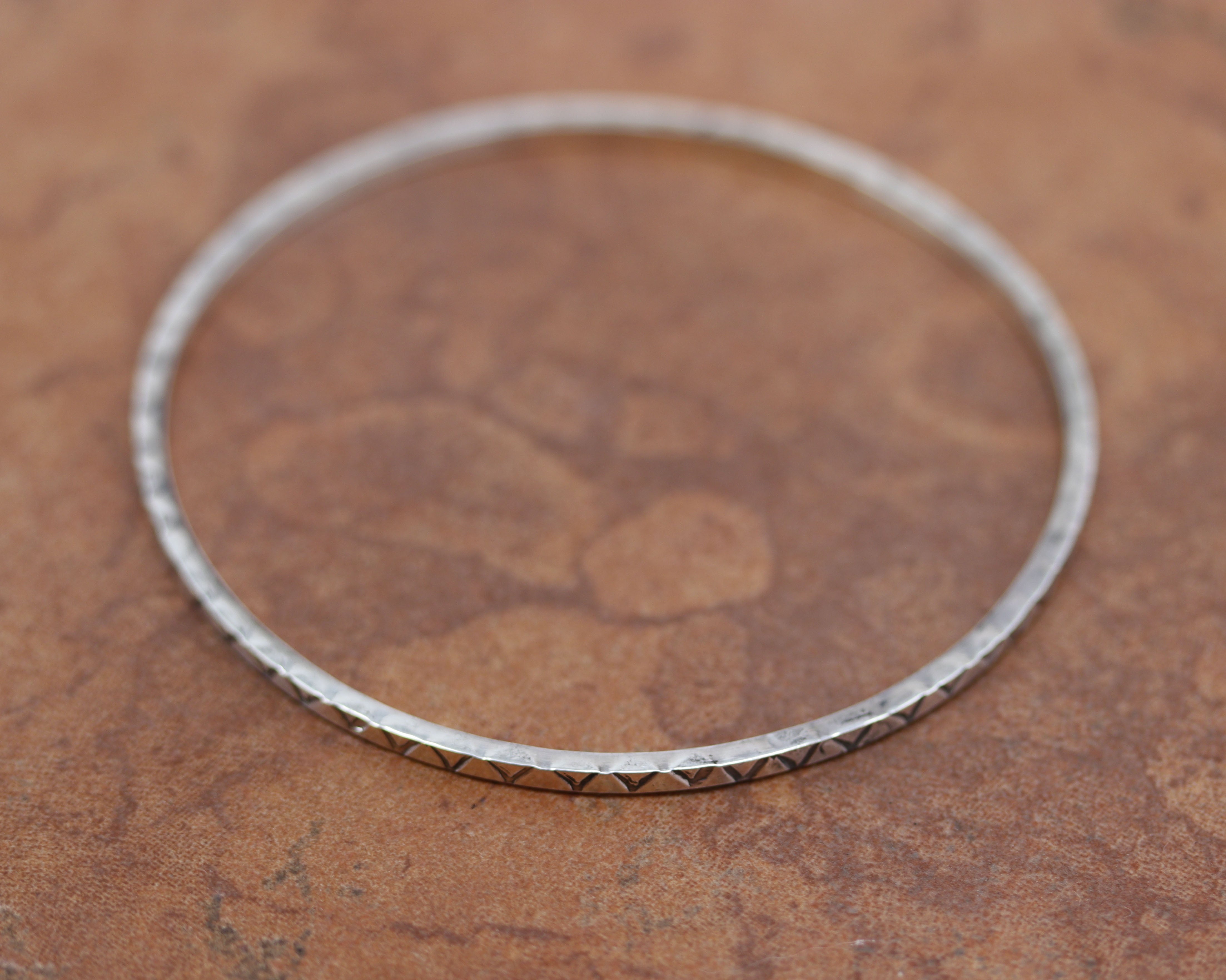 Navajo Native American bracelet by Elaine Tahe. It is made from sterling silver. It is about 8" around and about 1/8" wide at the widest point.