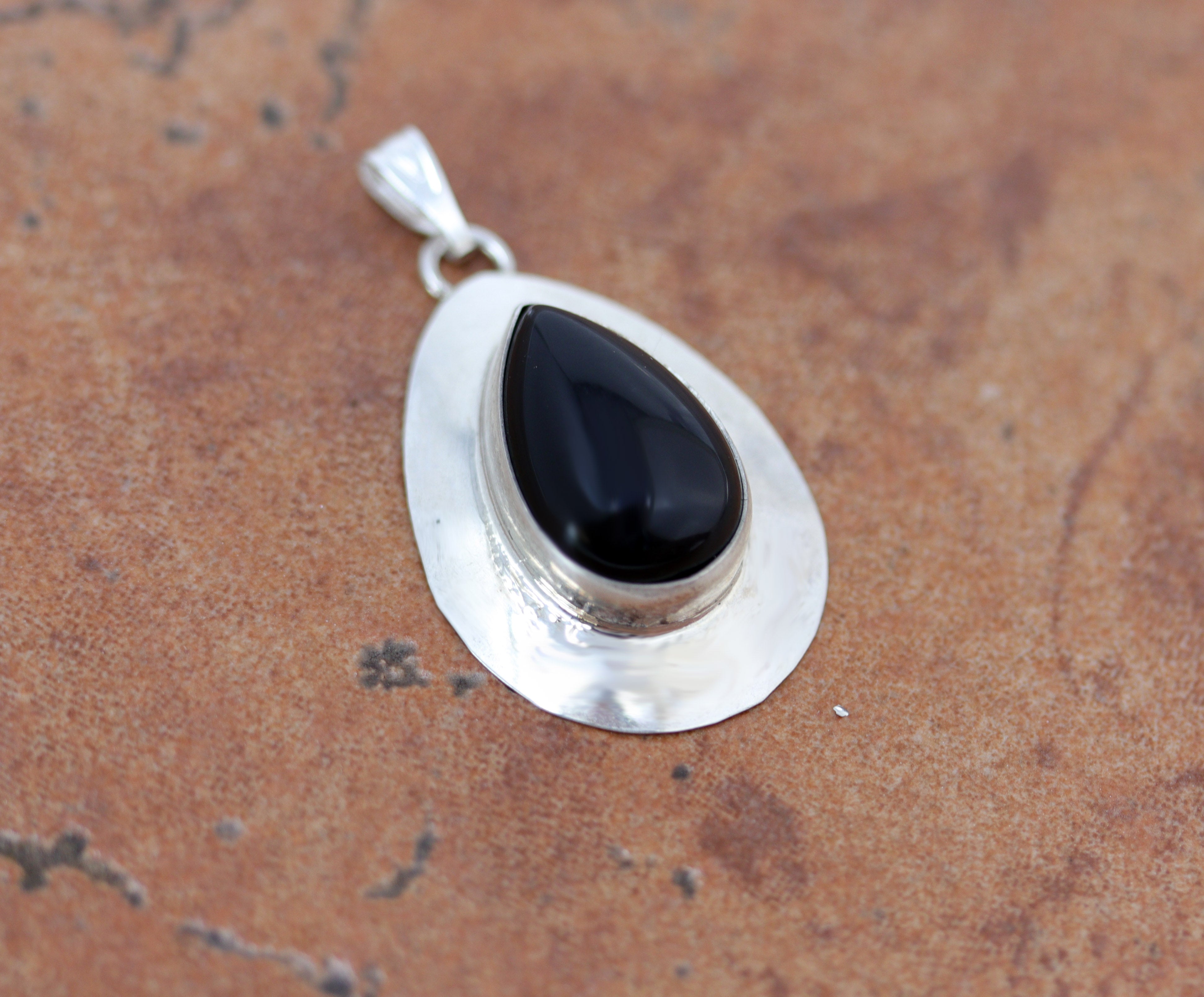 It is made from sterling silver and onyx. The pendant is about 1 1/4" in length and 3/4" in width.