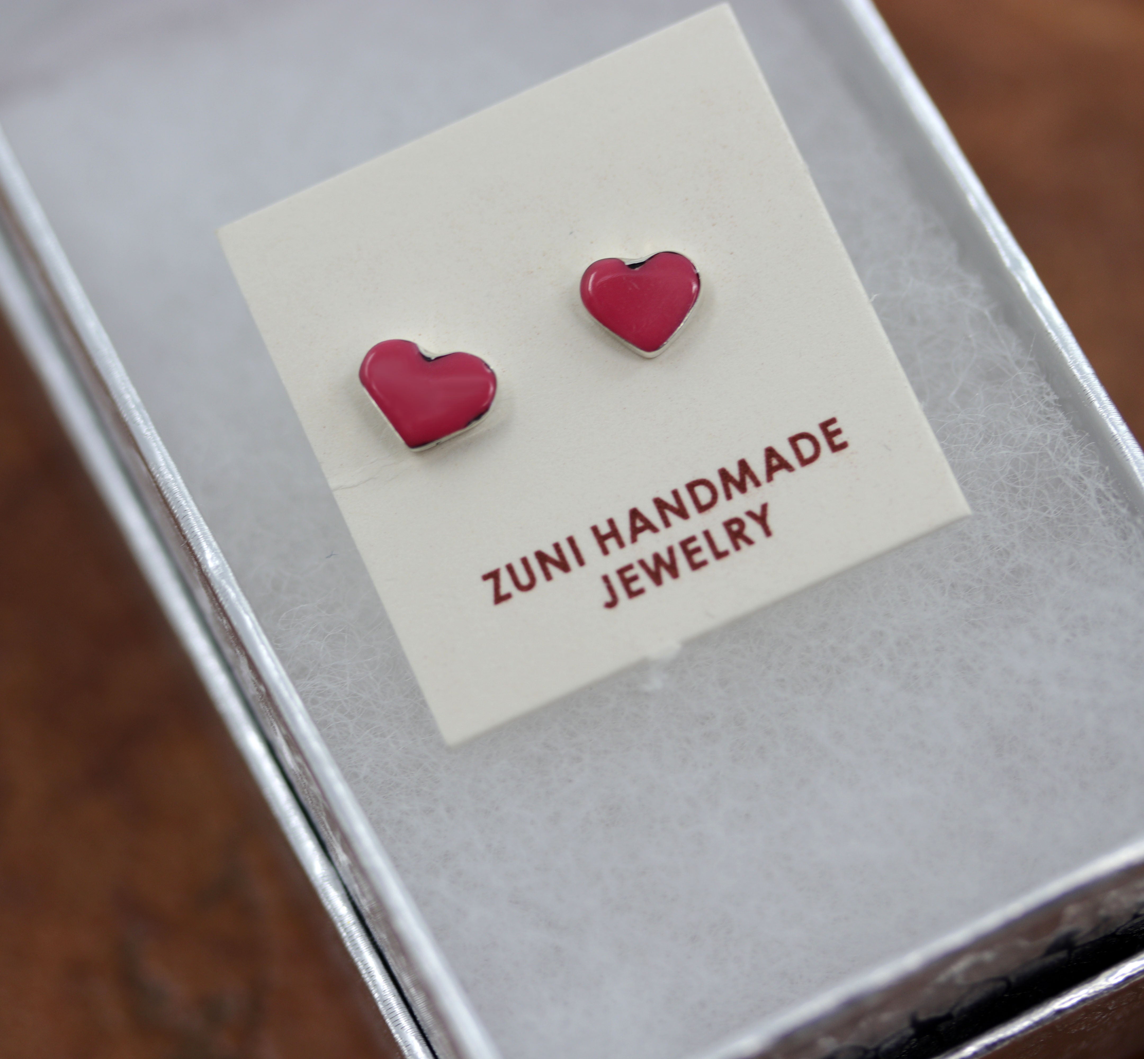 Beautiful Navajo stud heart earrings. They are made from sterling silver and pink quartz. Each earring is 1/4" in length, and about 1/4" in width.