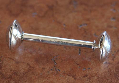 A brand new Navajo Native American rattle. The rattle is made from sterling silver. It measures 2 7/8" in length, and 1" in width at the widest point. This item is stamped Sterling.