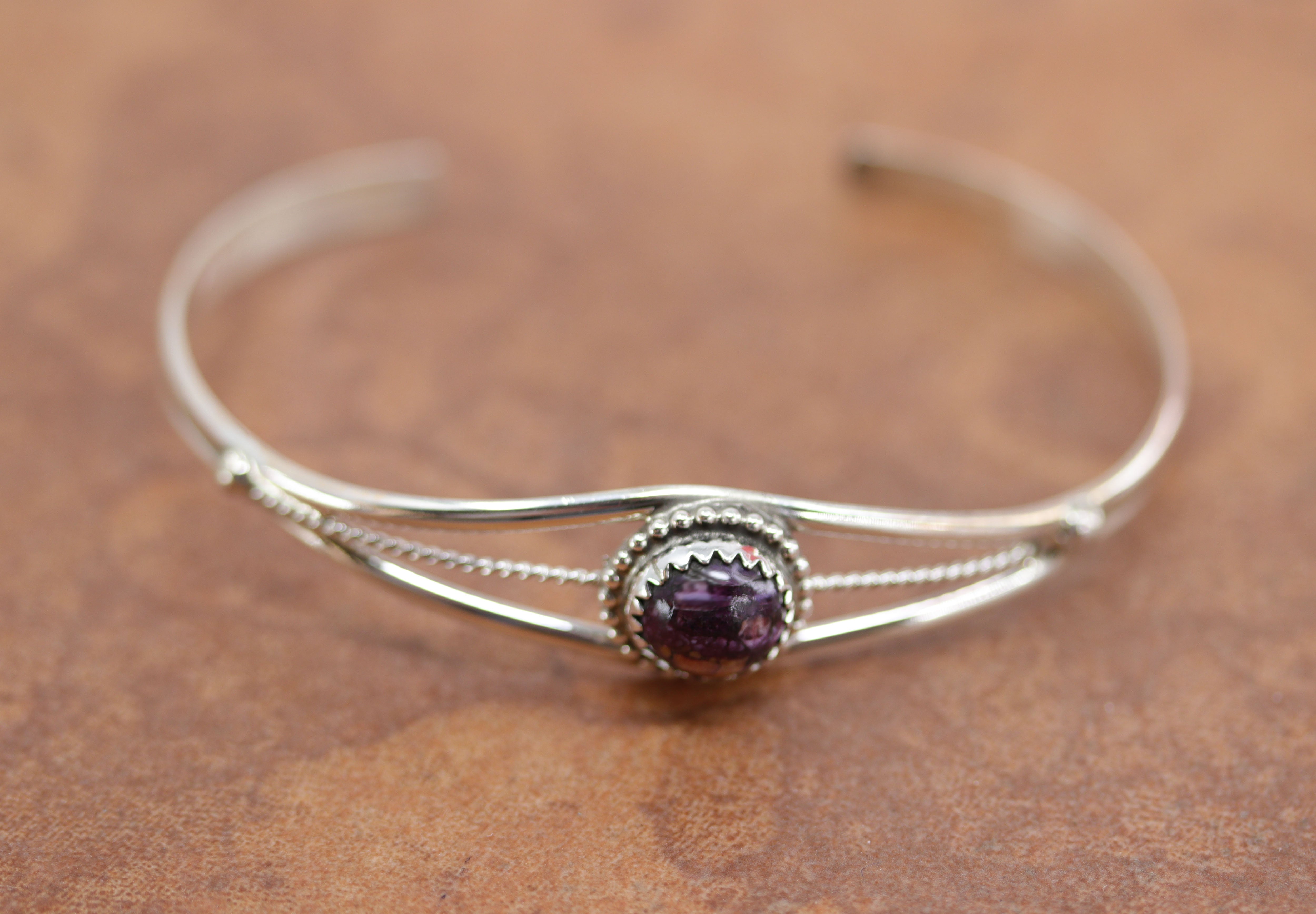 Beautiful Navajo Native American bracelet by Esther White. It is made from sterling silver and purple spiny oyster. It is about 5 1/4" around and 5/8" wide. The opening is about 1", and it is partly flexible.