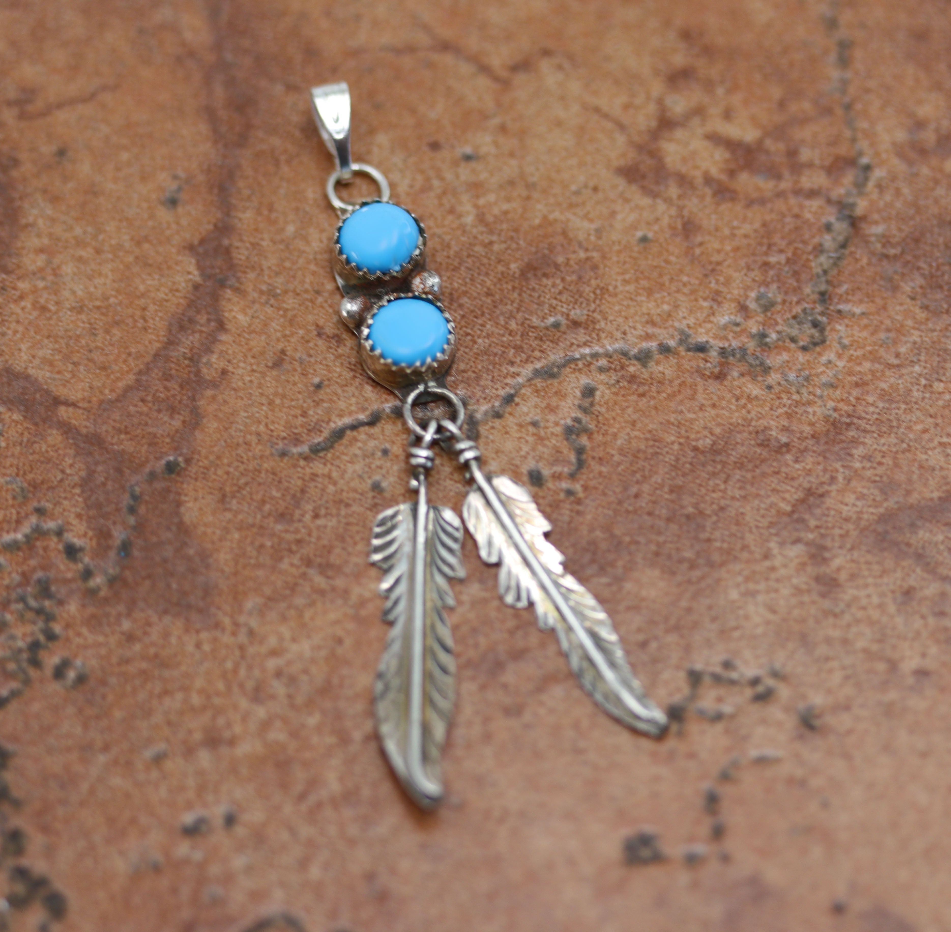 Beautiful Navajo Native American Feather Pendant. It is made from sterling silver and turquoise. It is 2 3/8" long and about 5/16" wide.