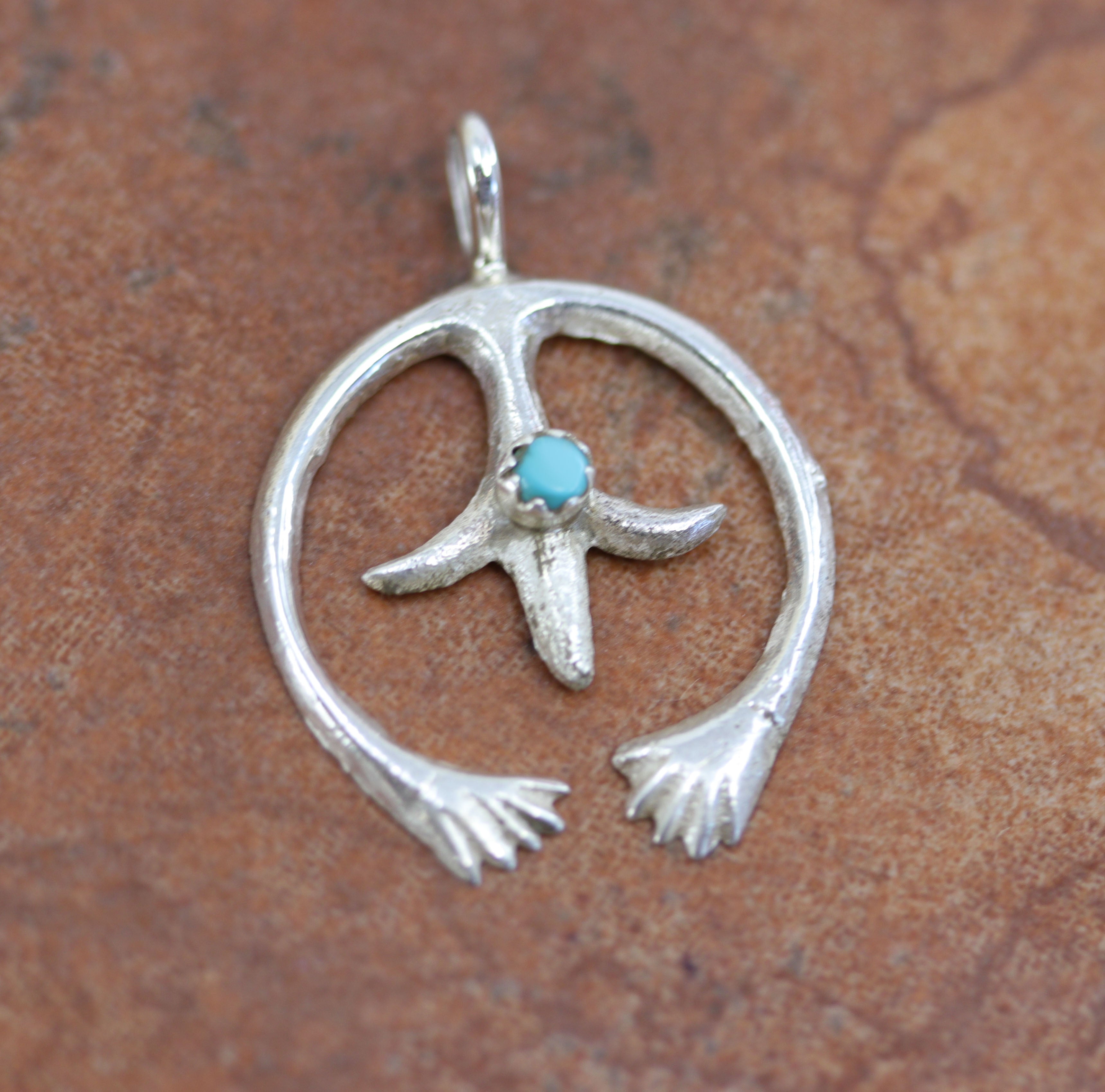 A beautiful Navajo Native American Pendant. It is made from sterling silver and turquoise. It is 1 1/4" long and about 1" wide.
