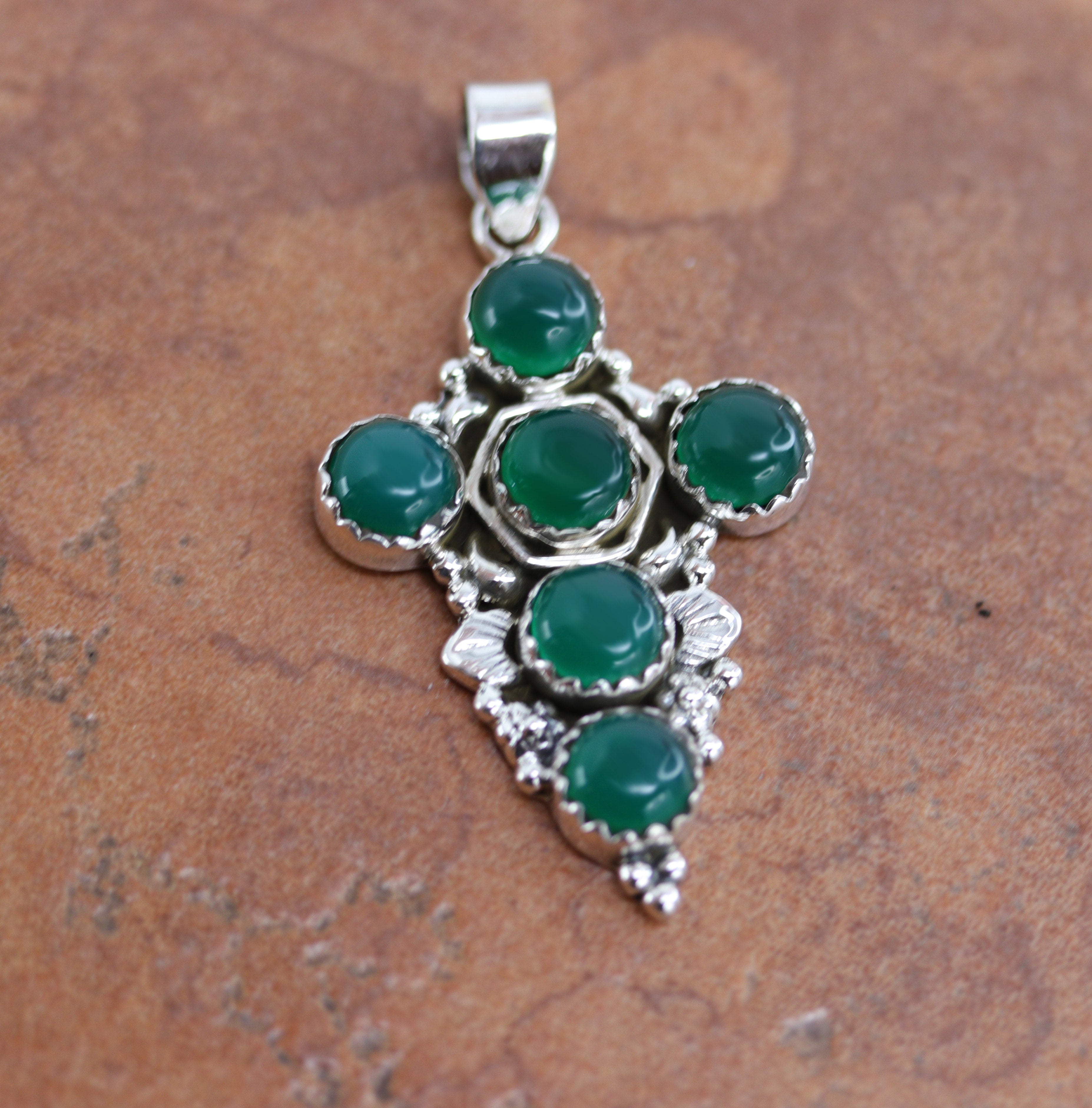 It is made from Sterling Silver and green onyx. It is about 2" in length including the bail, and about 1 1/8" in width. This item is not Native American.