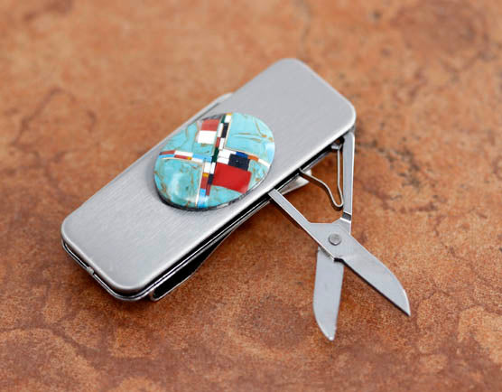 It is made from sterling silver. The lower part of the money clip is made from nickel to give it more durability. It is about 2" in length and 1" wide. This item is not Native American.
