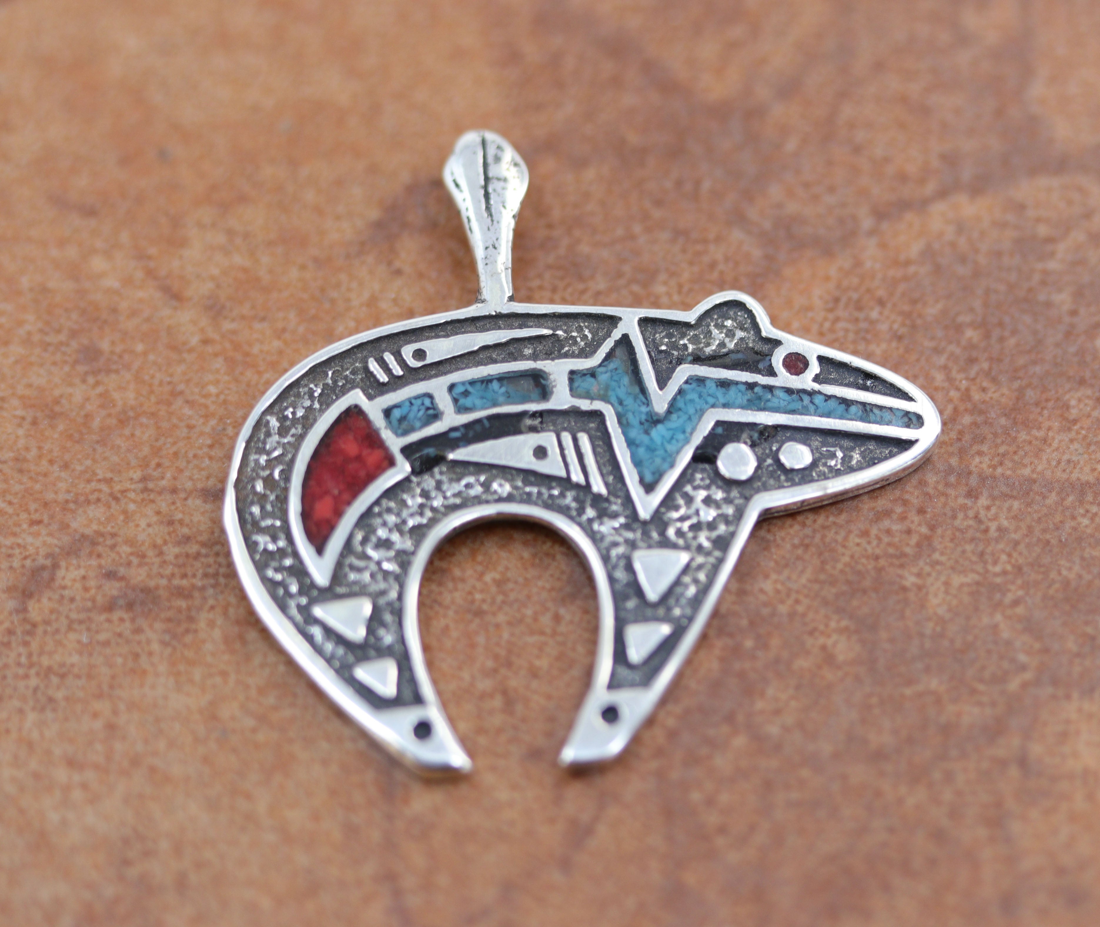 Wonderful pendant made from sterling silver, coral, and turquoise. It is 1 3/8" long and about 1 1/4" wide. This item is not Native American.
