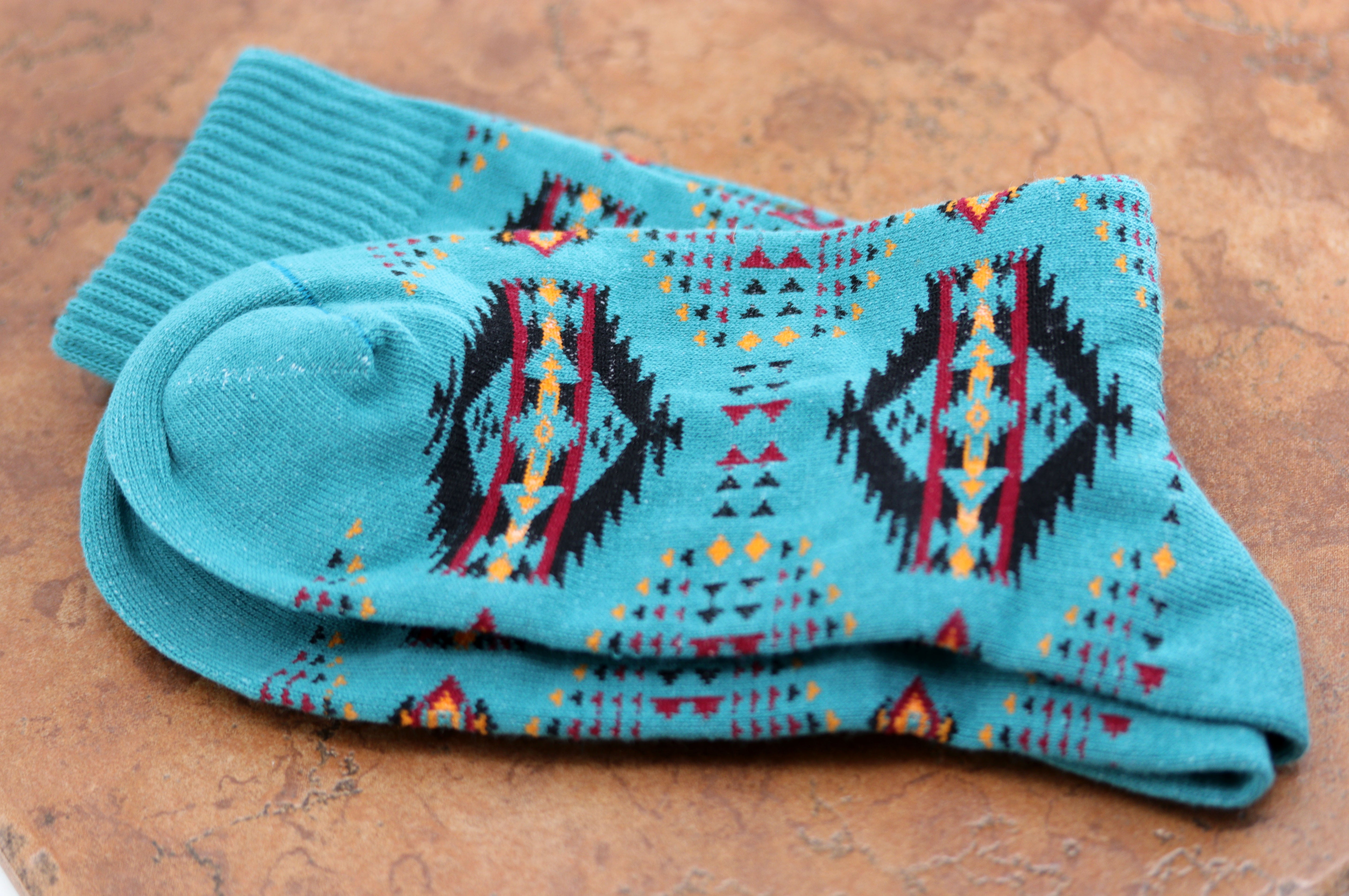 A beautiful, soft southwest pattern rug style socks. This item is not Native American.