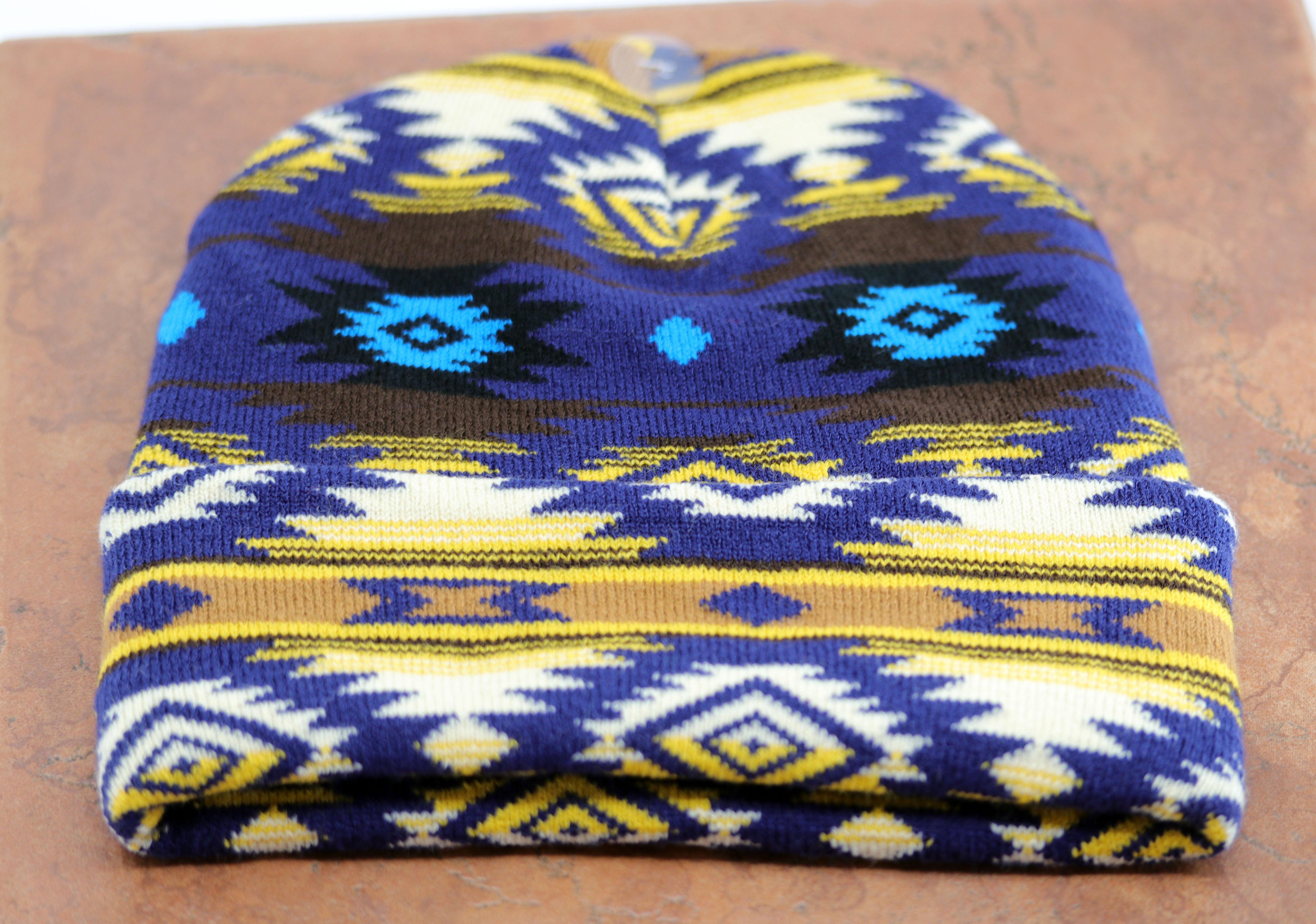 A beautiful, soft southwest pattern rug style beanie. It is made for adults. It is 95% acrylic and 5% spandex. This item is not Native American.