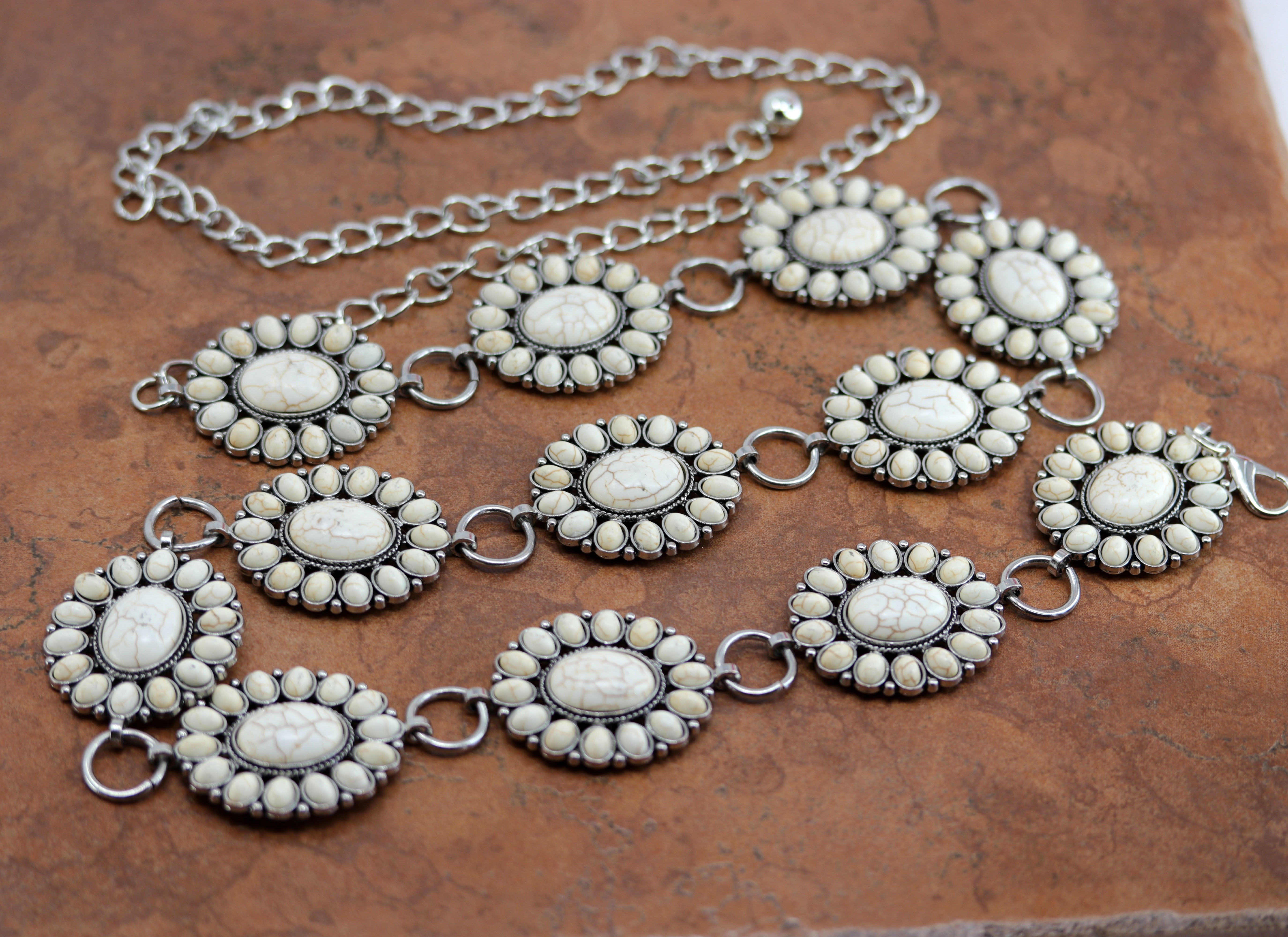 A beautiful fashion link belt made from zinc alloy and man made howlite. The belt measures 52" in length and 1 5/8" in width. This item is not Native American.