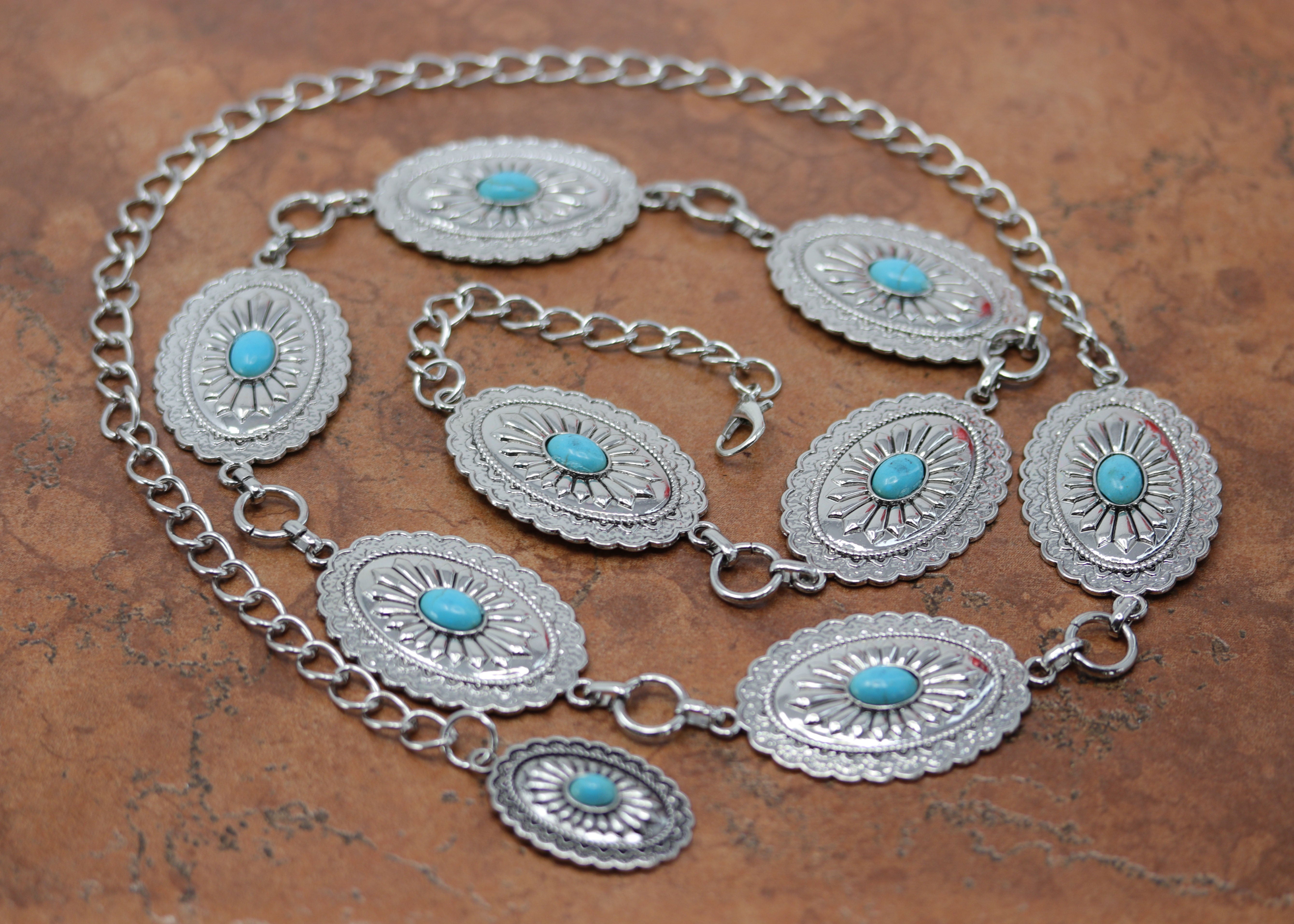 Unique link belt made from zinc alloy and man made turquoise. The belt measures 47" in length and 1 1/2" in width. The buckle measures 1 5/8" by 1 1/8". This item is not Native American.