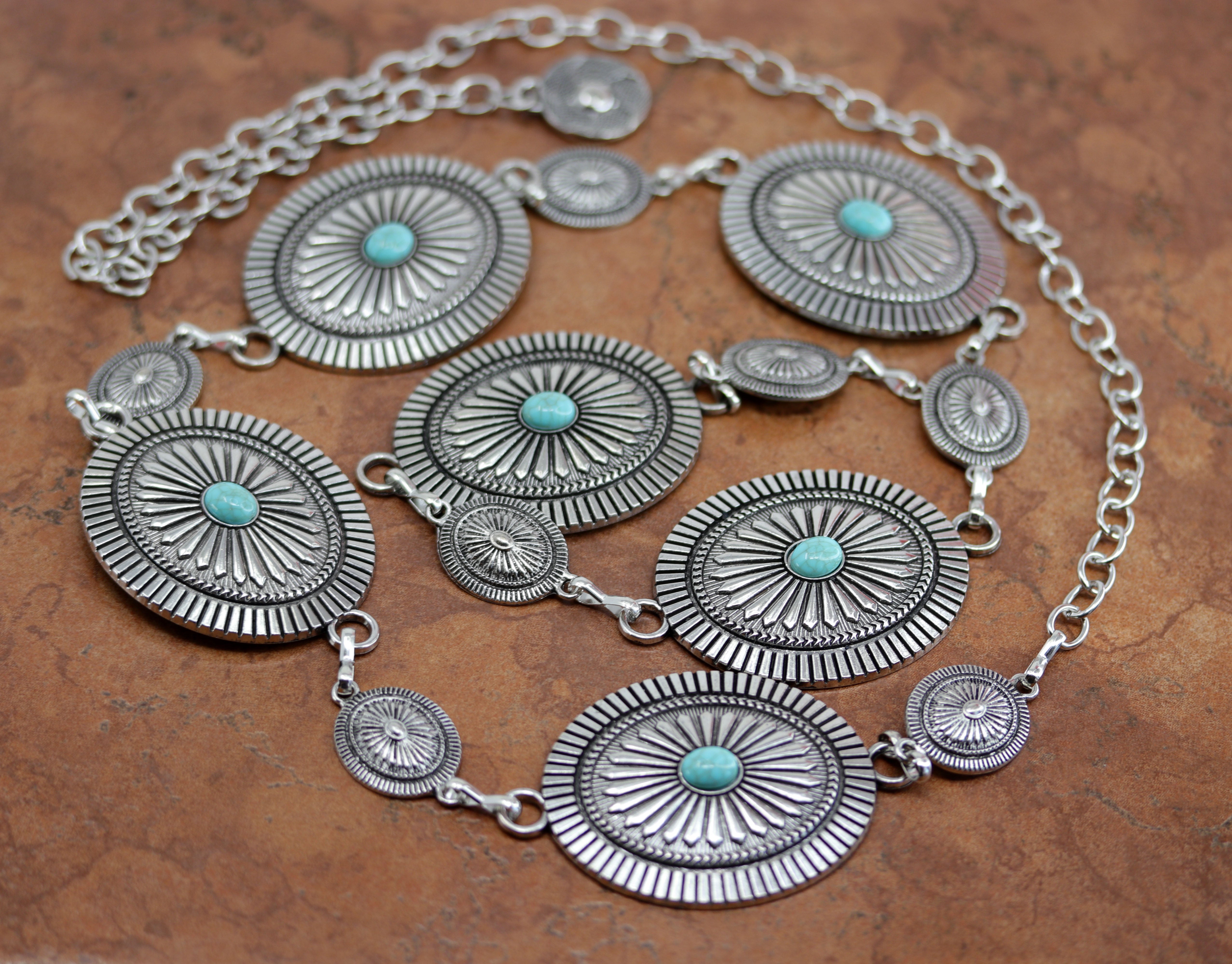 A beautiful fashion link belt made from zinc alloy and man made turquoise. The belt measures 53" in length and 2 1/8" in width (larger conchos). This item is not Native American.