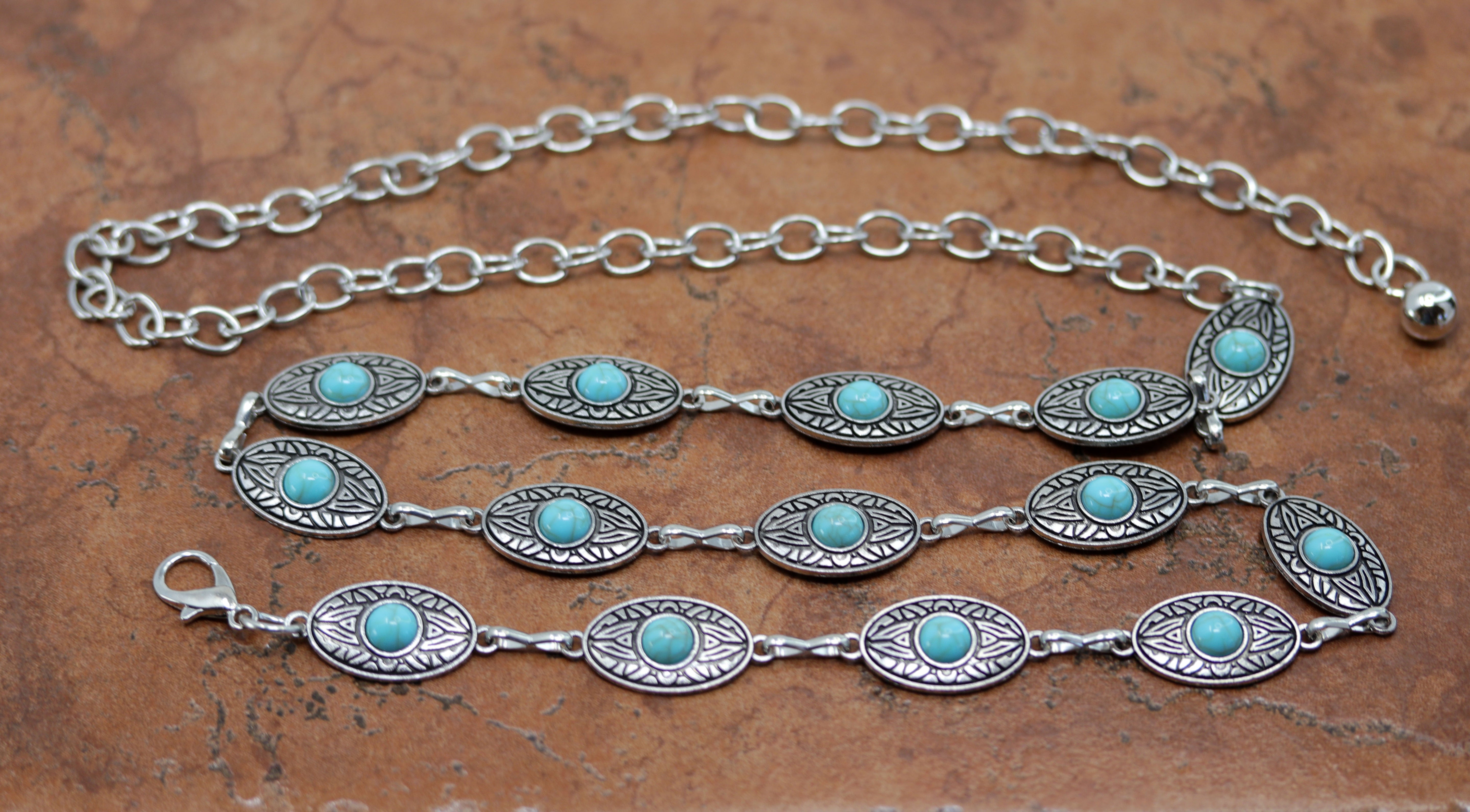 A beautiful fashion link belt made from zinc alloy and man made turquoise. The belt measures 43" in length and 3/4" in width (larger conchos). This item is not Native American.