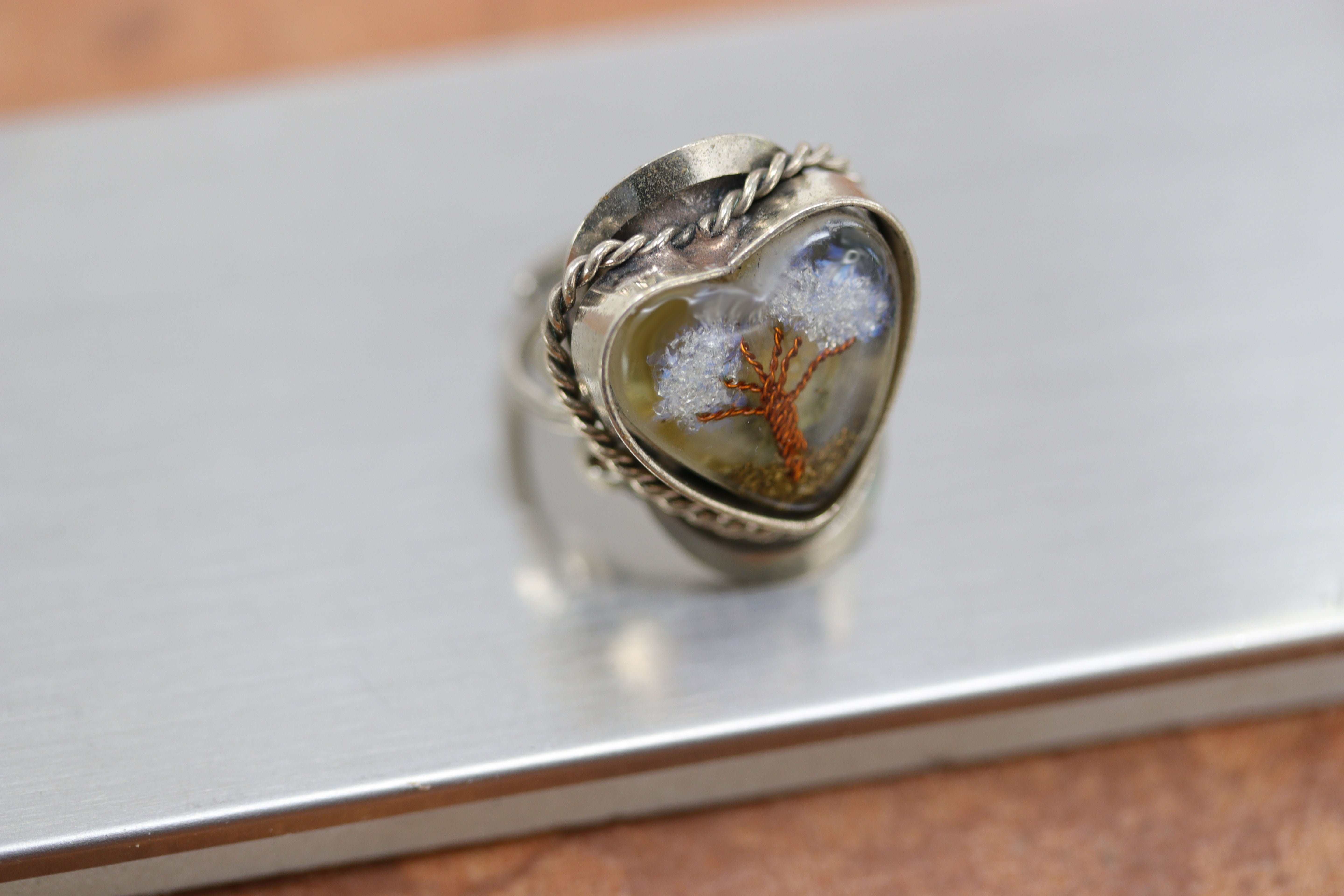 Beautiful ring made from Zinc Alloy and man made inlay. The ring size is 6-9 and it measures 1" in length. This item is not Native American.