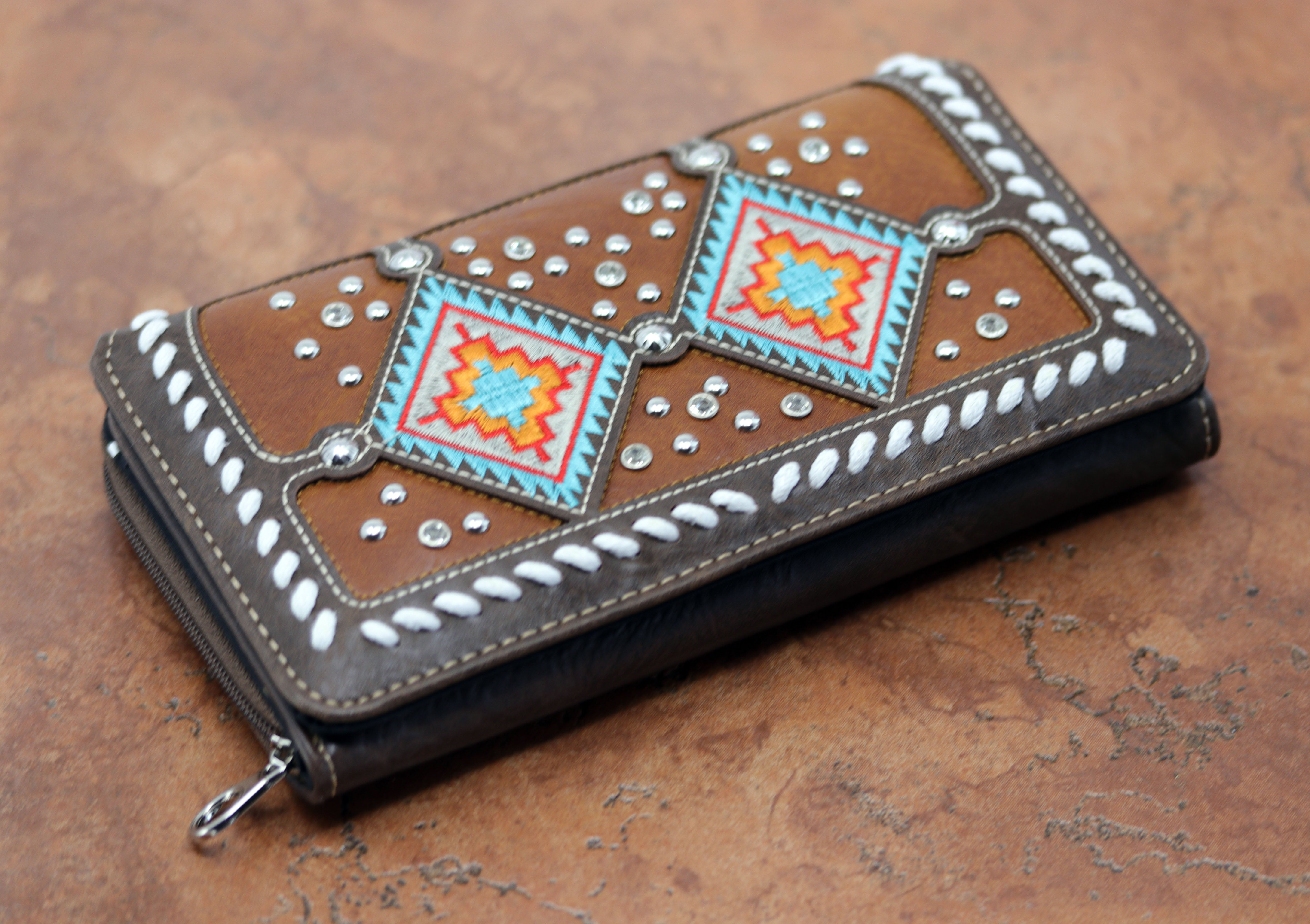 A beautiful, southwest pattern wallet. It is made from faux leather and man made turquoise. The bag measures 7 3/4" wide by 4 1/4" tall. This item is not Native American.