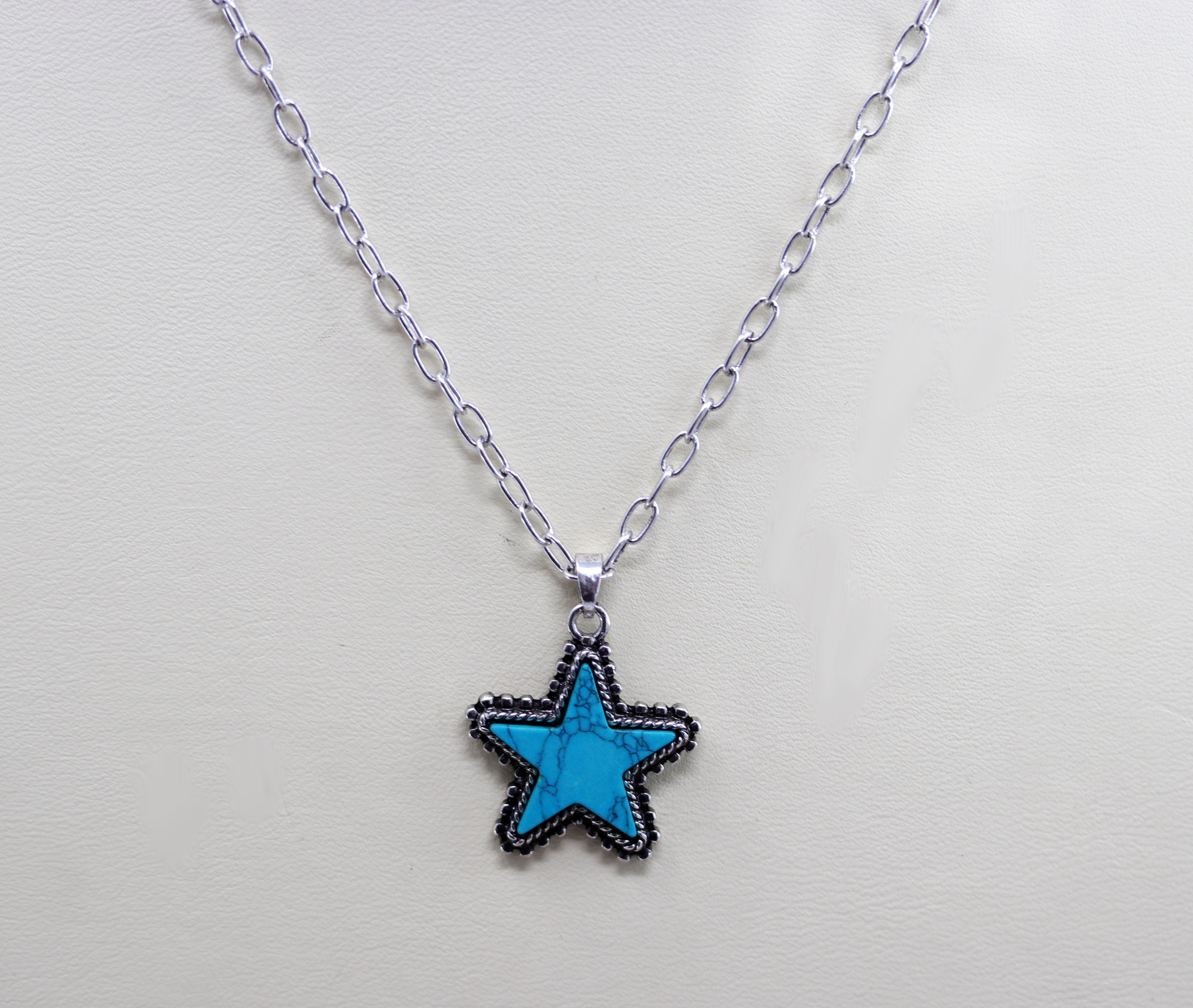 Beautiful necklace that is 18" in length plus the 3" extender. The pendant is 1 1/8" in length. It is made from zinc alloy and man made turquoise. This item is not Native American