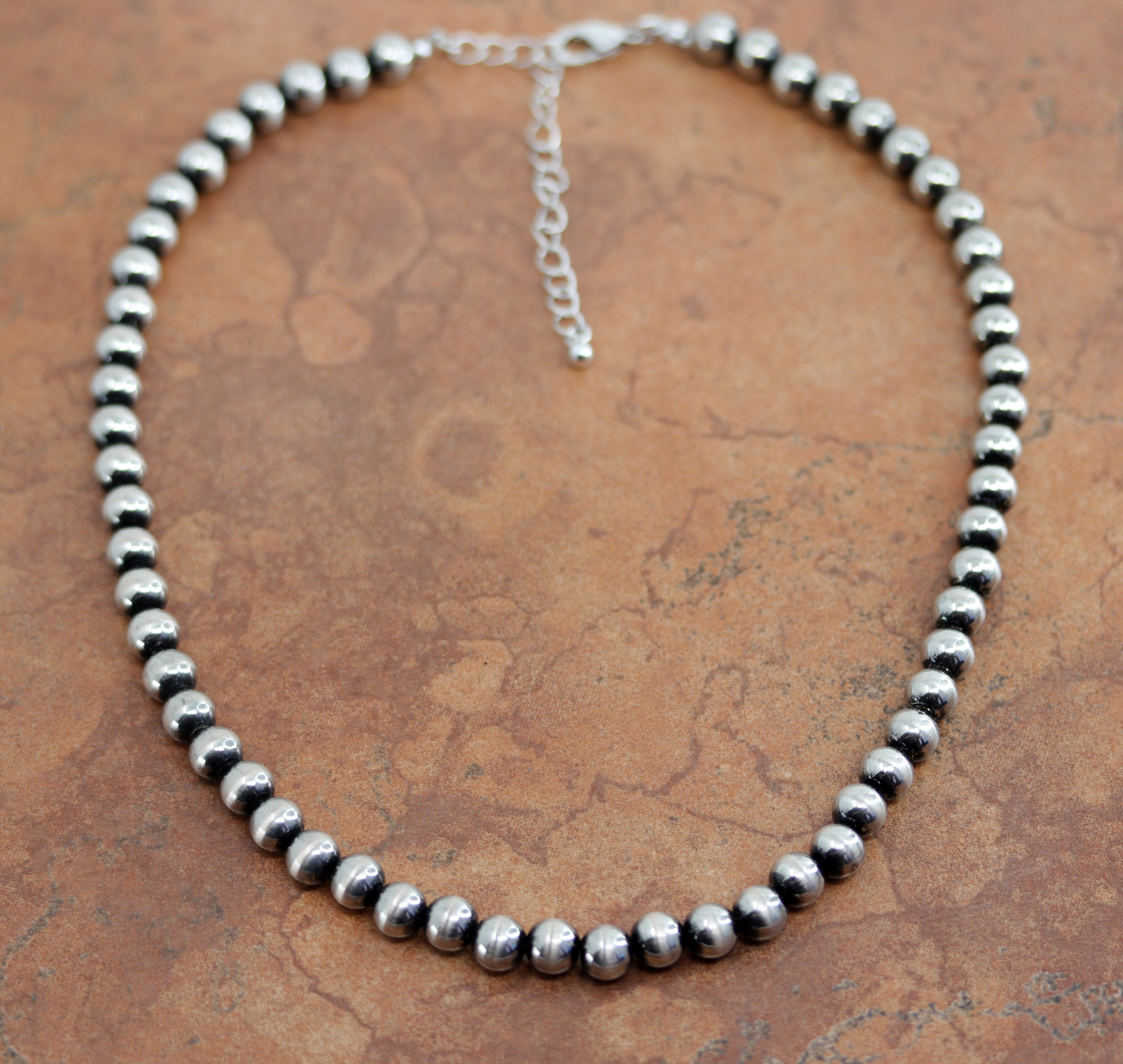 The necklace is 18" in length plus the 3" extender. The largest bead is 8 mm. It is made from zinc alloy. This item is not Native American.