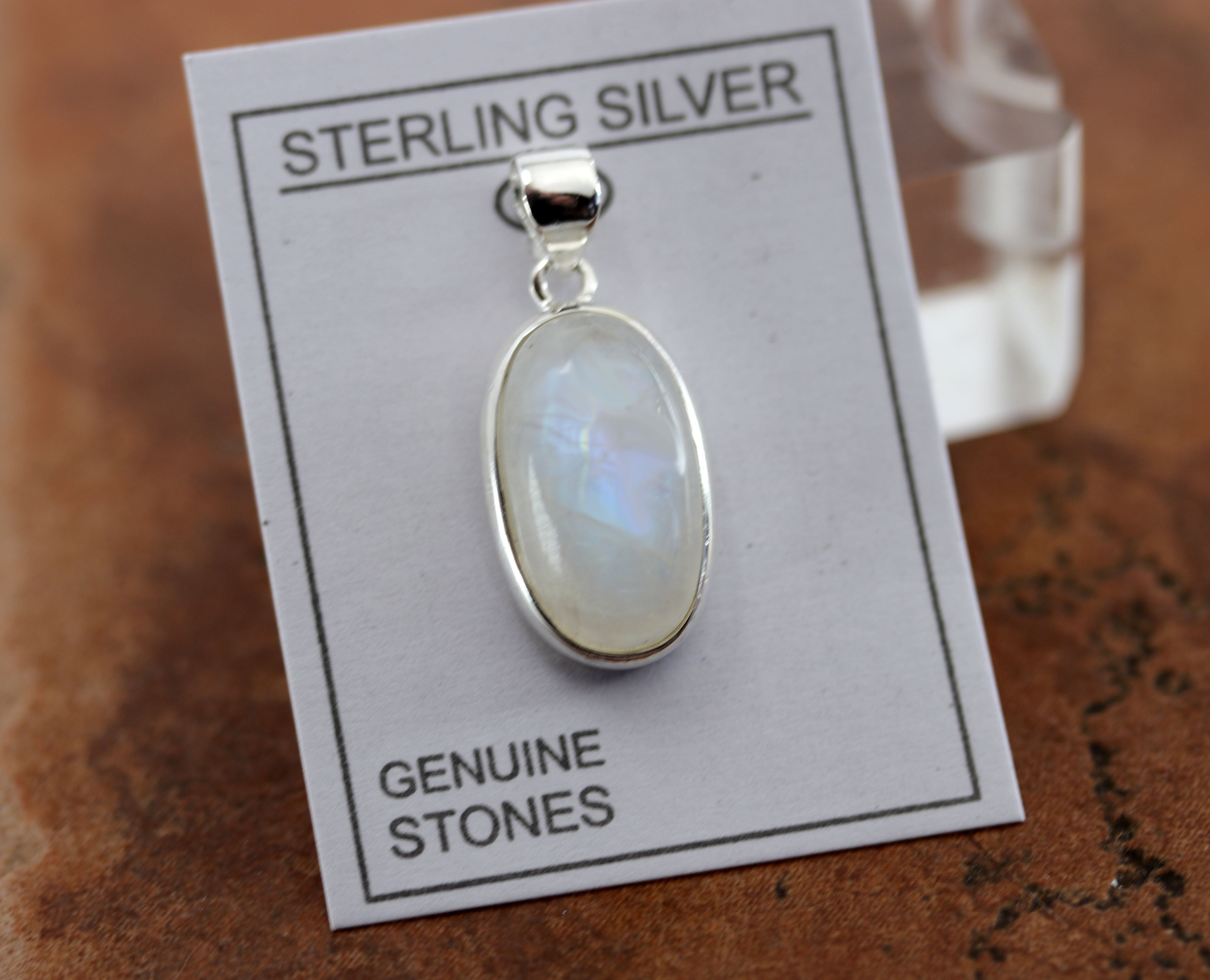 A beautiful oval pendant made from Sterling Silver and moonstone. It is about 1 3/8" in length including the bail, and about 3/4" in width. This item is not Native American.