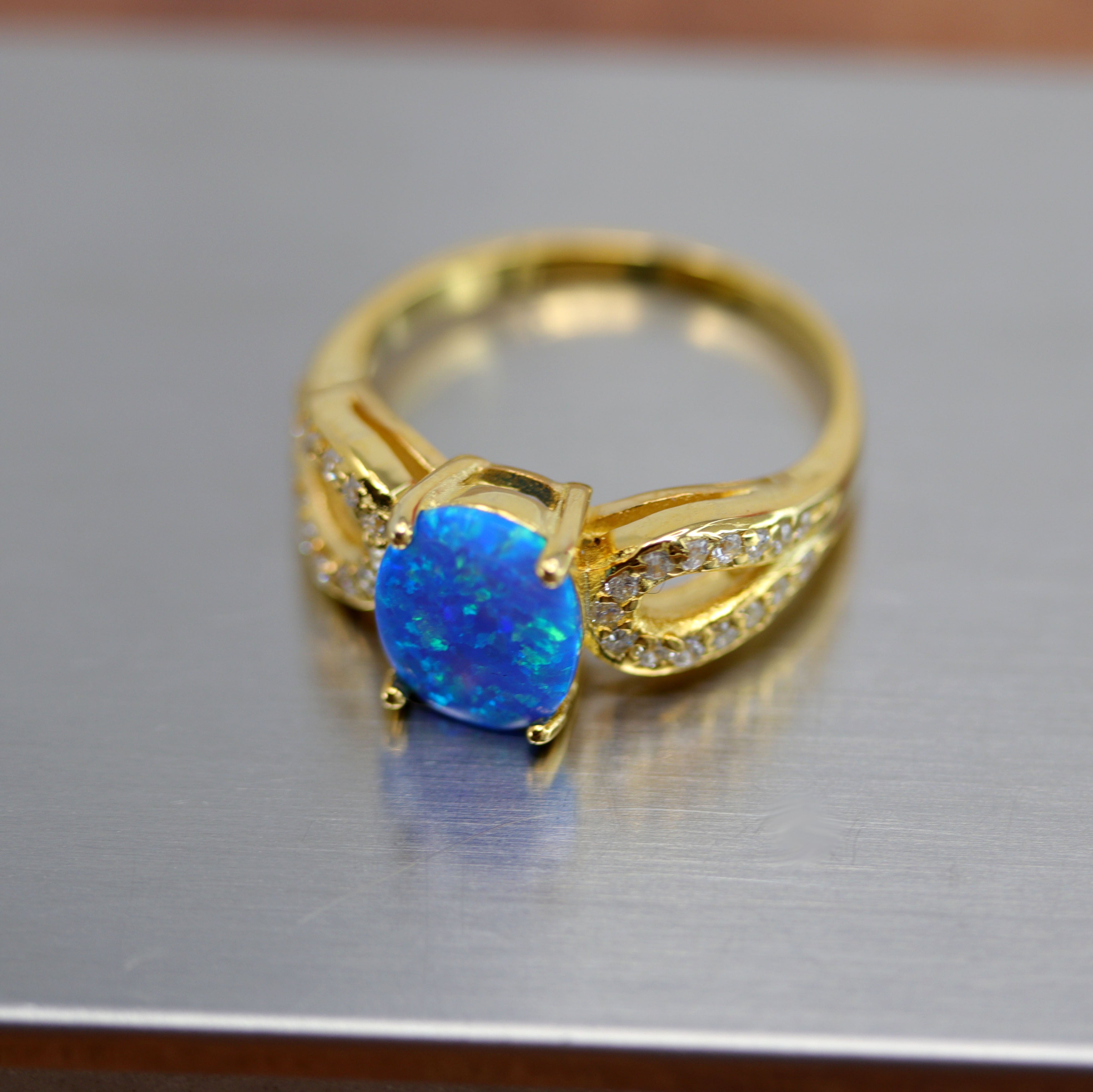A beautiful sterling siver gold overlay created opal ring with cubic zirconia accents. The ring size is 6 and it measures about 1/2" in length. This item is not Native American.