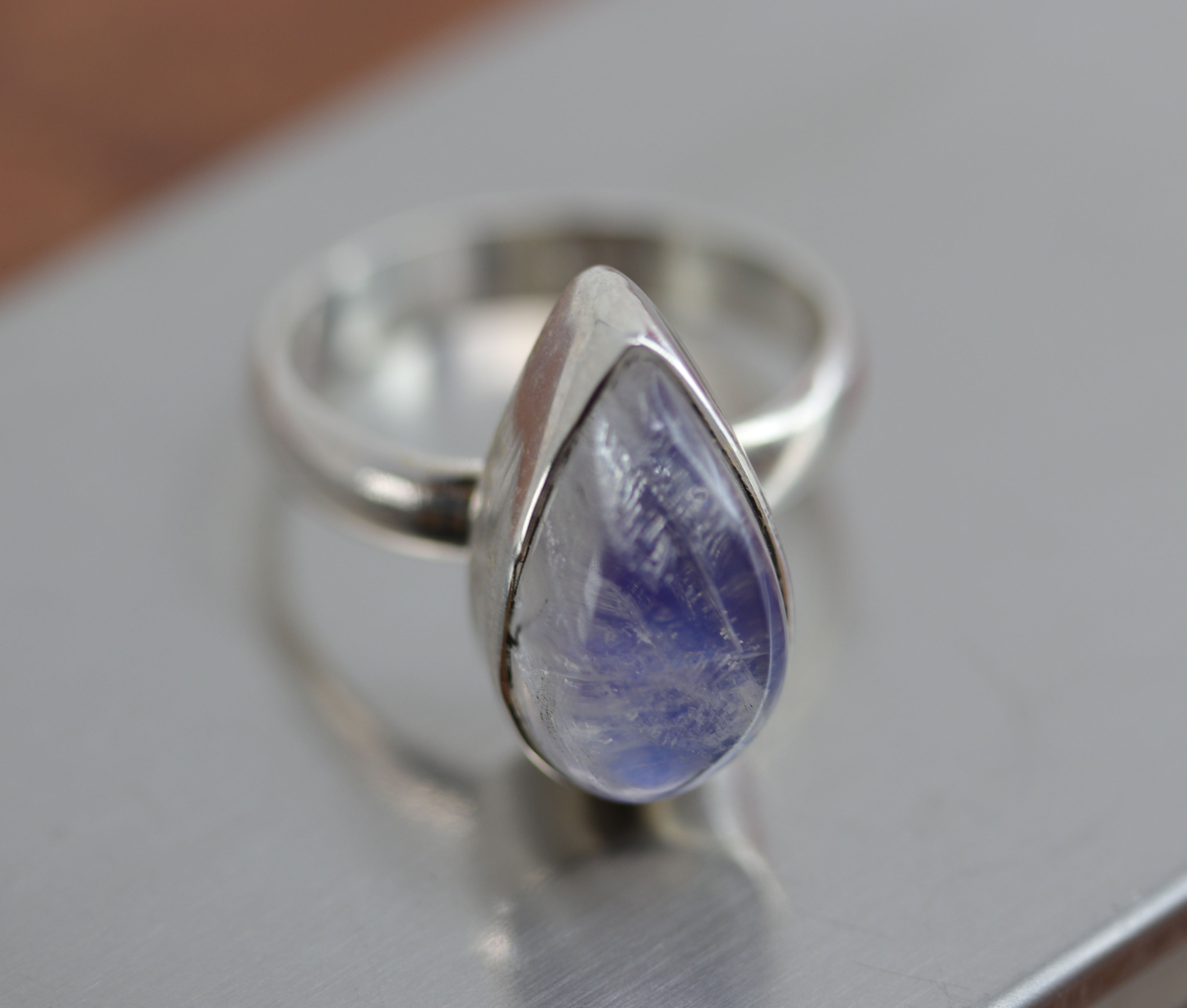 A beautiful Southwest Style gemstone ring made from sterling silver and labradorite. The ring size is 8 and it is 3/4" in length. This item is not Native American.