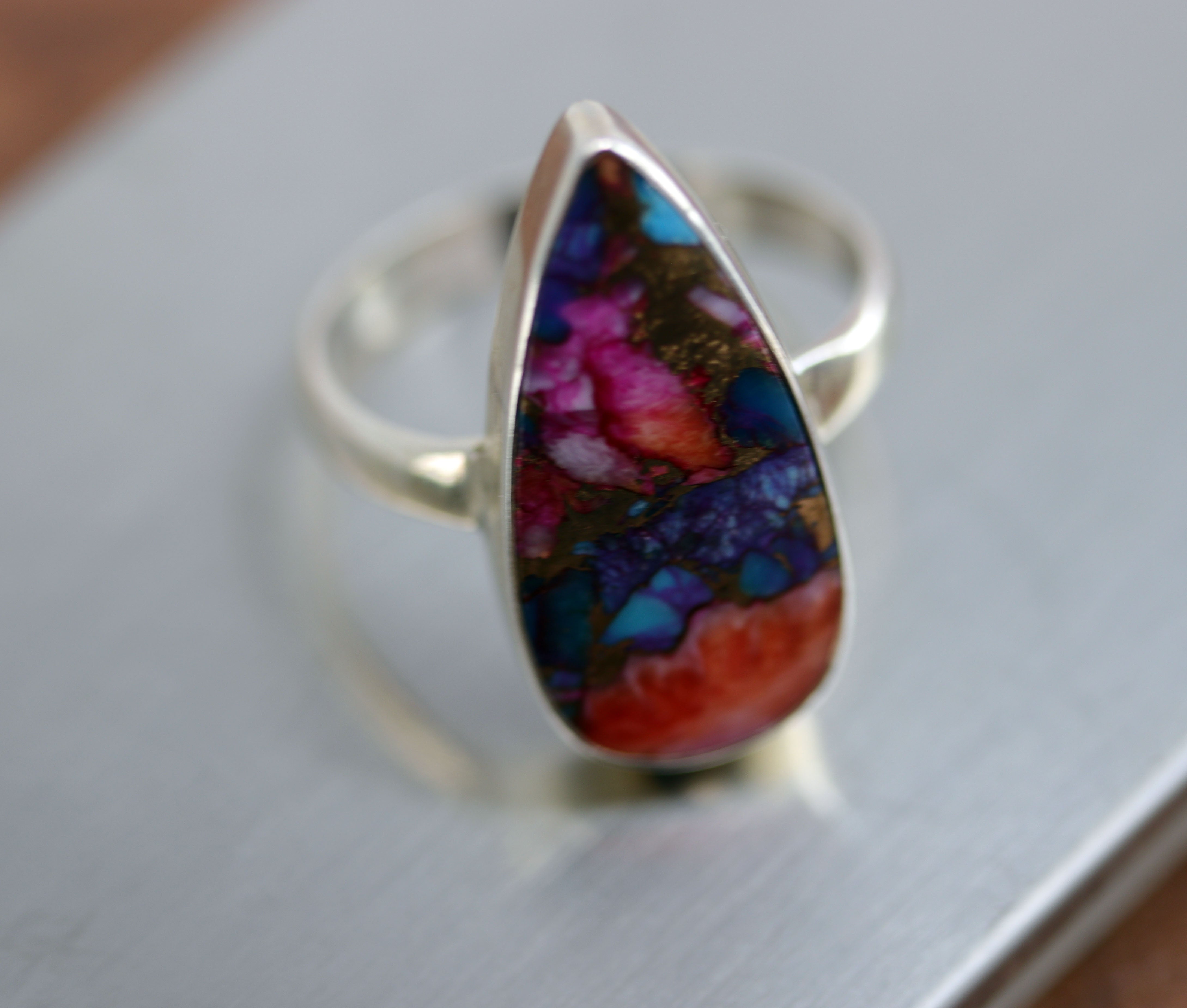 A beautiful Southwest Style gemstone ring made from sterling silver and mojave turquoise. The ring size is 8 1/2 and it is 1" in length. This item is not Native American.