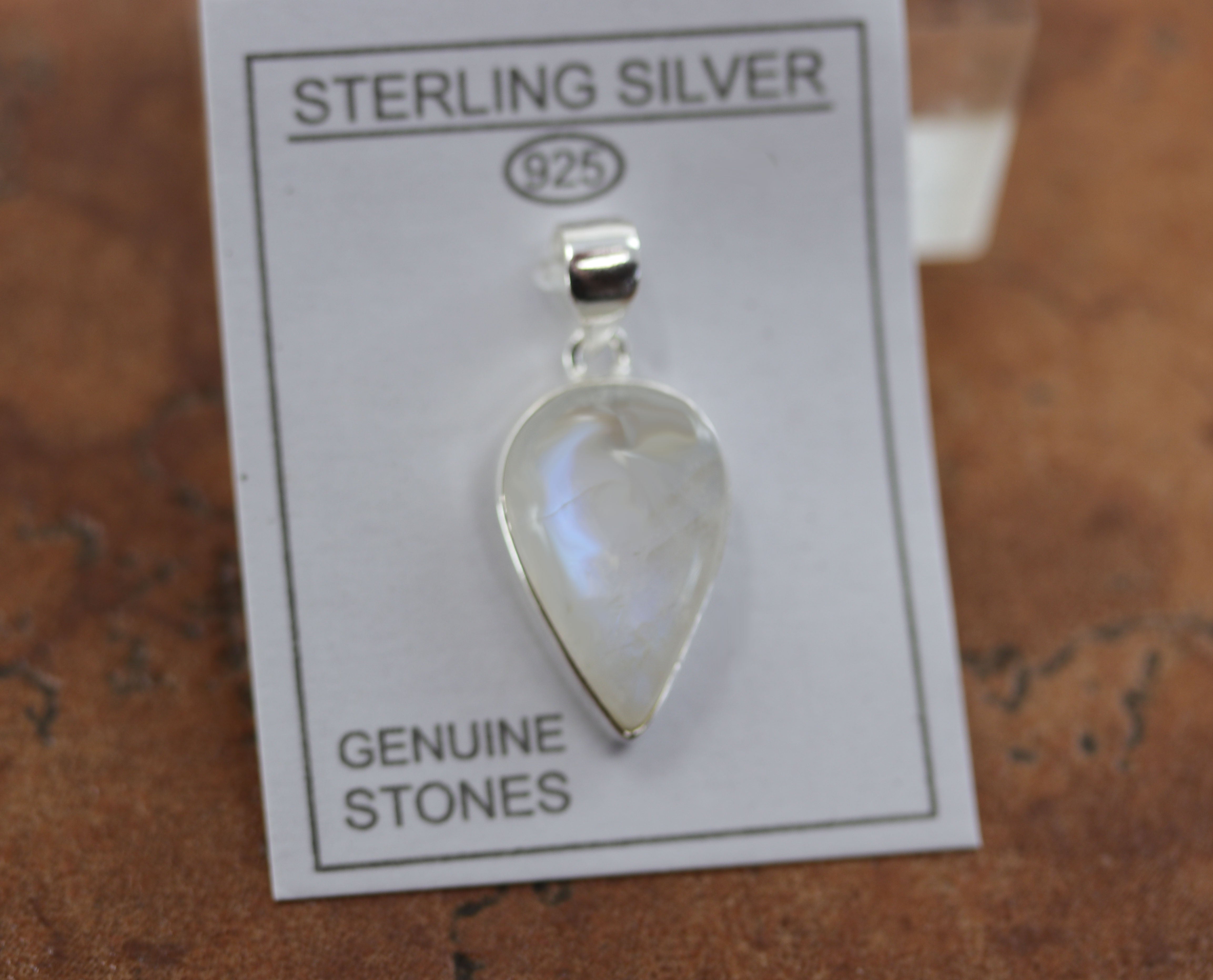 A beautiful oval pendant made from Sterling Silver and moonstone. It is about 1 3/8" in length including the bail, and about 5/8" in width. This item is not Native American.